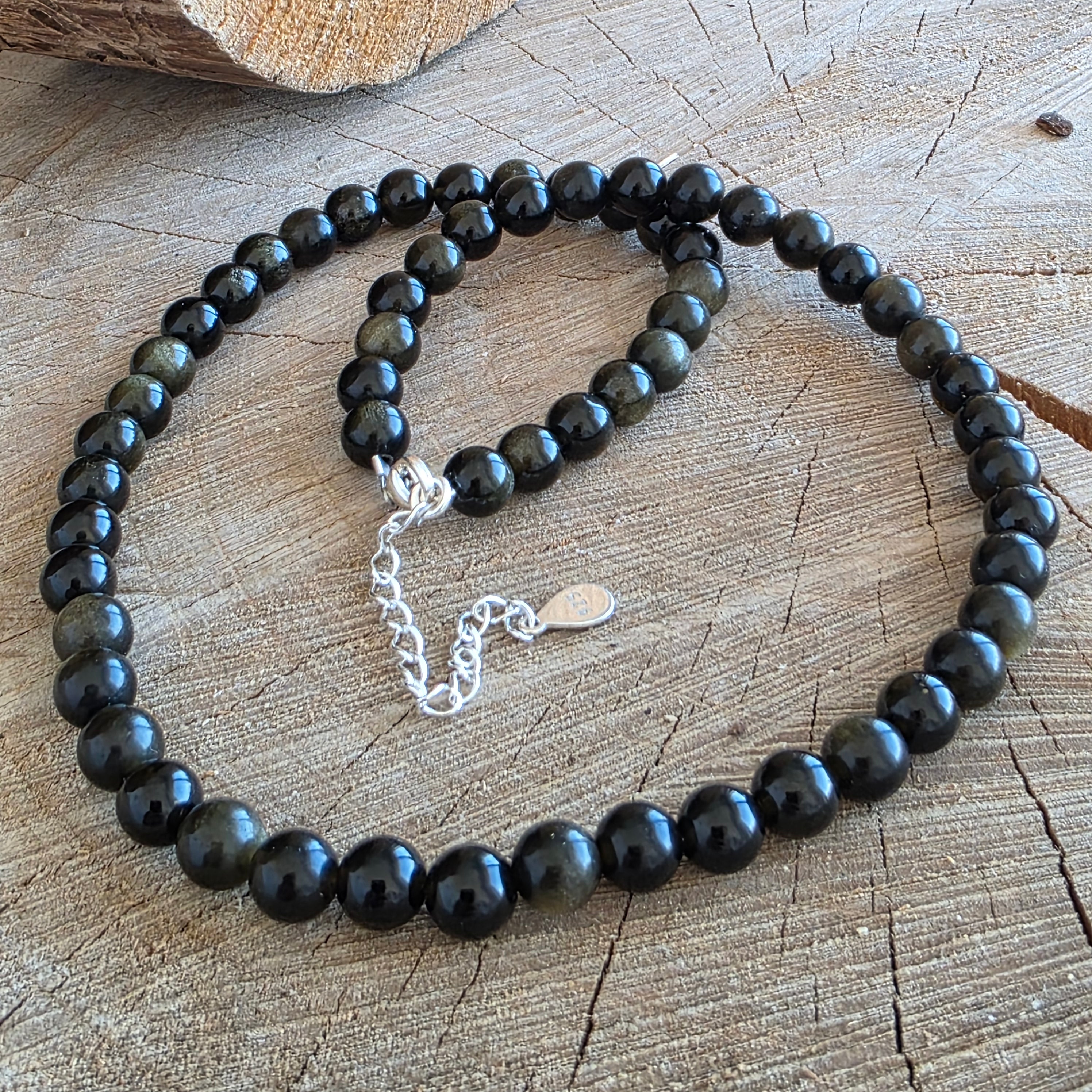 A fine and intense necklace, made from 8 mm black obsidian beads, creating a delicate yet well-defined line around the neck. The deep black, with its subtle glossy shine, catches the light in fine, almost graphic reflections, giving the jewelry a modern and balanced feel. The small size of the beads maintains the minimalist design, highlighting the purity of the form and visual clarity.