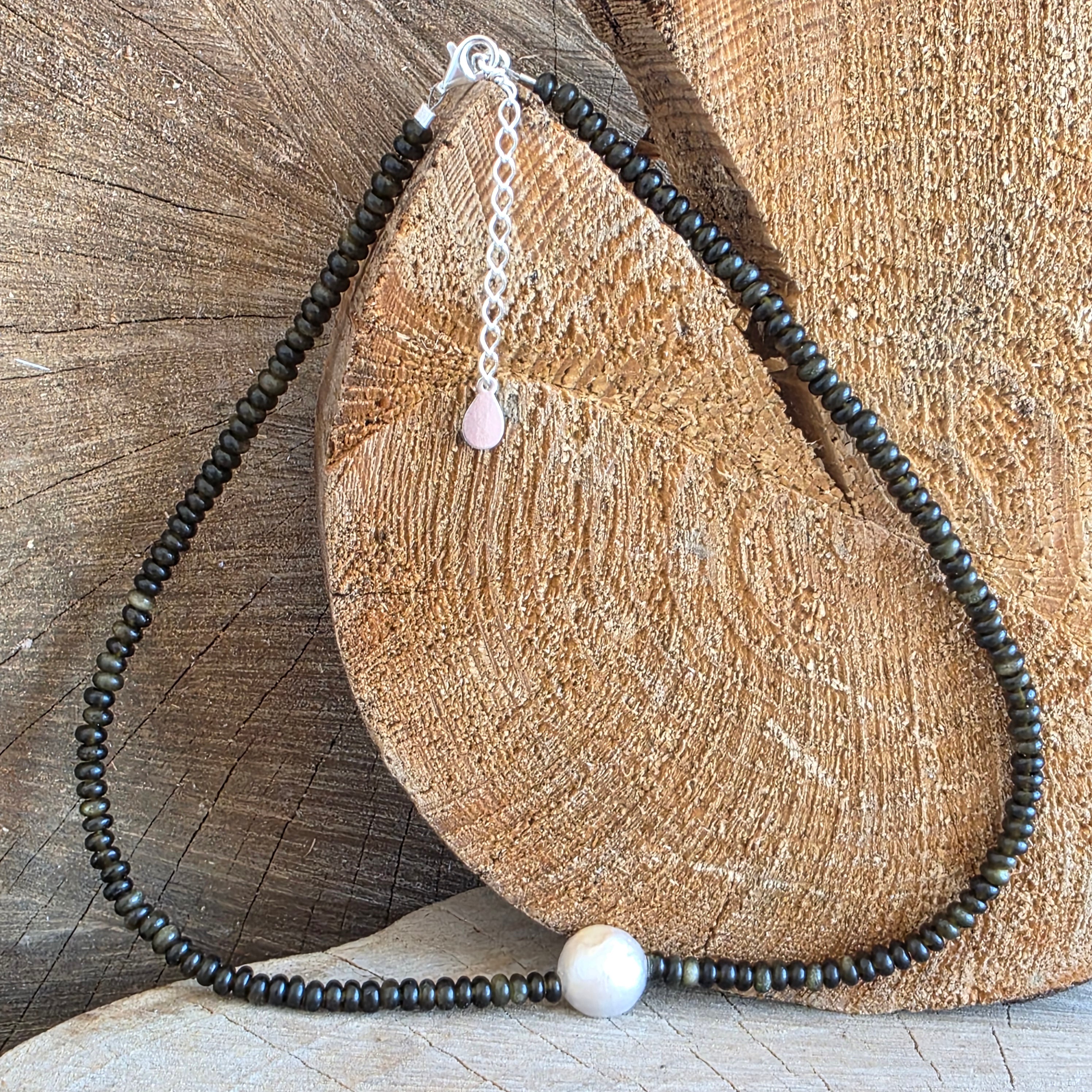 A necklace with an elegant and mysterious presence, made from 6 mm golden obsidian beads, which lay harmoniously around the neck, forming a balanced and flowing line. The deep black of the stone is crossed by subtle golden reflections that appear and disappear depending on light and movement, giving the jewelry depth and character. The spherical shape highlights the natural shine of the obsidian and creates a calm yet expressive visual continuity.