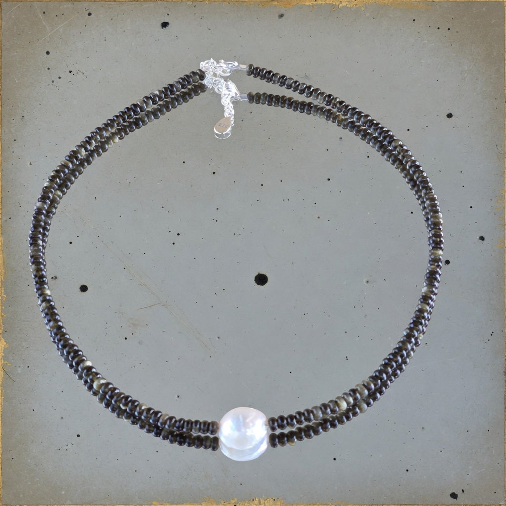 A necklace with a refined design and balanced contrast, made from fine 4 × 2 mm golden obsidian discs arranged in a fluid sequence that delicately outlines the neckline. The black surface, crossed by subtle golden reflections, creates an elegant play of light and depth, while the central pearl, about 1 cm in size, provides a bright and organic accent that visually balances the composition.