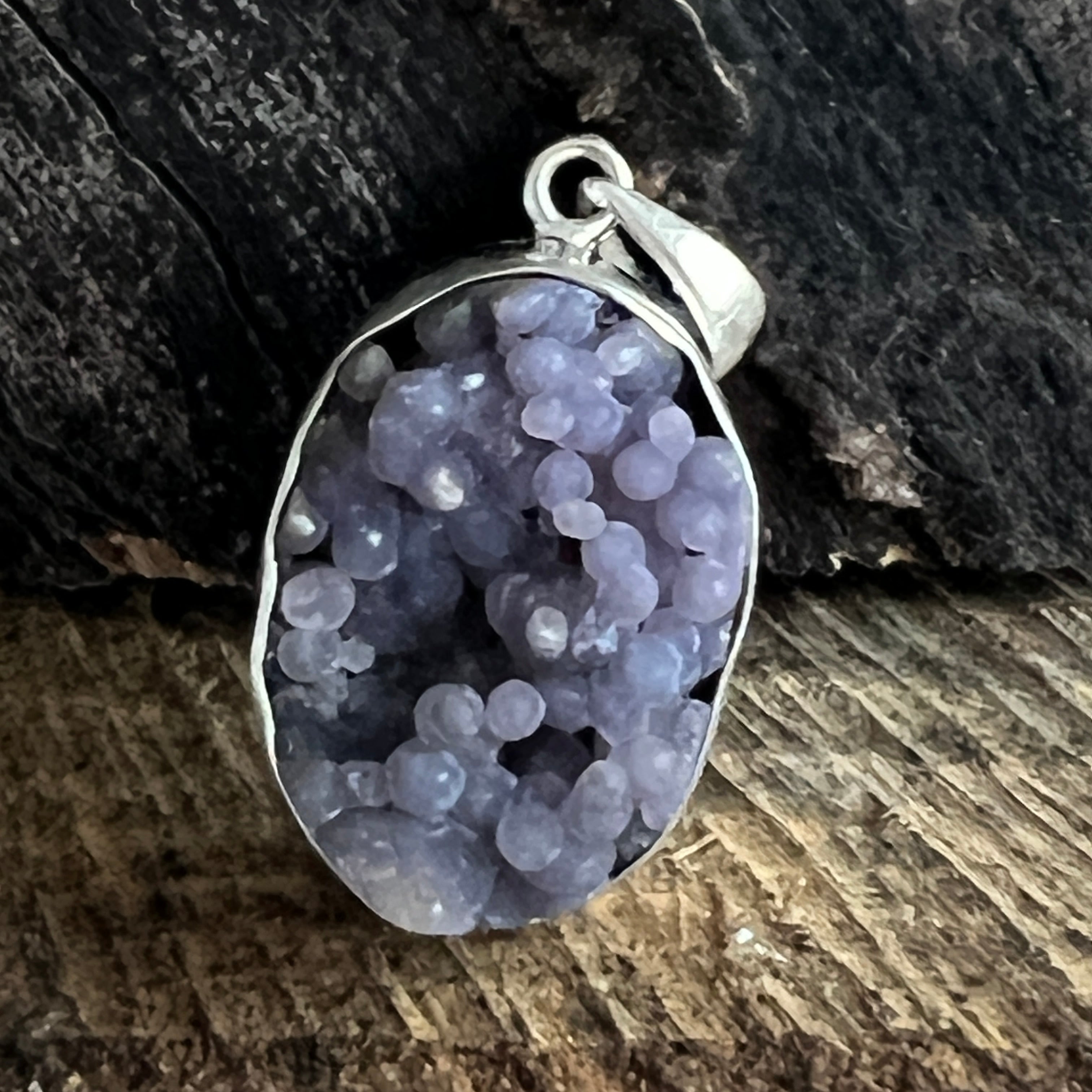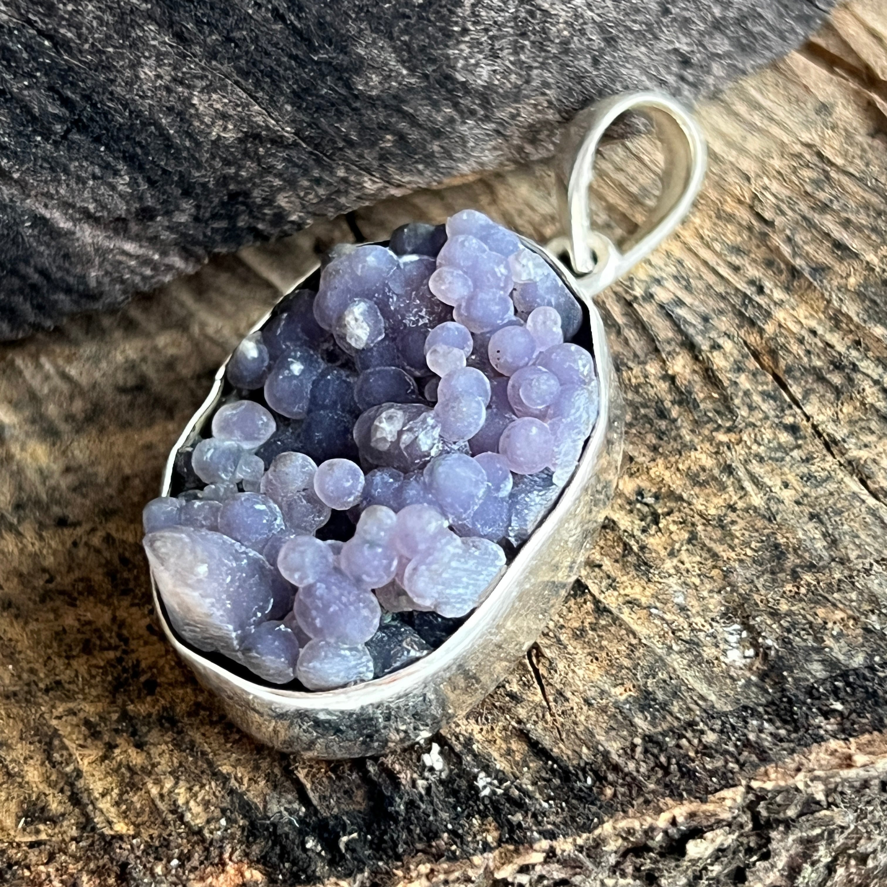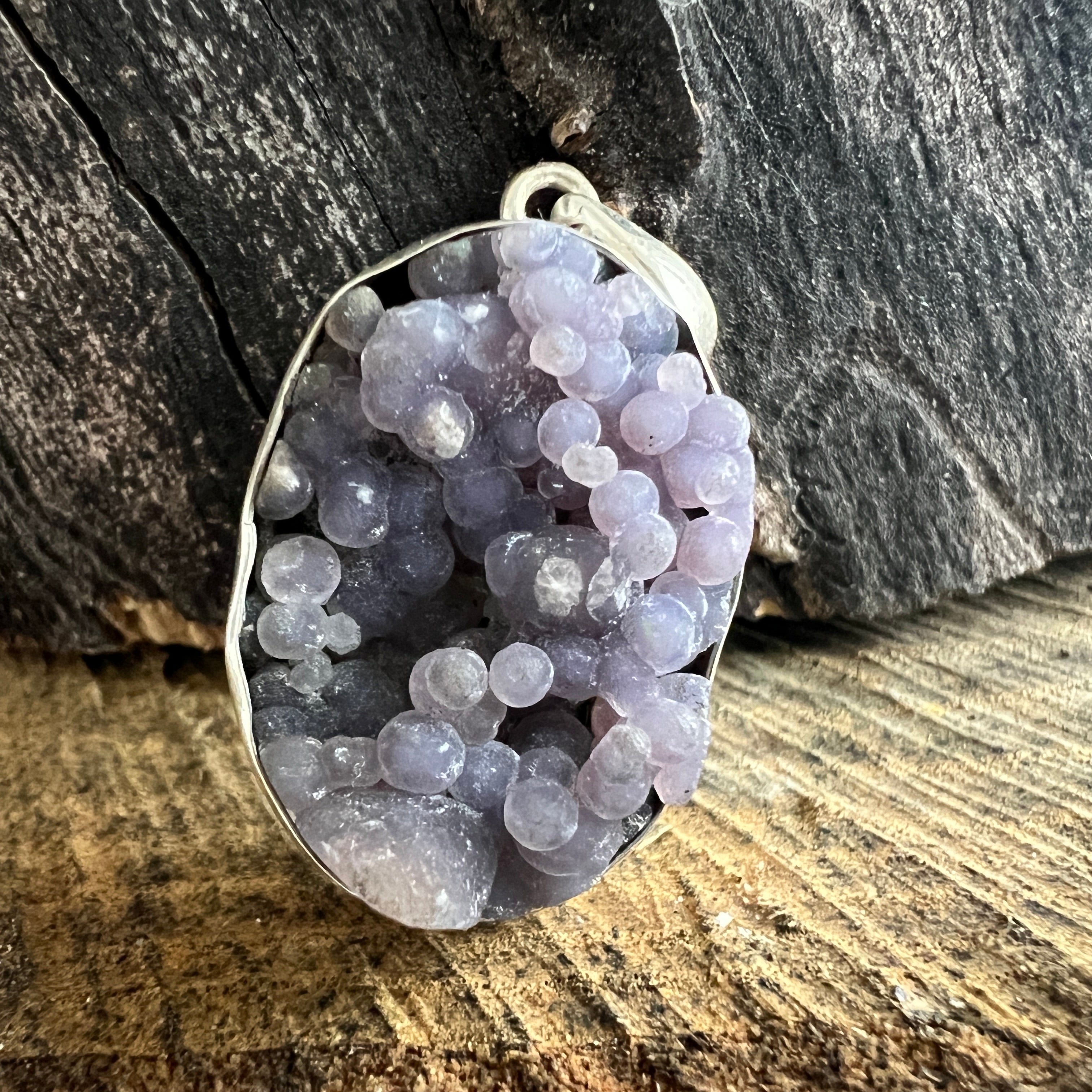 This silver pendant with grape agate impresses with its natural texture, consisting of small crystalline, cluster-like spheres. Its organic appearance turns it into a unique and special piece.