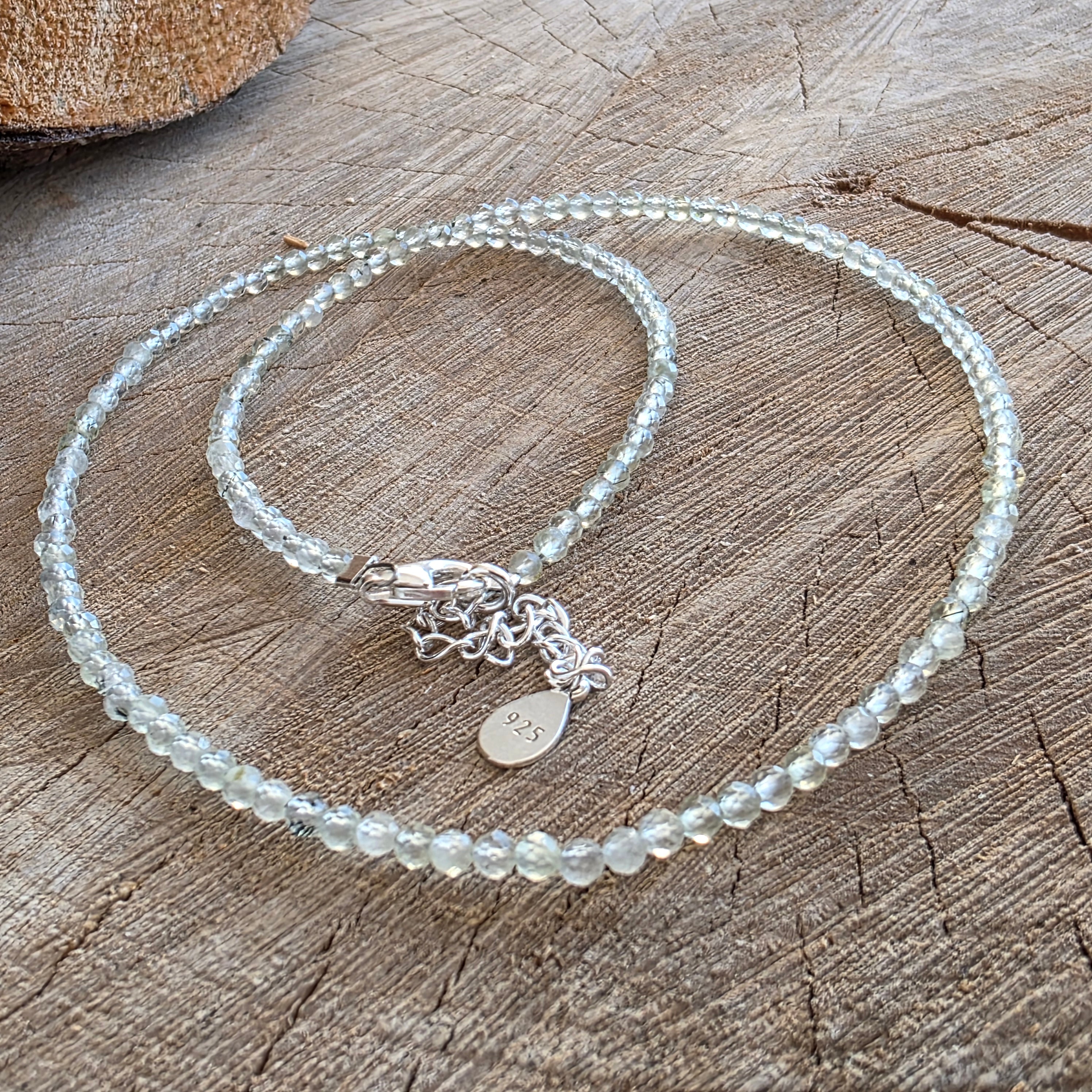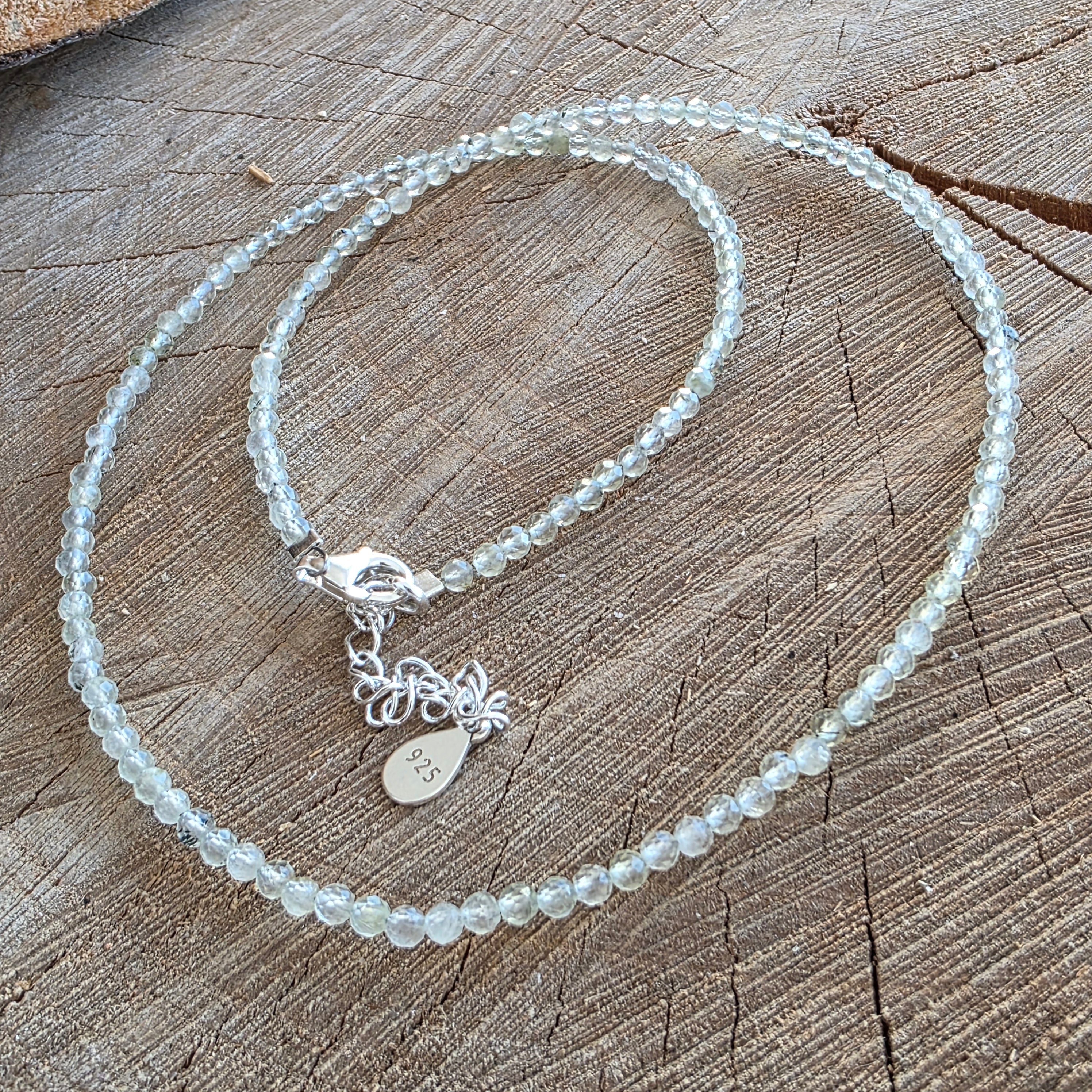 A necklace like a window open to the light – vibrant, clear, playful, and profound at the same time. The 6 mm faceted rainbow fluorite beads shine in shades that dance between violet, green, blue, and pink, like a bridge between emotion and reason, between dream and clarity.
