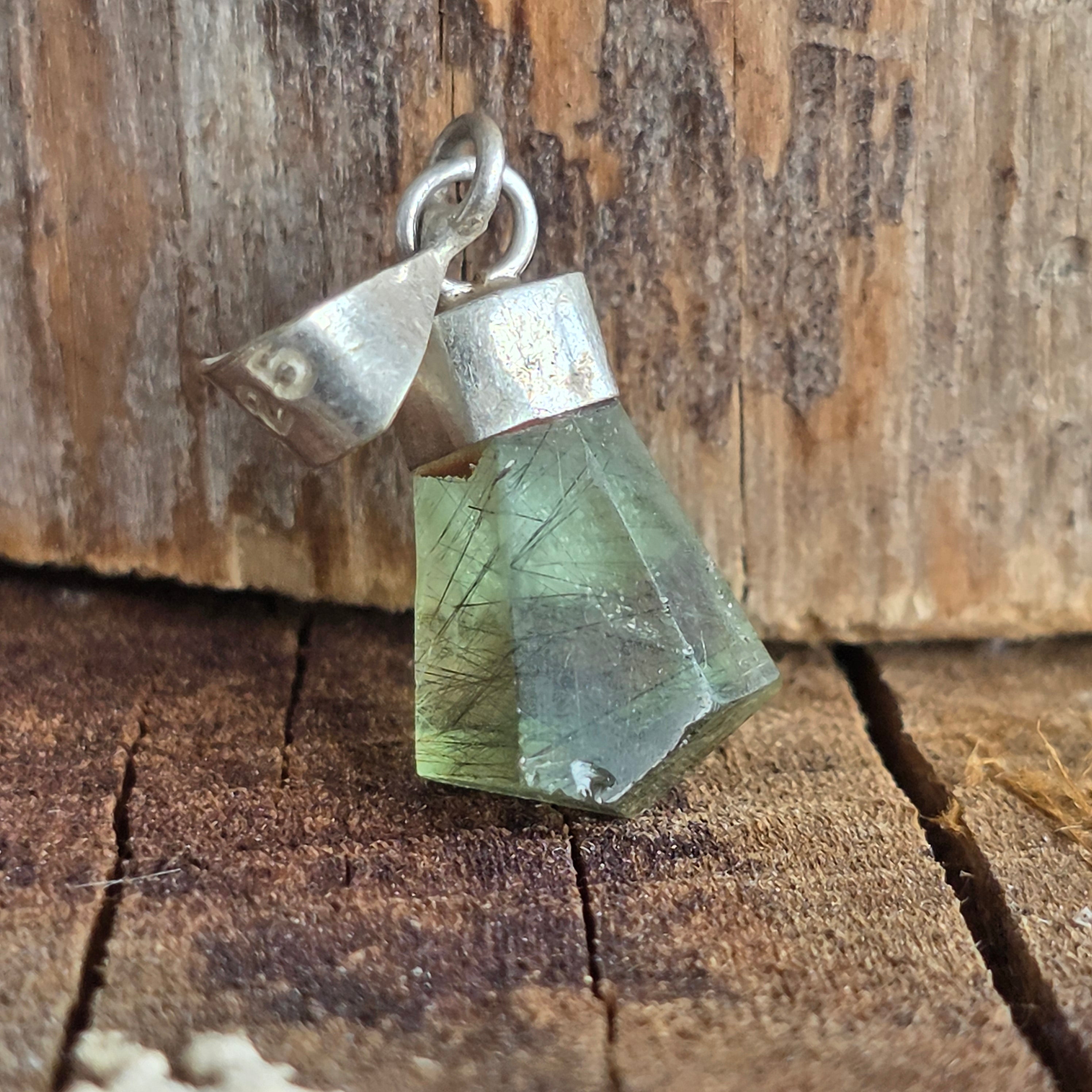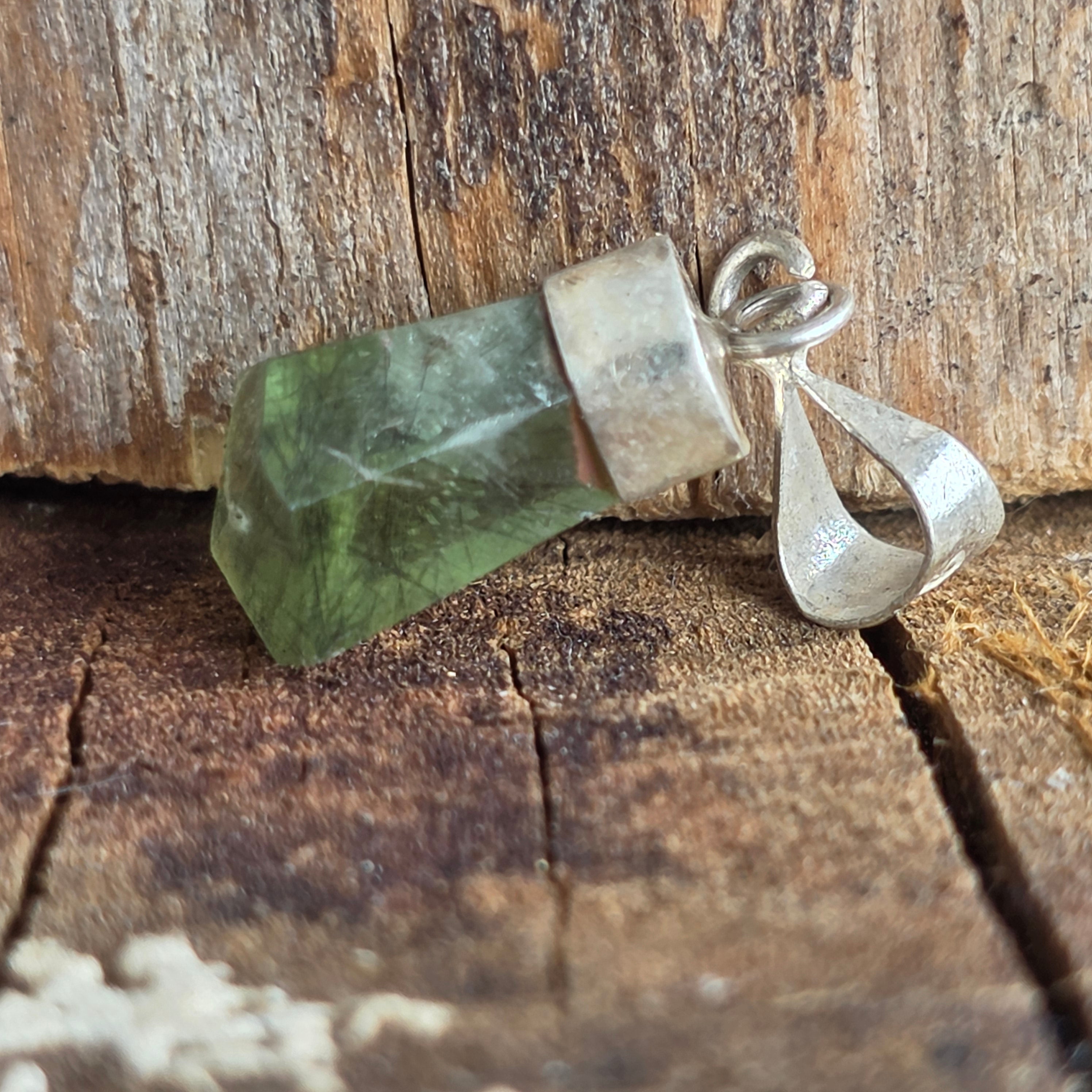 This silver pendant with green garnet impresses with its intense color and the natural appearance of the stone. Its elongated and elegant shape makes it easy to integrate into any style.