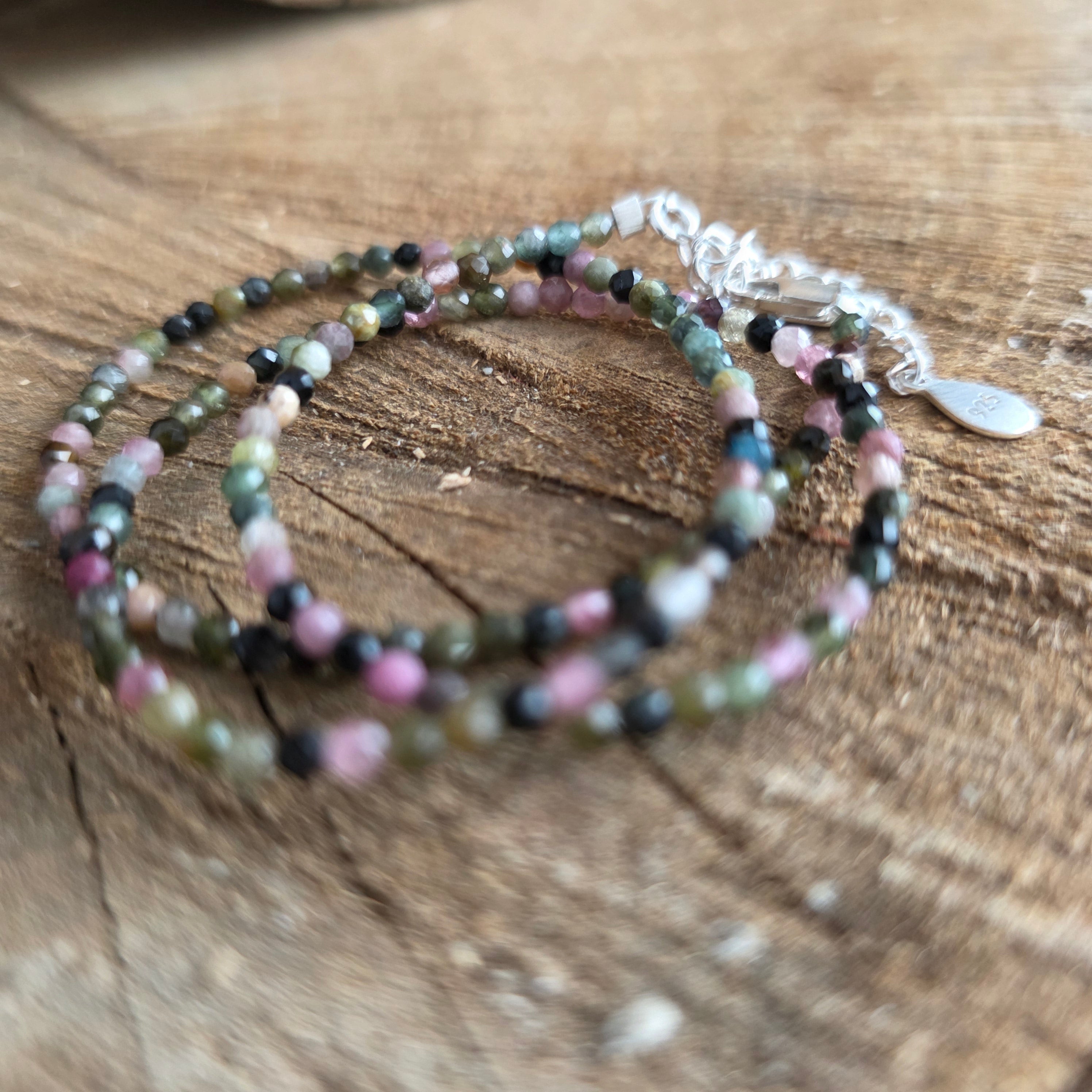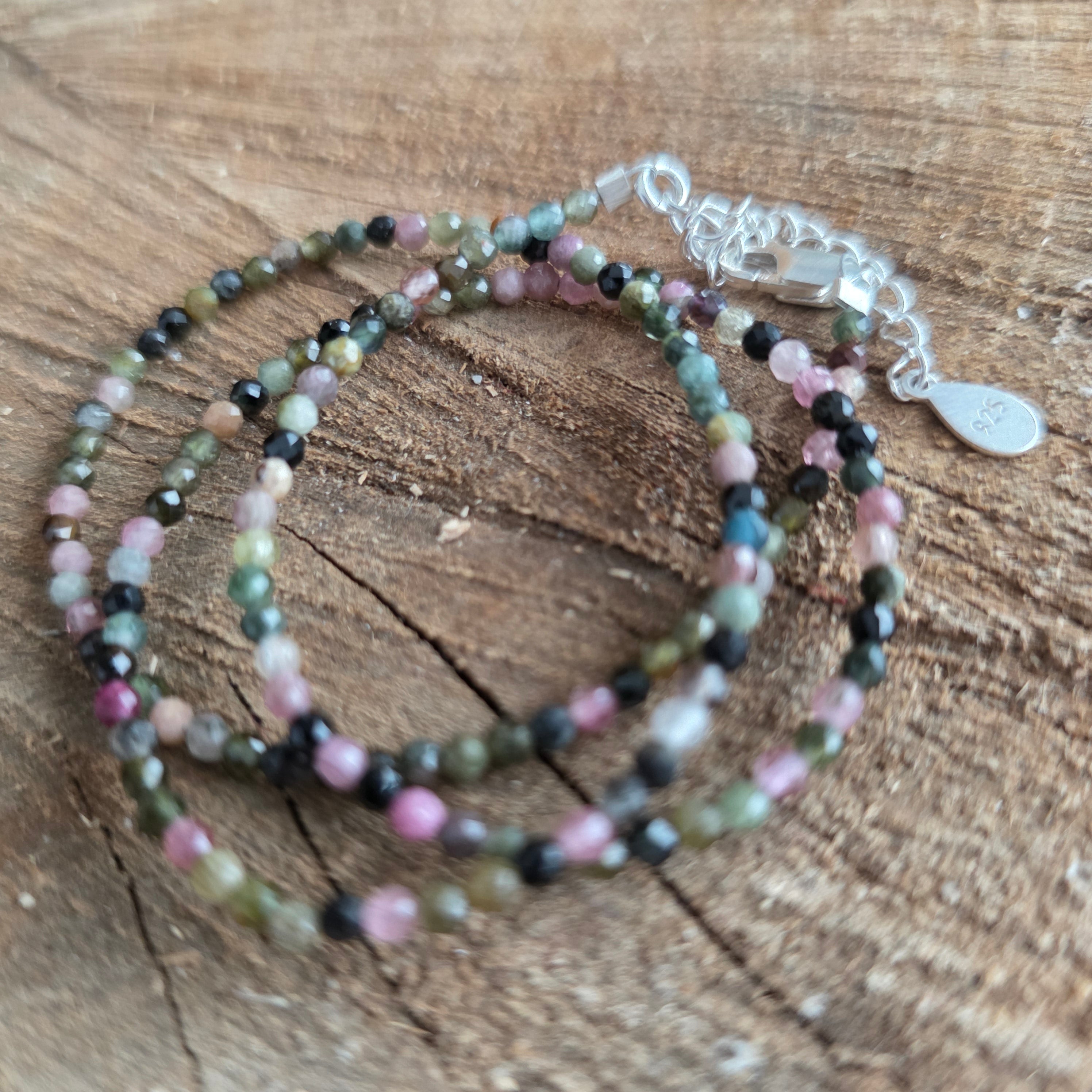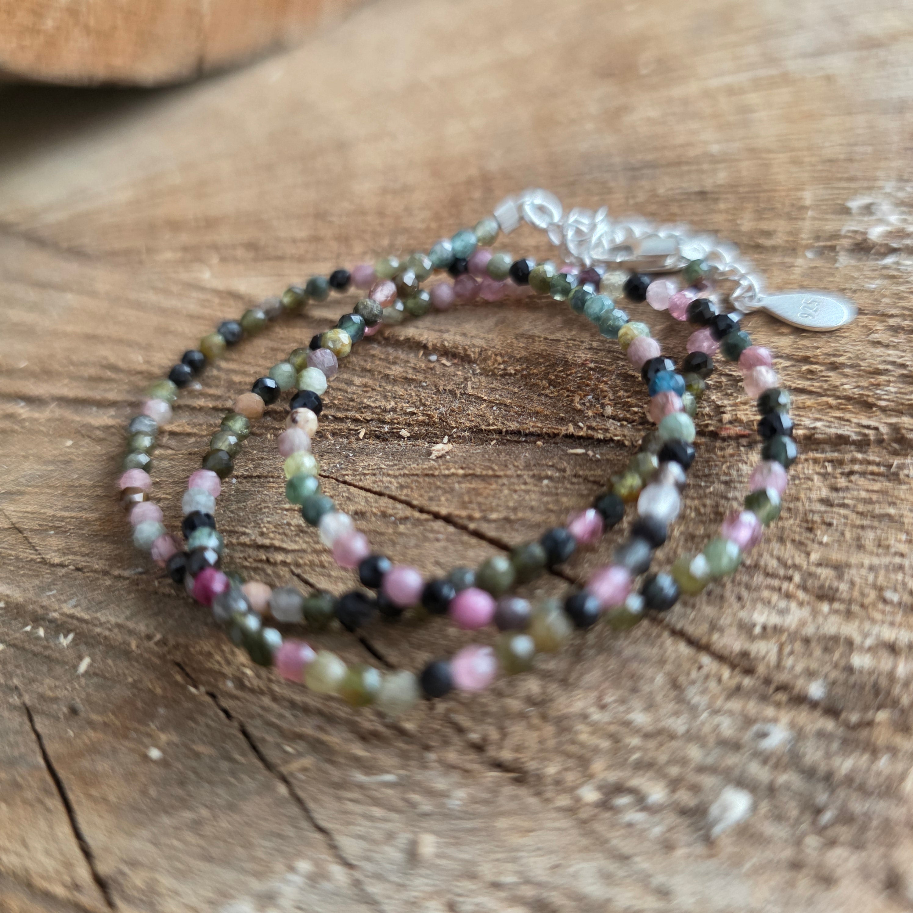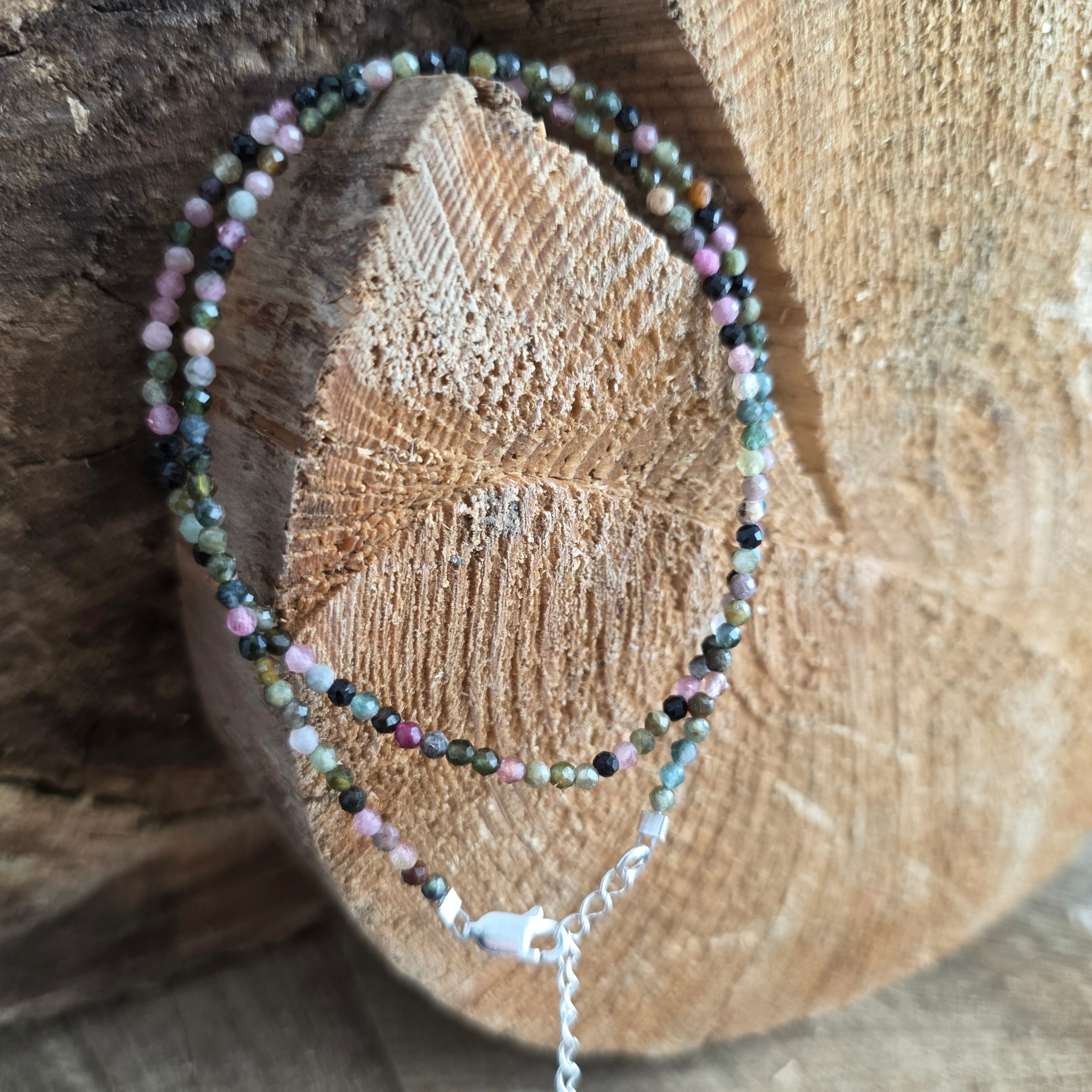 A necklace that combines strength with the beauty of diversity. 2mm faceted natural tourmaline reveals a symphony of earthy and pastel colors, like an autumn garden captured in the light. Its fine facets subtly reflect each shade, giving the necklace an air of refinement and full of vitality.