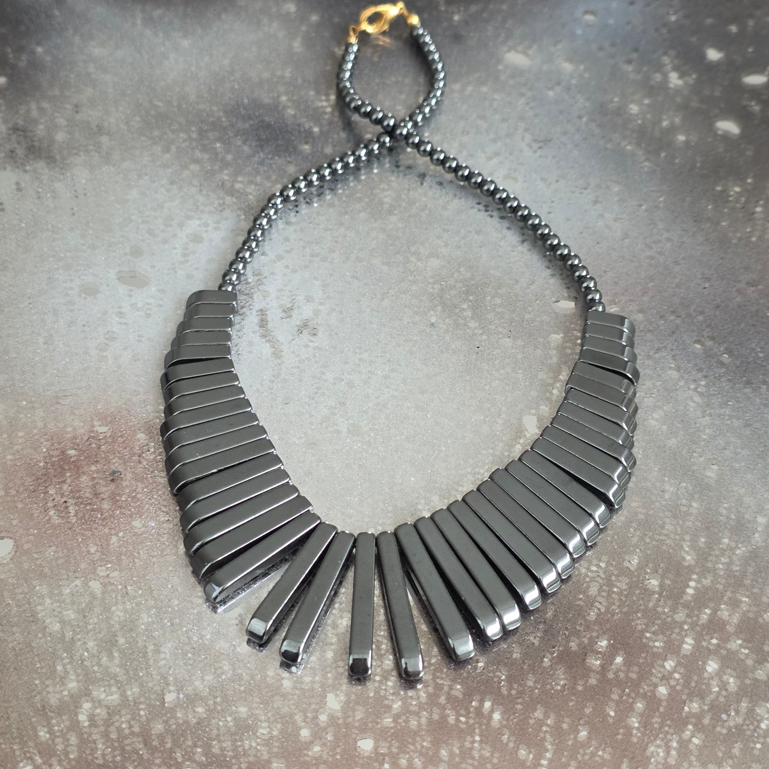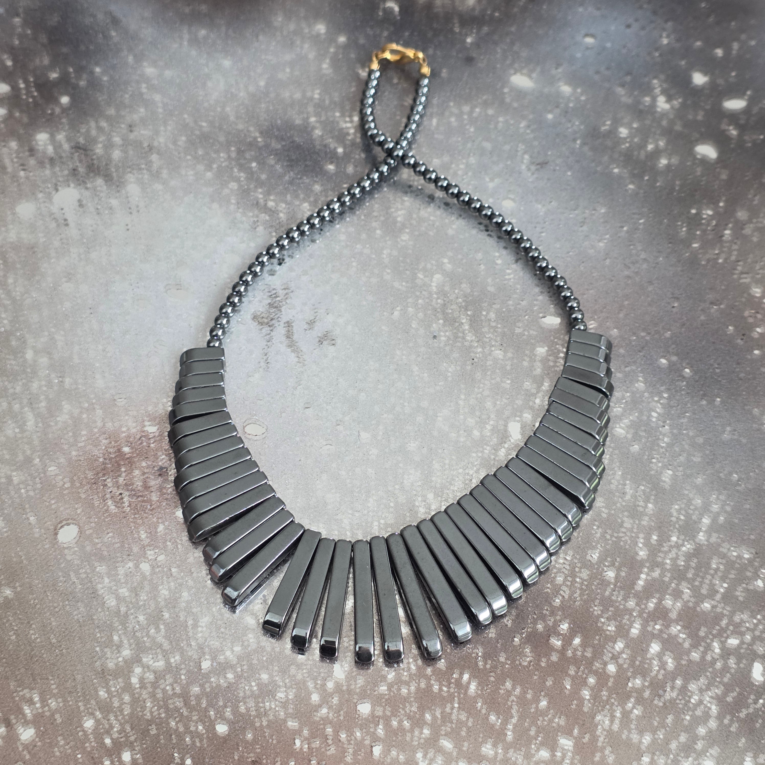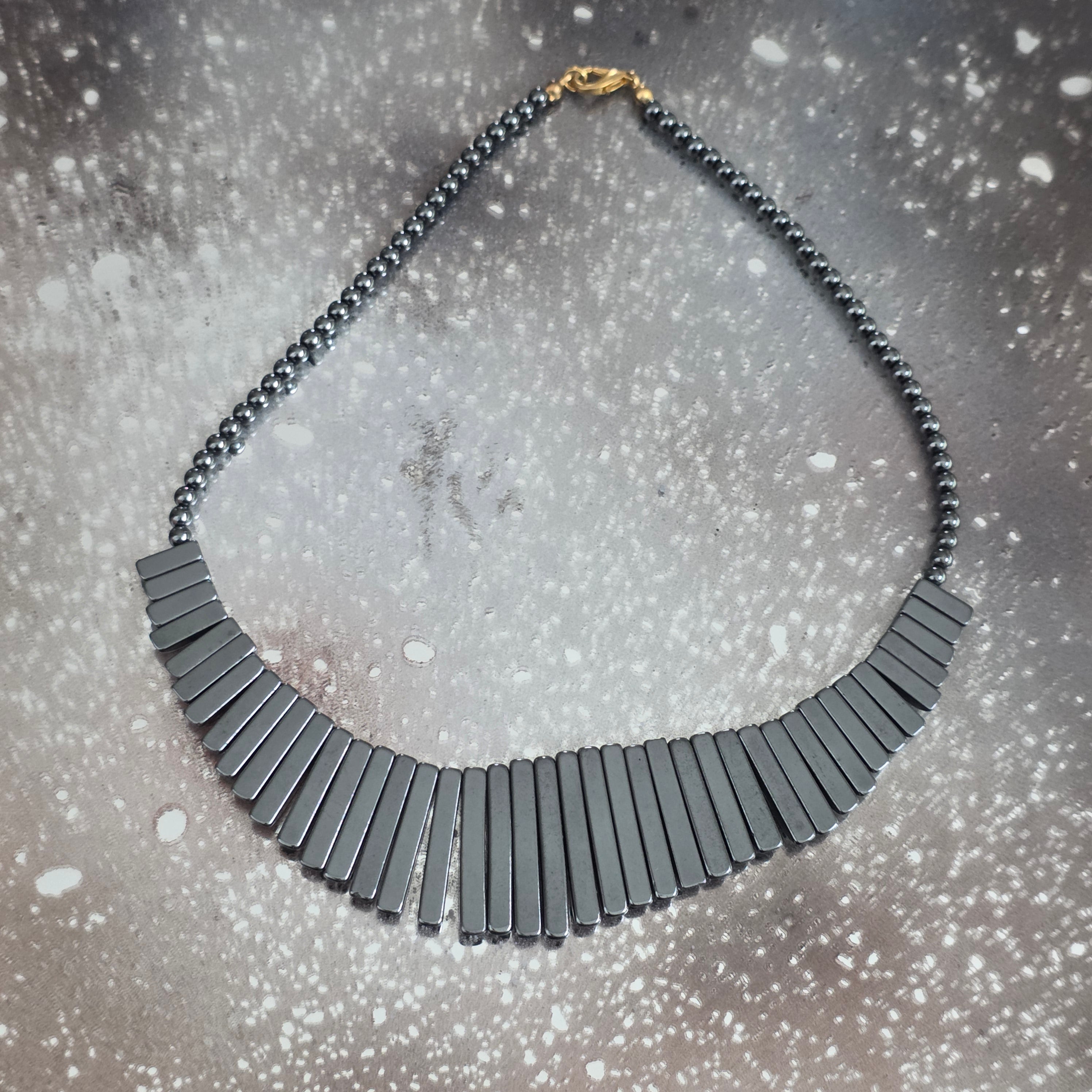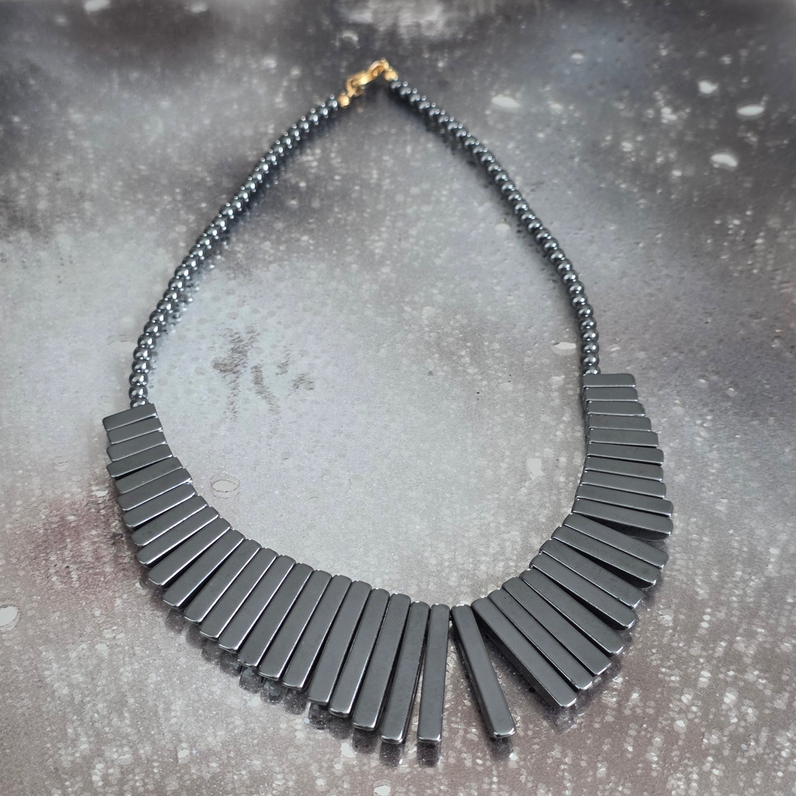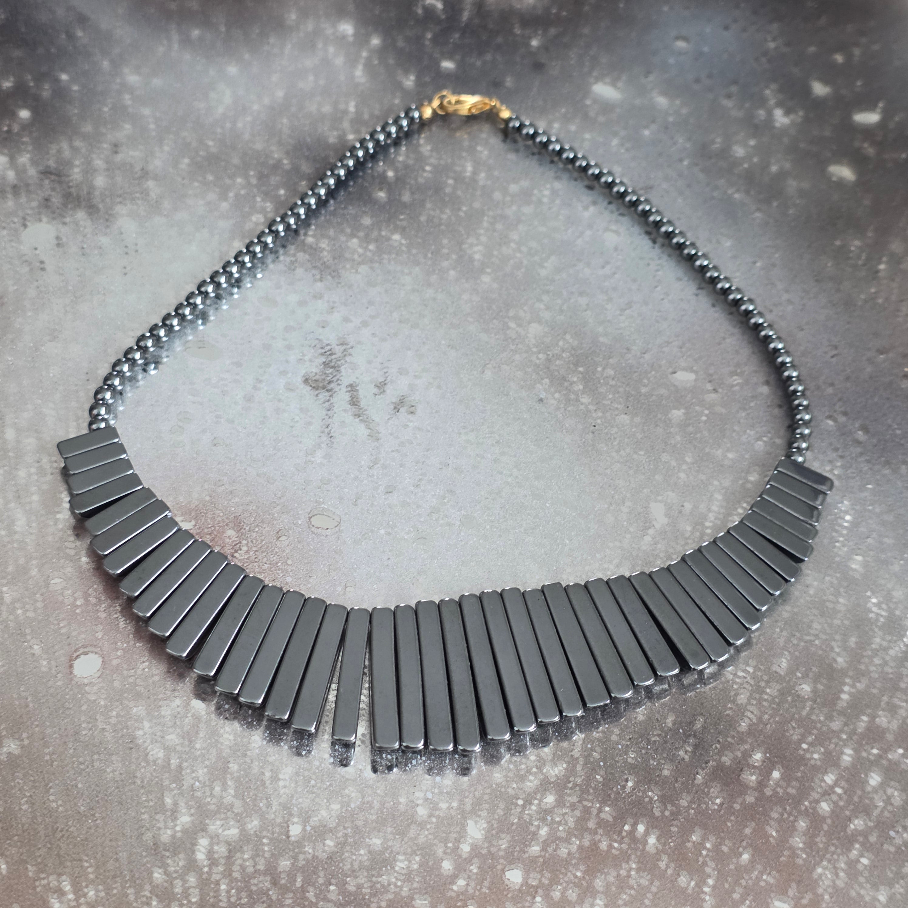 This Egyptian necklace made of natural hematite carries the mark of times when jewelry was more than just ornaments – they were talismans of protection, power, and spiritual connection. The Egyptian design, with its imposing and regal appearance, gives the necklace a special presence, turning it into a piece that is not just worn, but experienced.