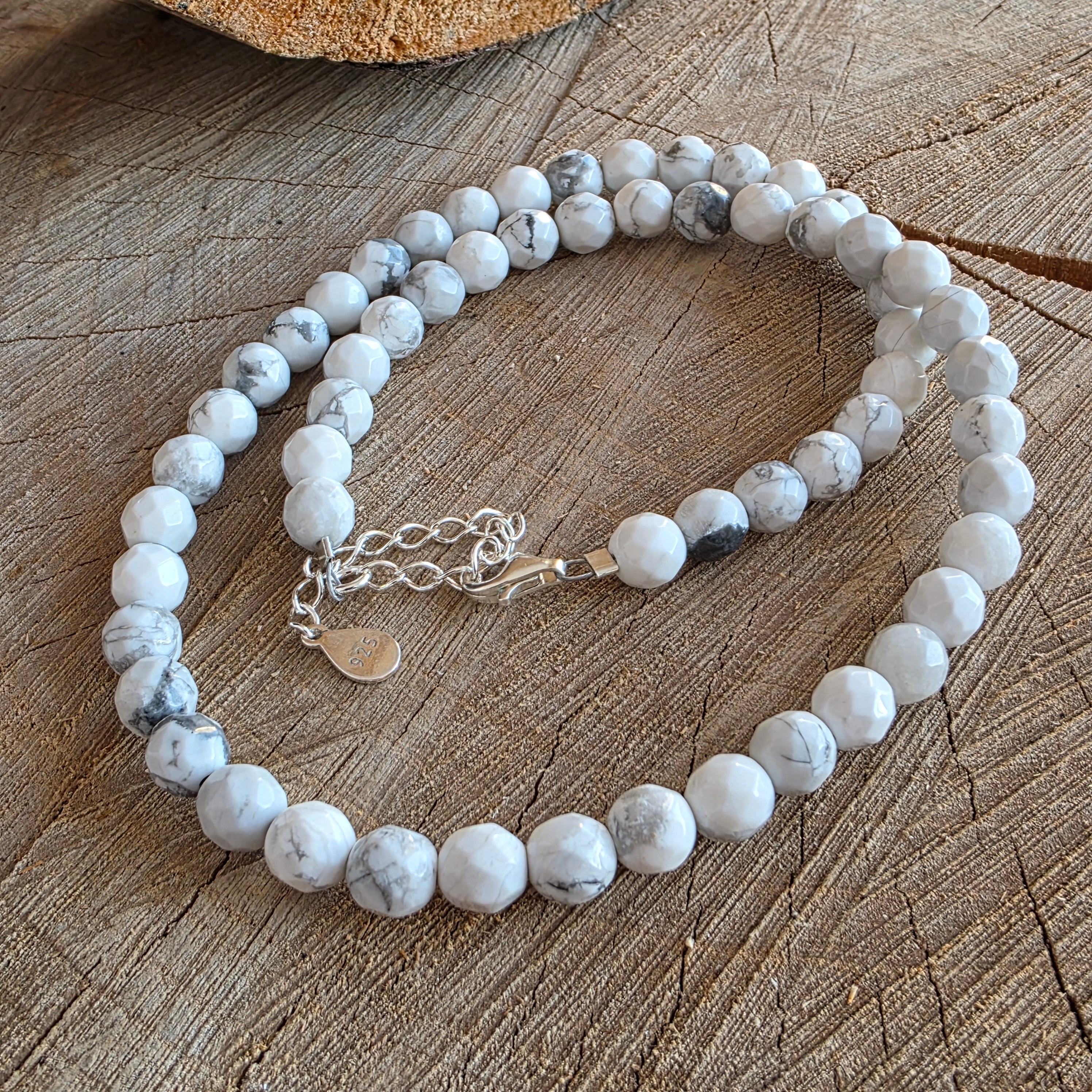 A jewel like a calm farewell on a white morning. This natural white Howlite necklace, with 6 mm faceted spheres, captures the elegance of peace and gently places it around the neck. His delicate bright surface reflects the light discreetly, as a promise of balance and clarity.