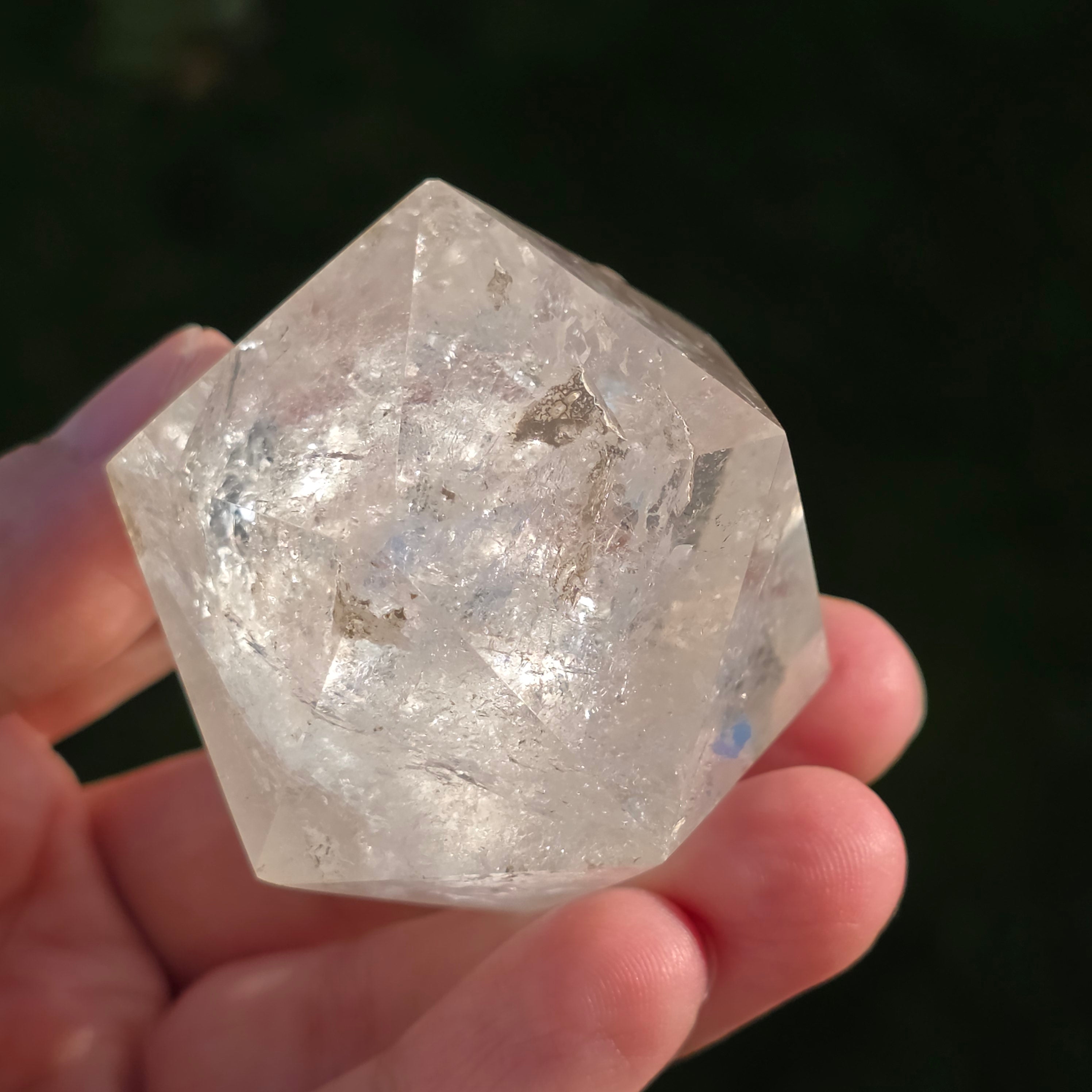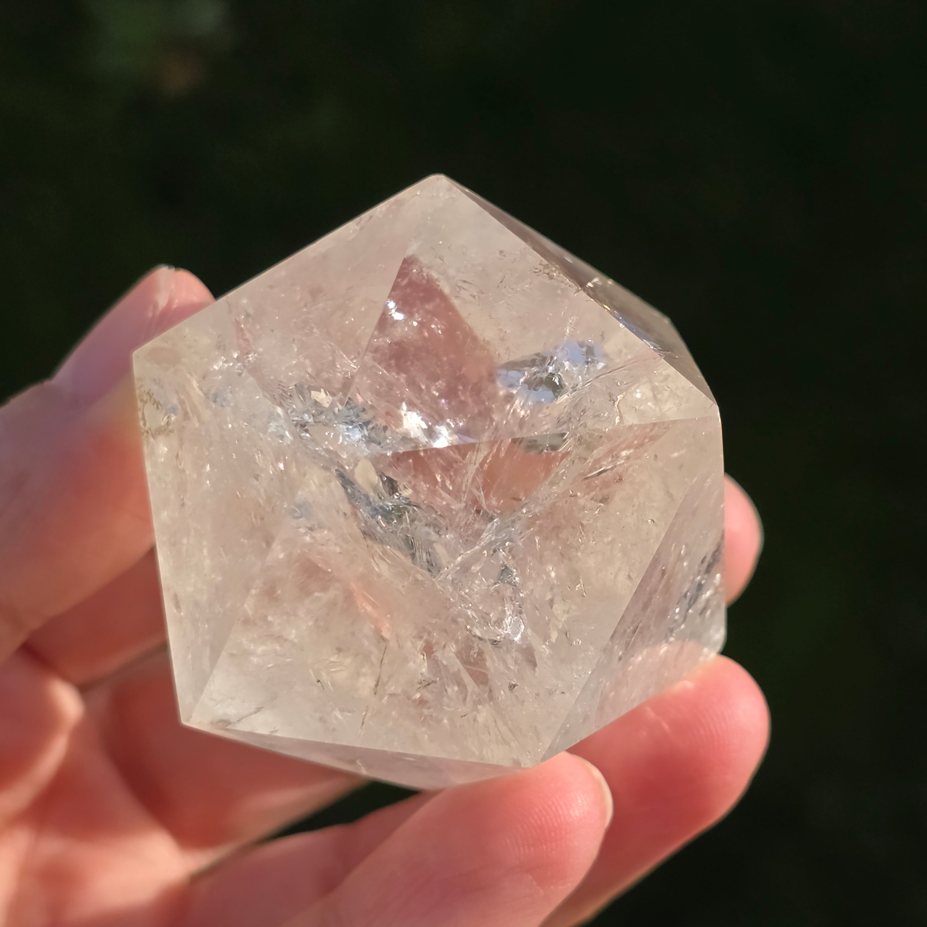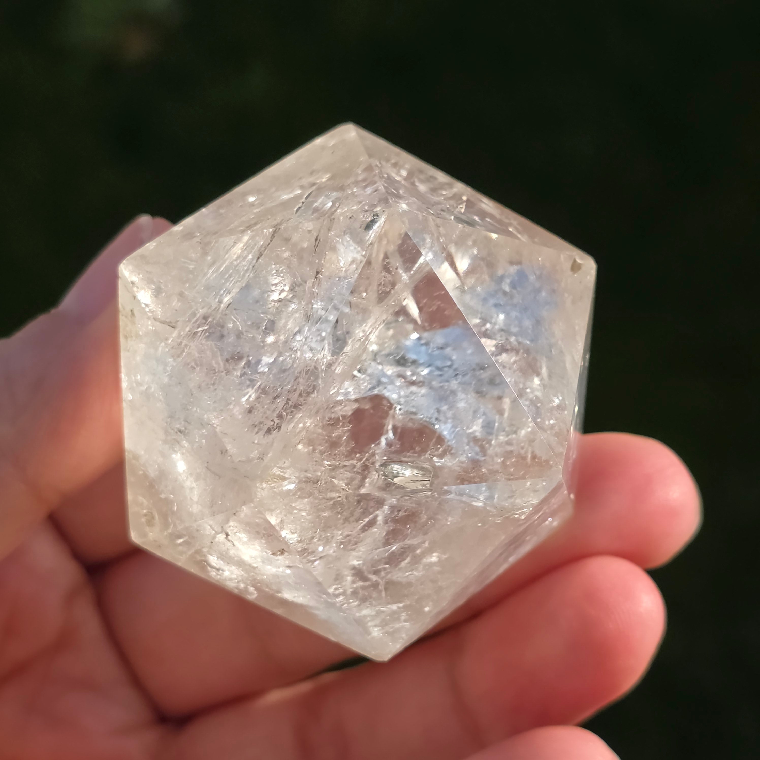 Color quartz Icosahedron (rock crystal), manually polished with precision in the form of a platonic body with 20 equilateral triangular faces.