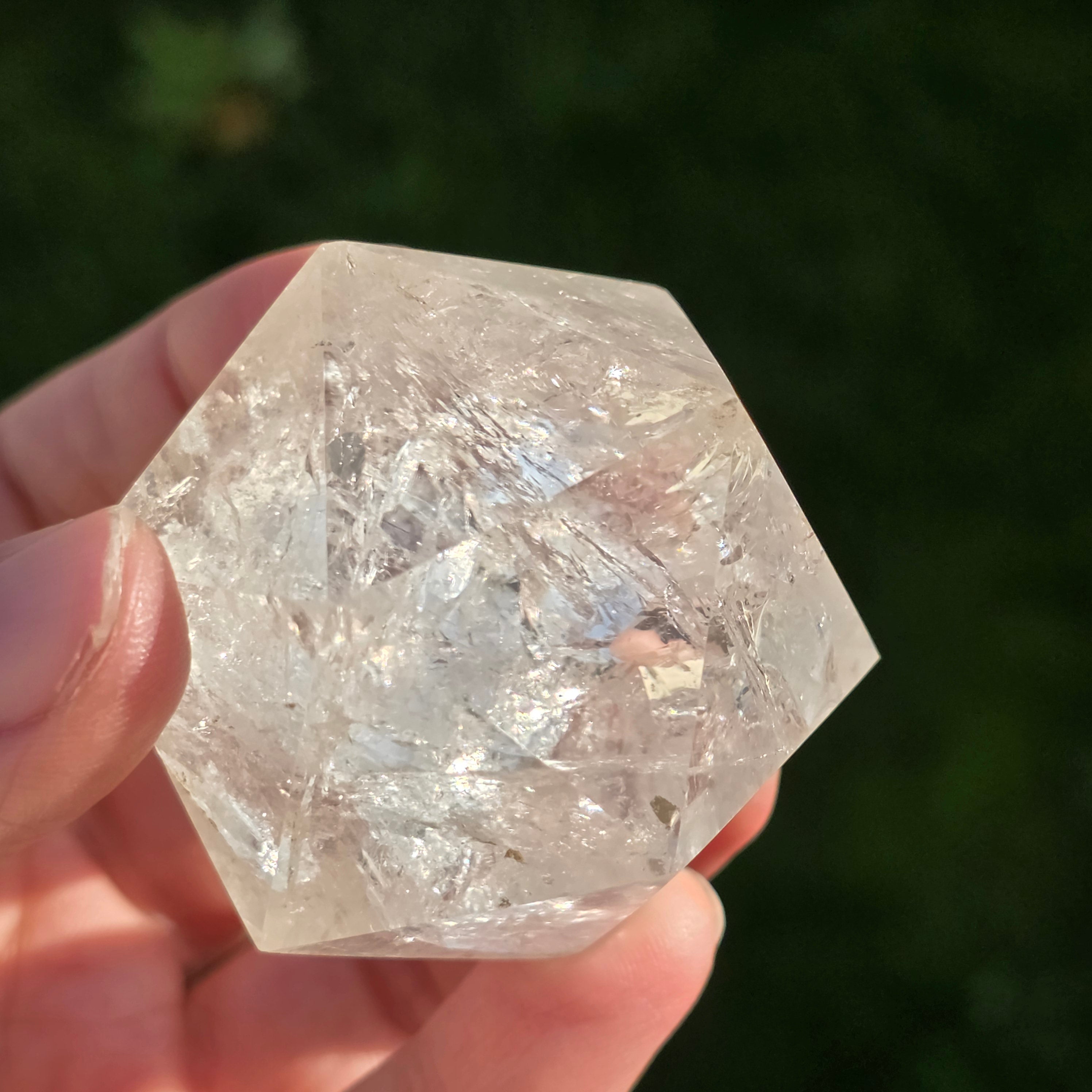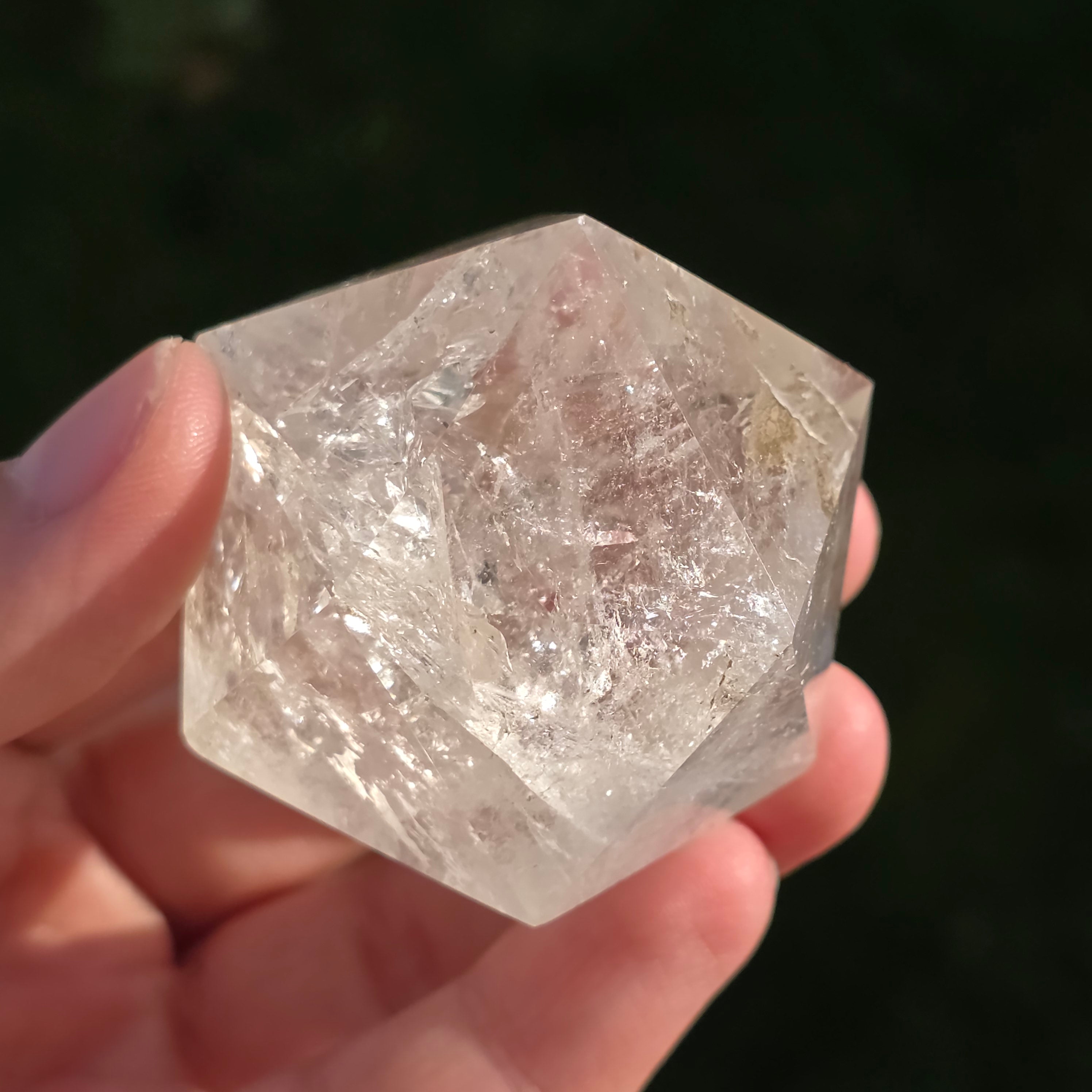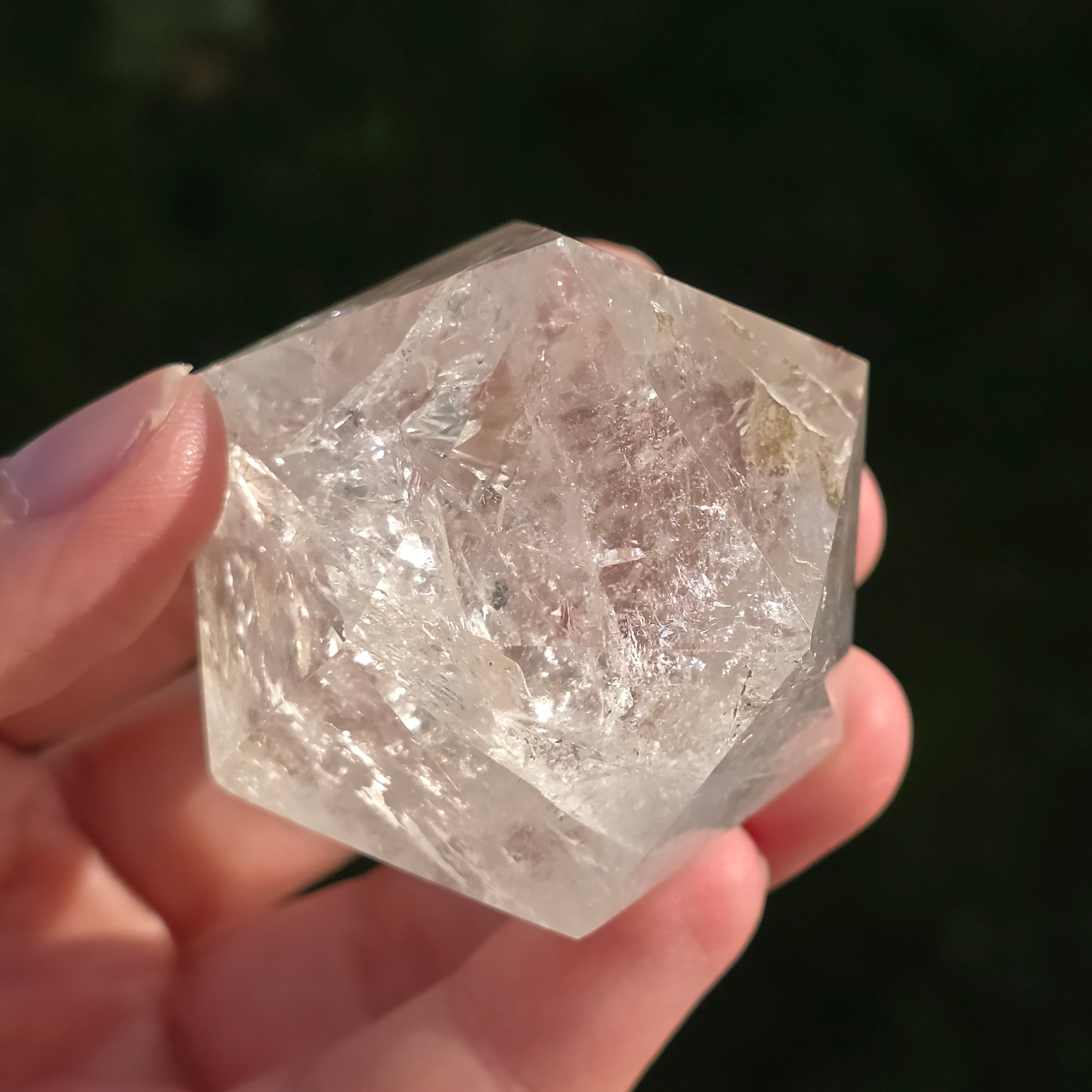 Color quartz Icosahedron (rock crystal), manually polished with precision in the form of a platonic body with 20 equilateral triangular faces.