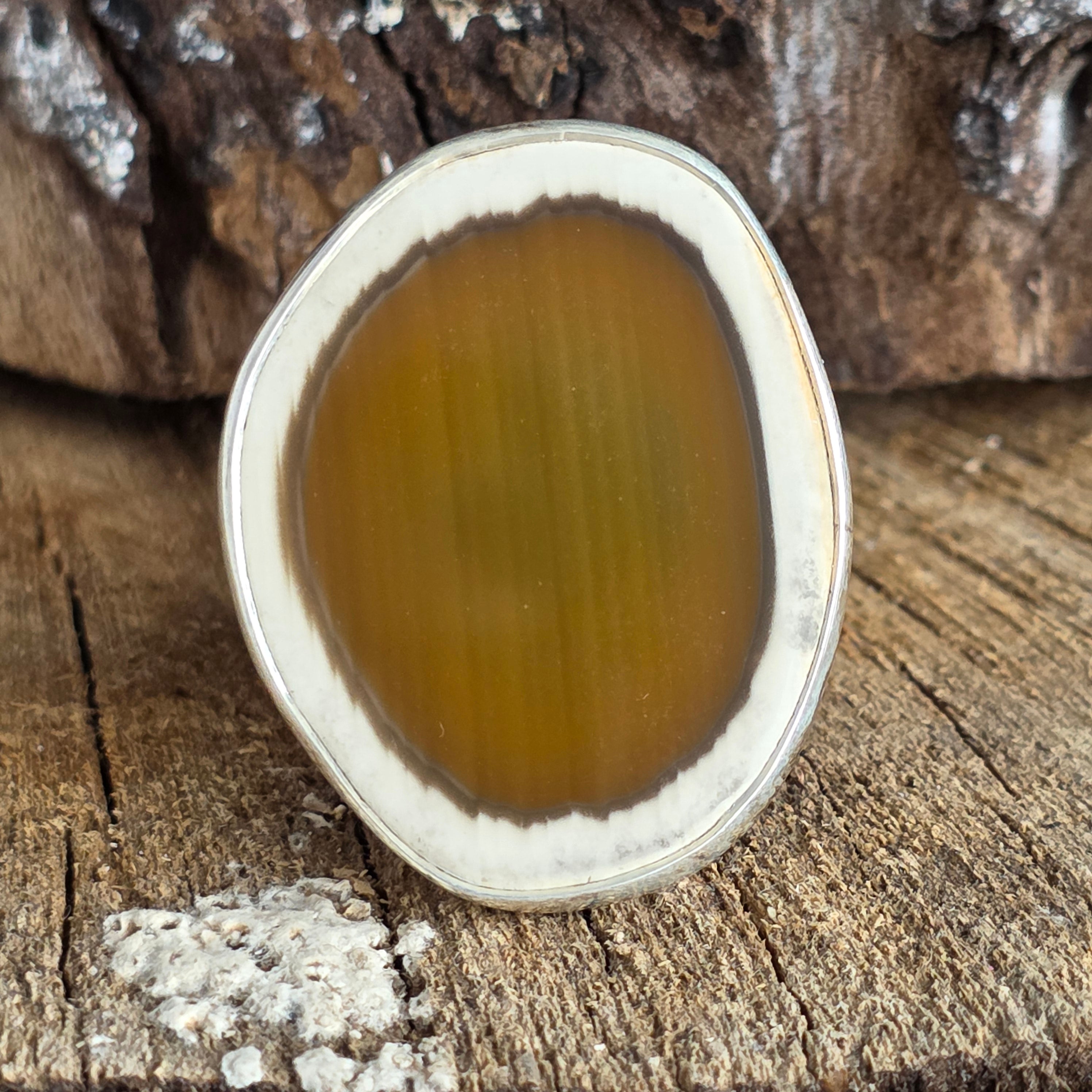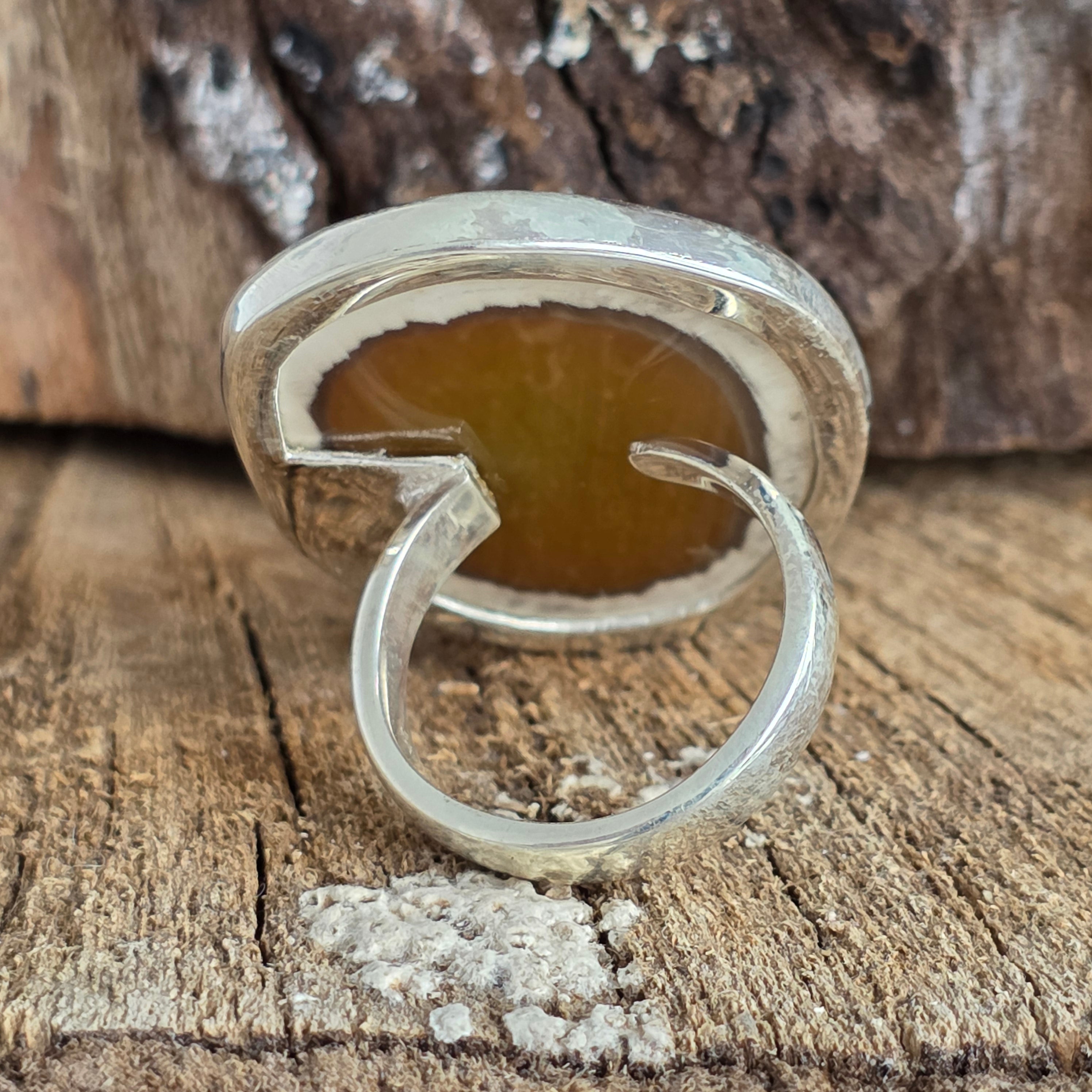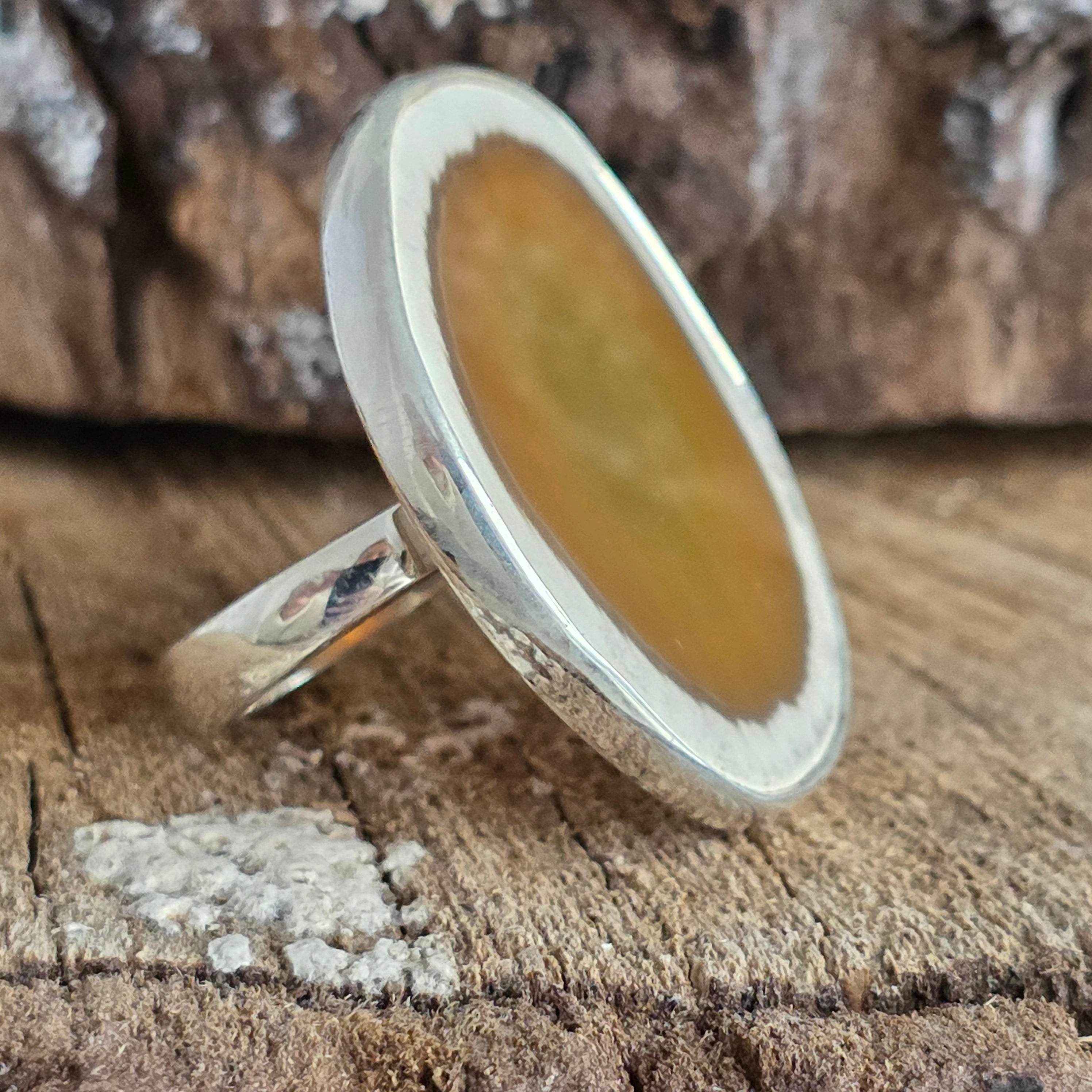 This silver ring with natural Imperial Jasper reveals the true beauty of a stone known for its warm colors and unique patterns. The central olive-green hue, framed by a distinct cream edge, gives it an organic and refined look, making each piece a one-of-a-kind creation.