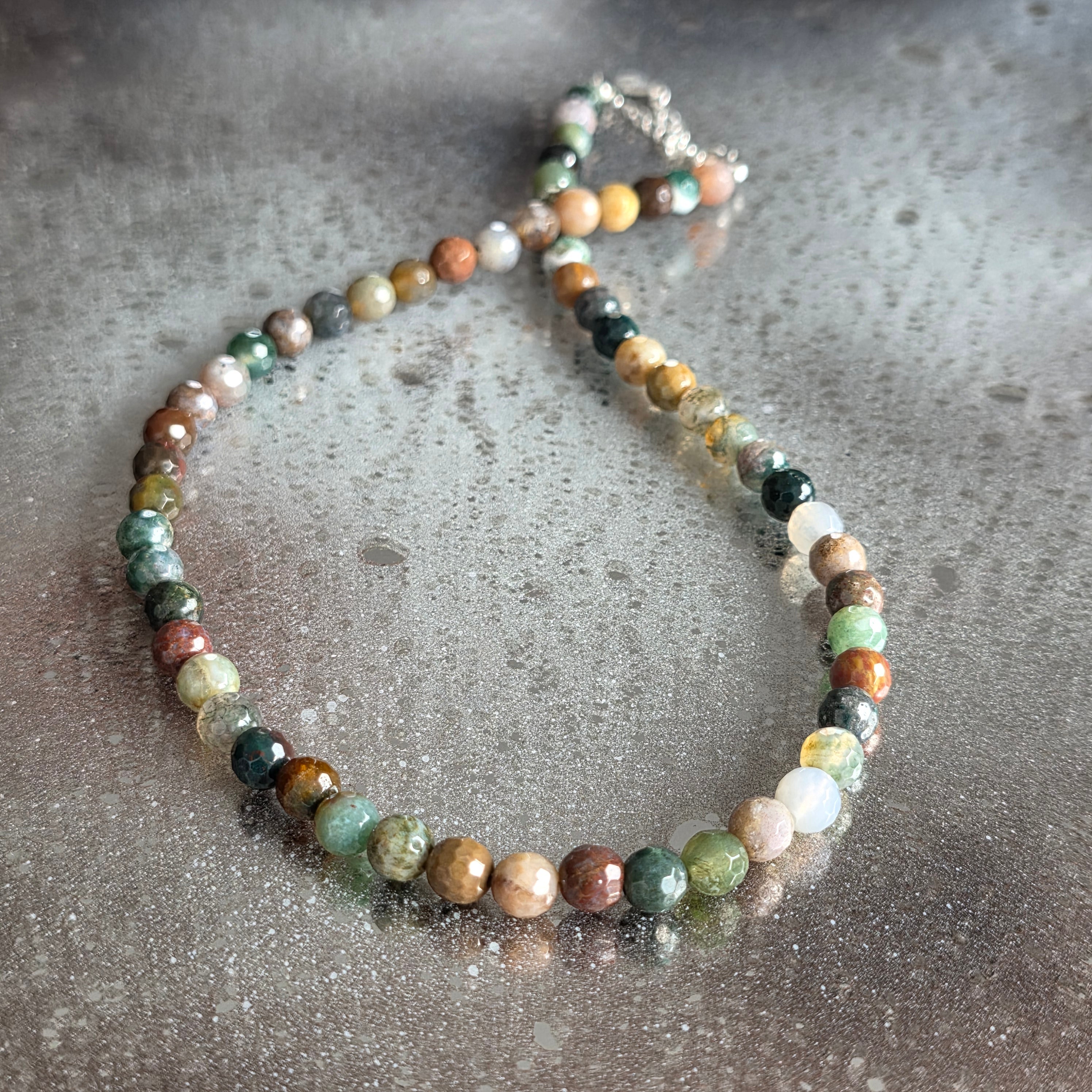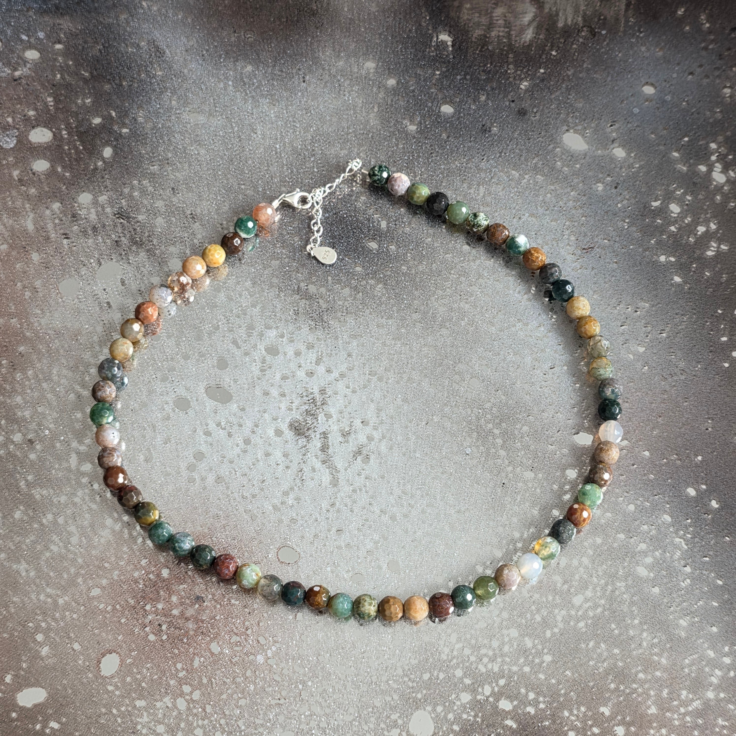 A necklace that seems to gather the colors of the earth within it – serene green, warm brown, subtle hints of red and cream – like an ever-changing inner landscape. Made from natural Indian agate, with 6 mm faceted beads, this piece has a prominent presence yet remains balanced and harmonious.