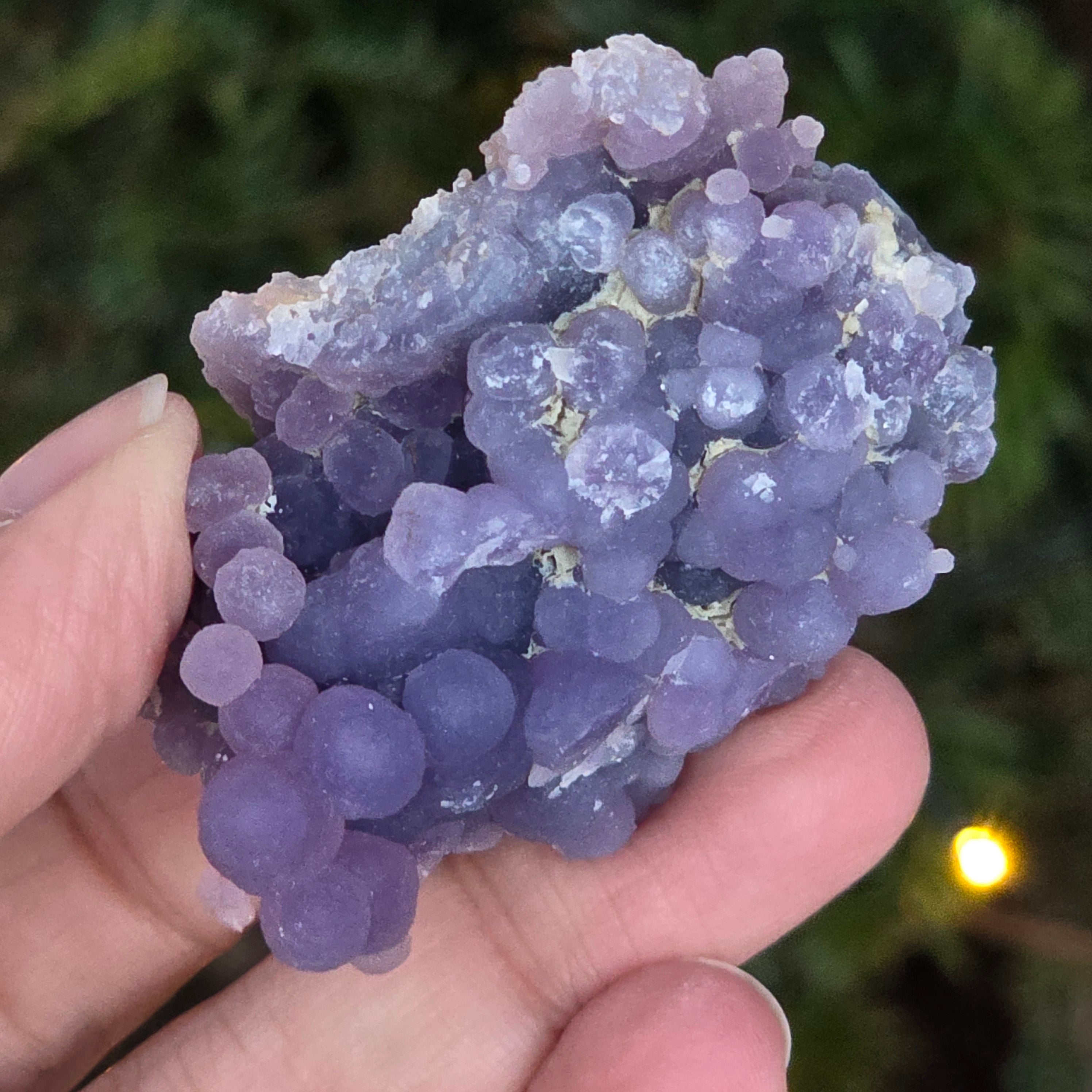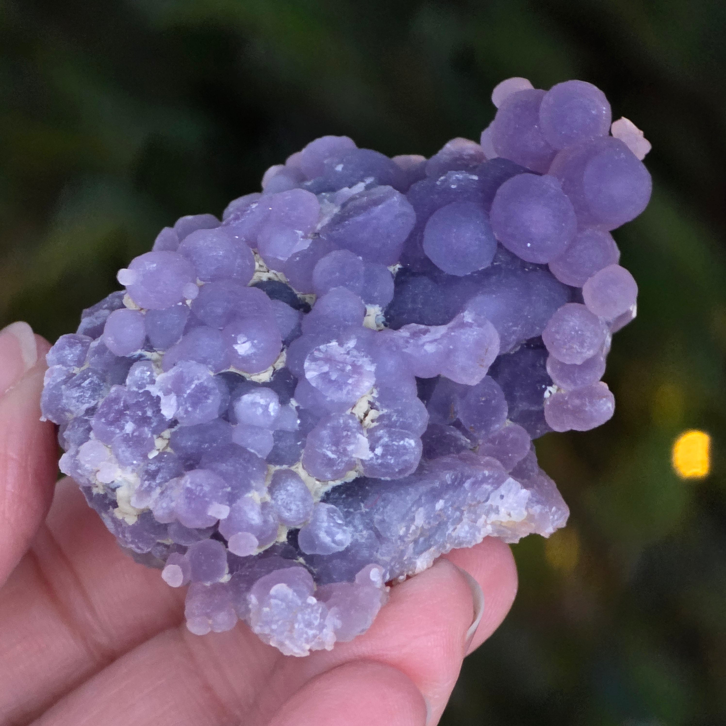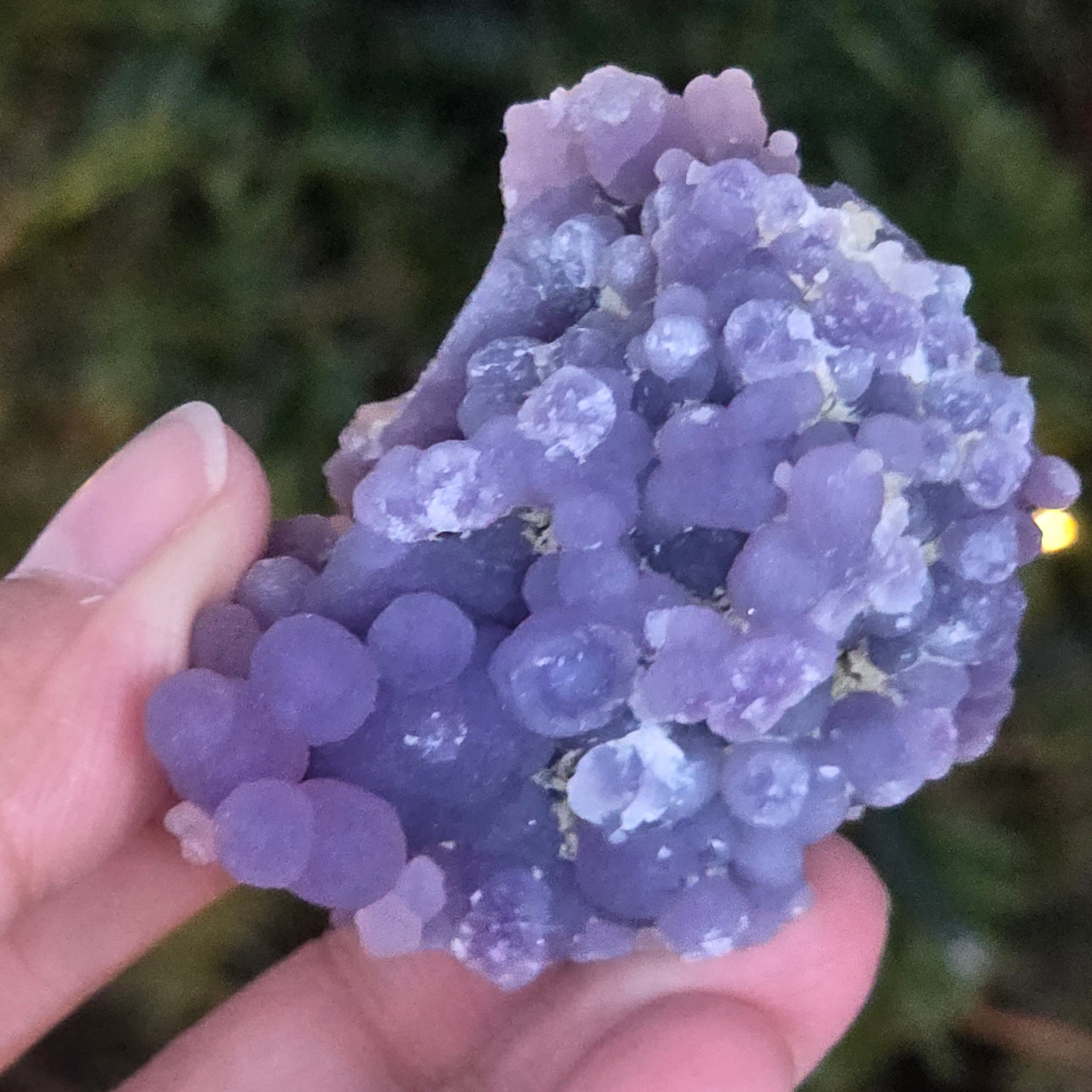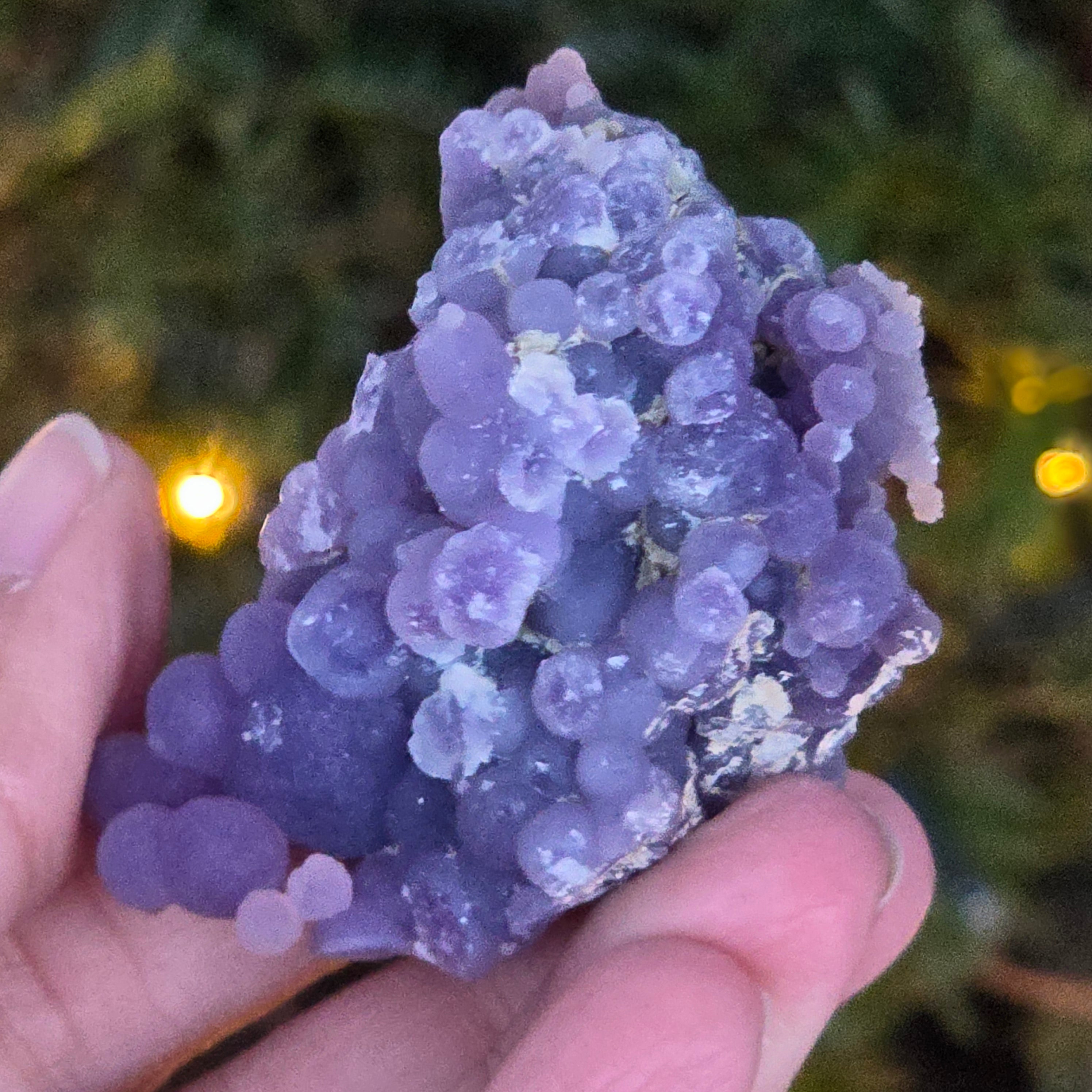 Grape agate forms in the cavities of volcanic rocks, where silica-rich solutions cool and crystallize, creating the distinctive grape-like pattern.