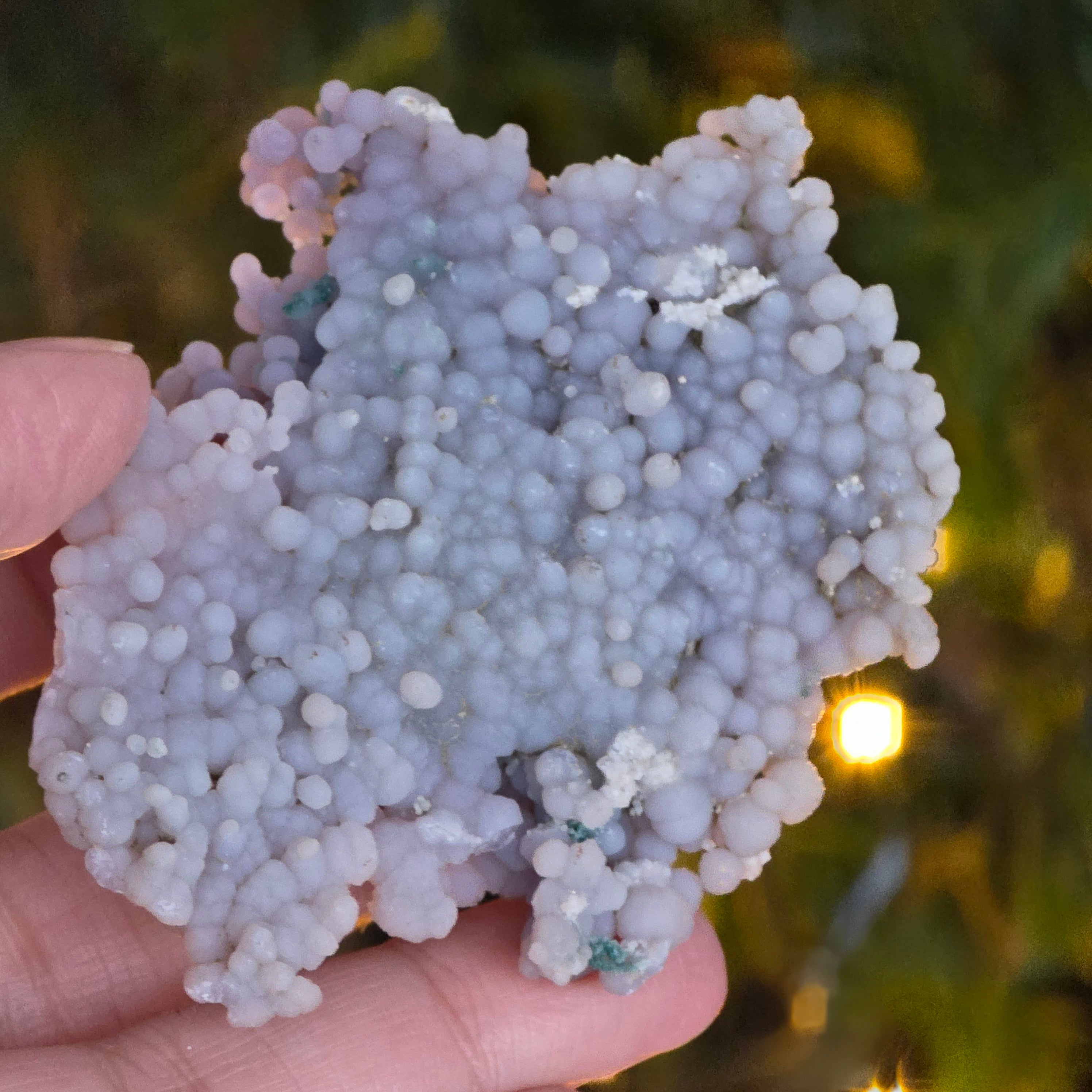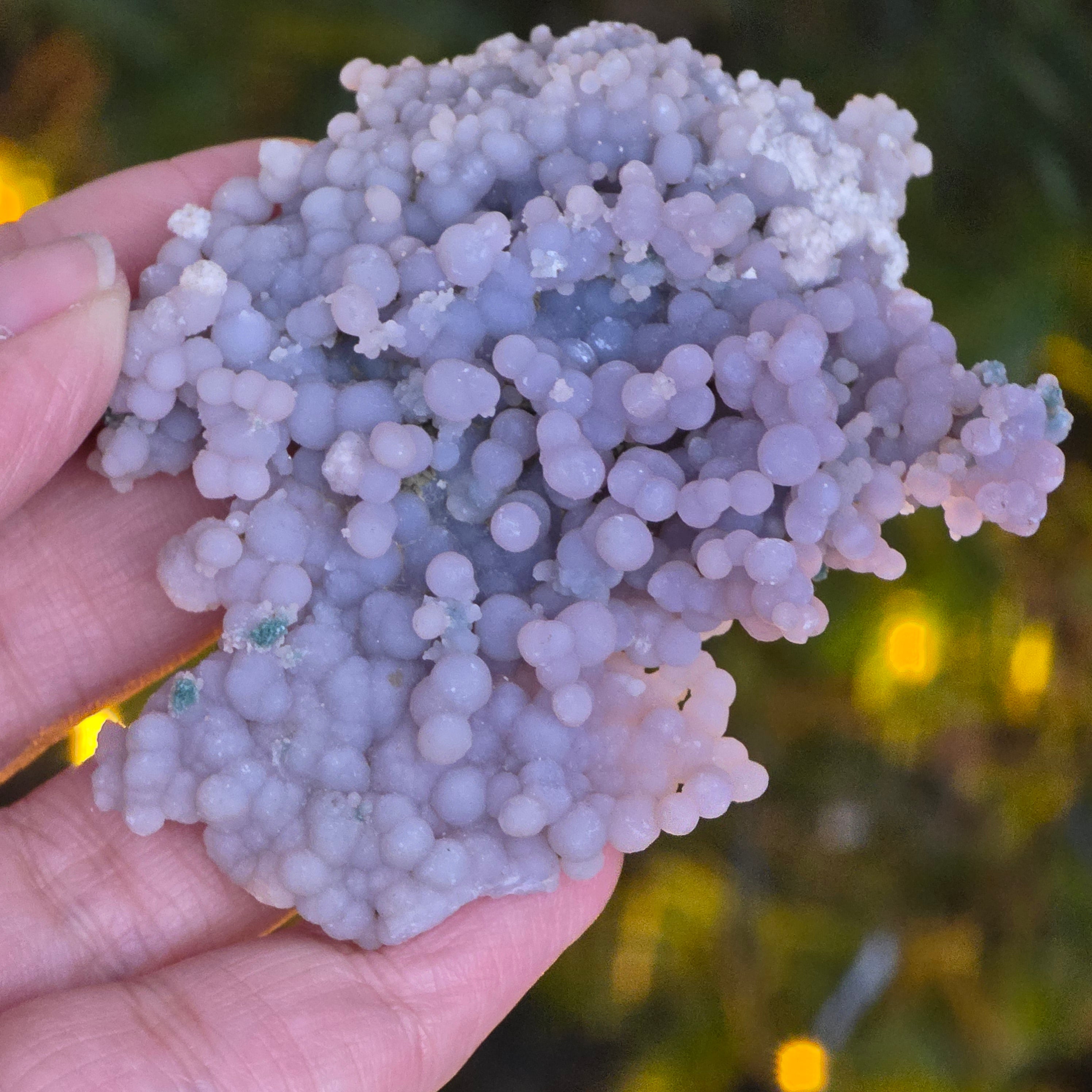Grape agate stands out for its unique patterns, which resemble grapes. These patterns are usually spherical or elliptical shapes, arranged regularly or randomly on the surface of the stone. The color of grape agate can range from shades of purple, pink, blue, green, and brown to more neutral tones such as gray and white.