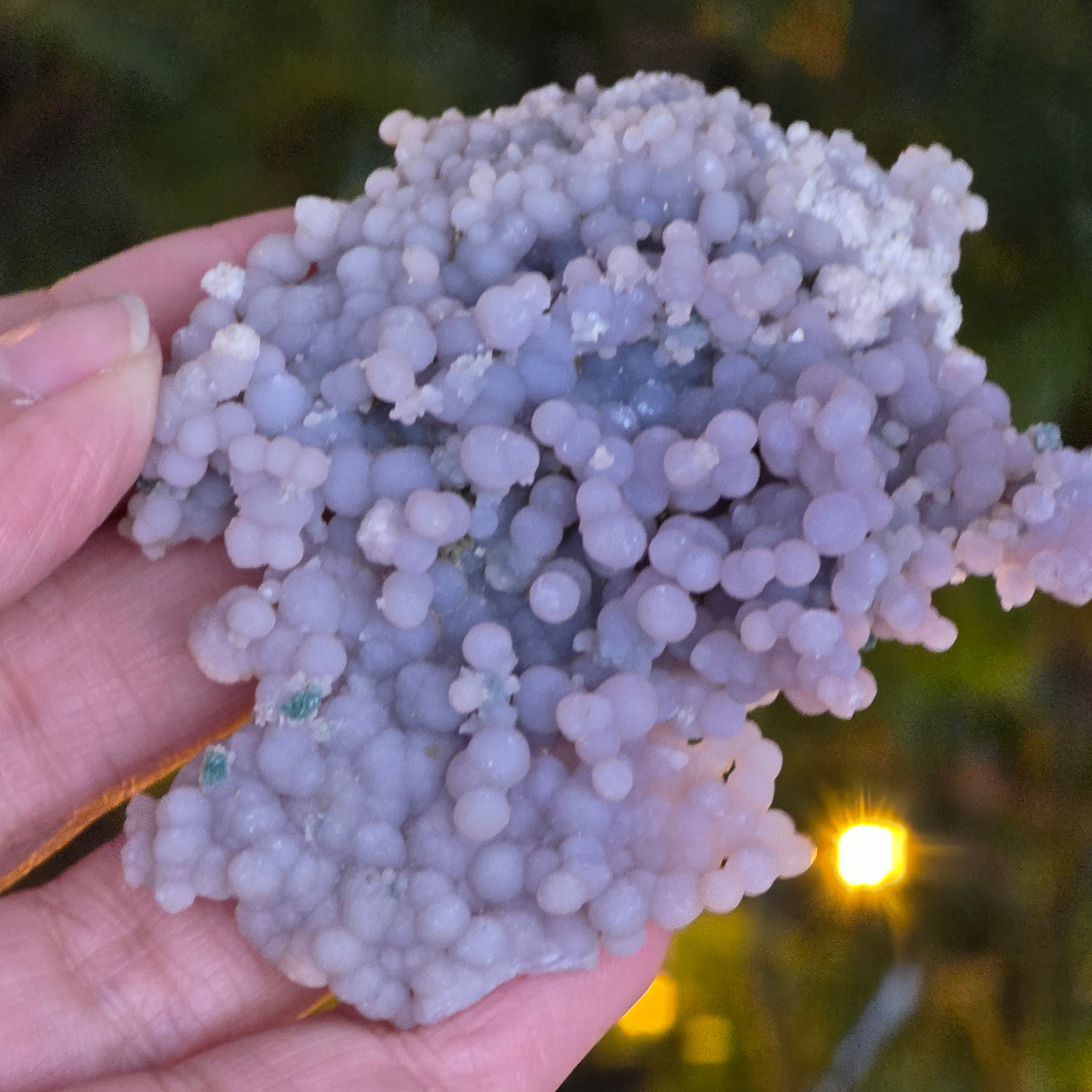 Grape agate forms in the cavities of volcanic rocks, where silica-rich solutions cool and crystallize, creating the distinctive grape-like pattern.