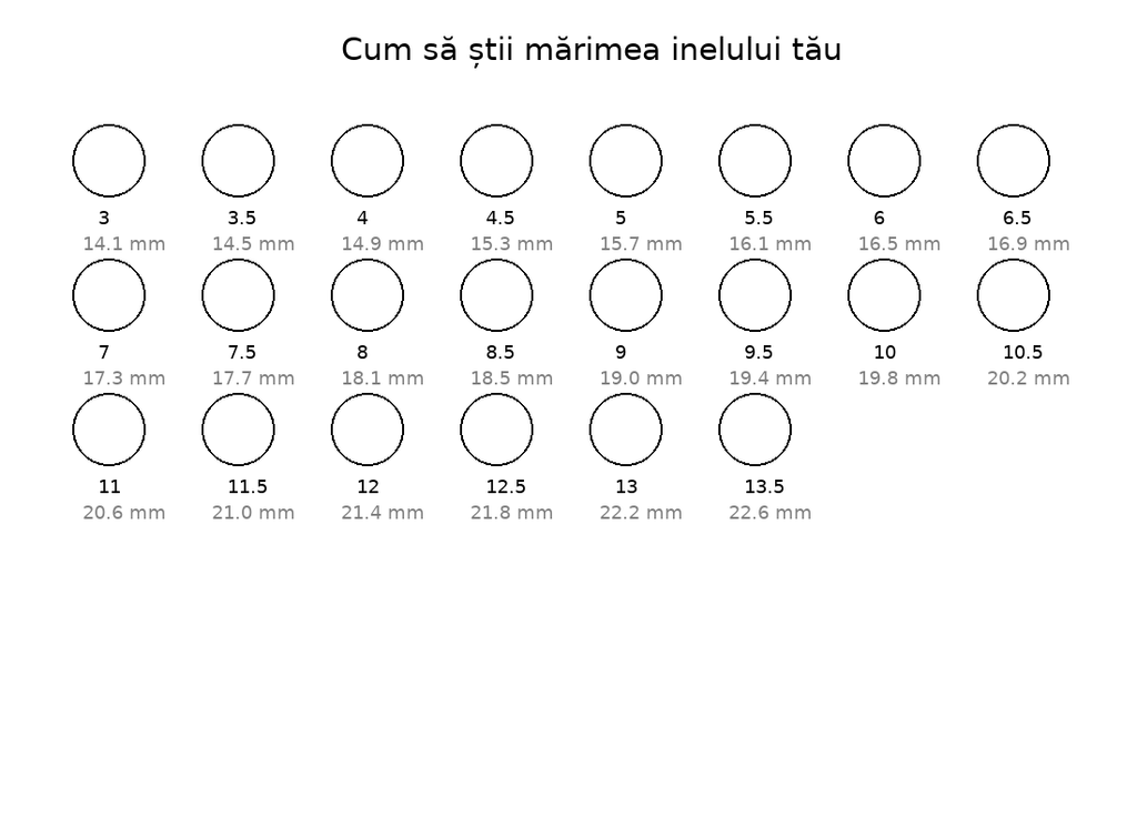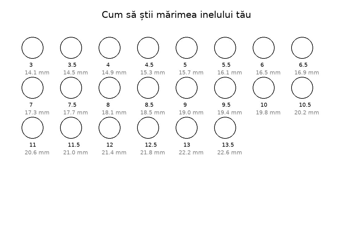 • Mărime: 7 (standard U.S.). Pentru a afla dimensiunea potrivită, măsurați un inel care vă vine bine și comparați rezultatul cu tabelul de mărimi disponibil în galeria foto.