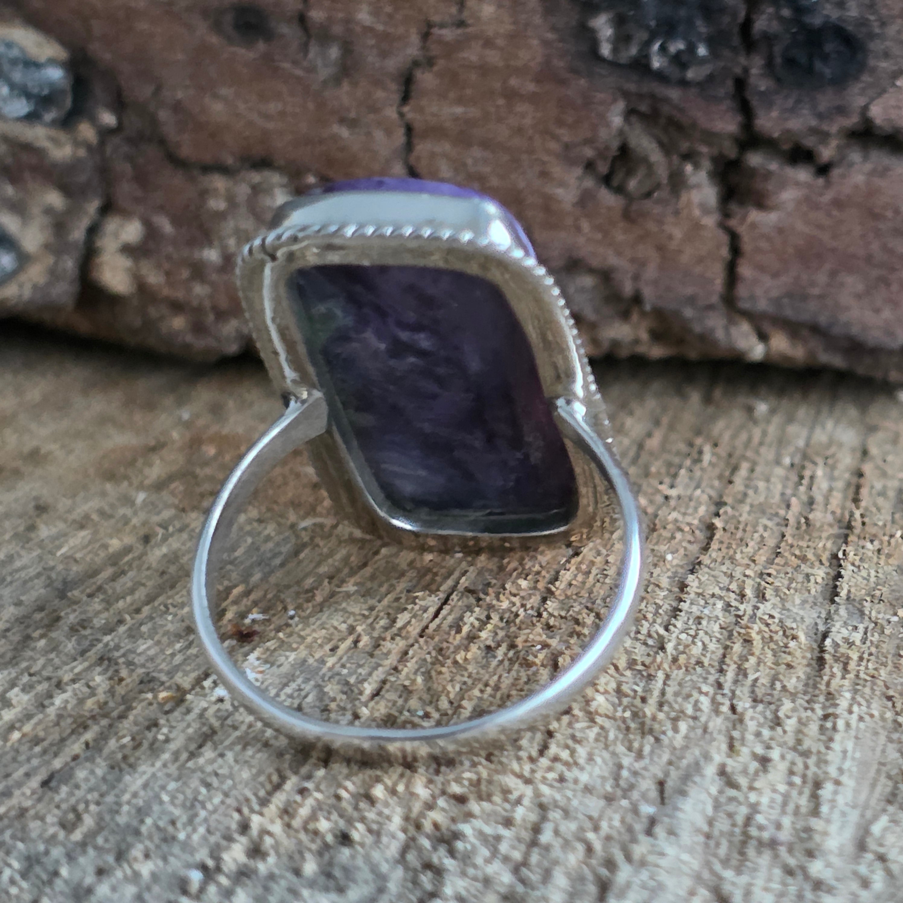 Un inel masiv, lucrat manual din argint 925, ce adăpostește o piatră naturală de Charoit, cu nuanțe vibrante de violet și reflexe mătăsoase ce amintesc de o pictură cosmică. Rama decorativă în stil twisted wire work adaugă profunzime și rafinament, echilibrând eleganța modernă cu măiestria tradițională.