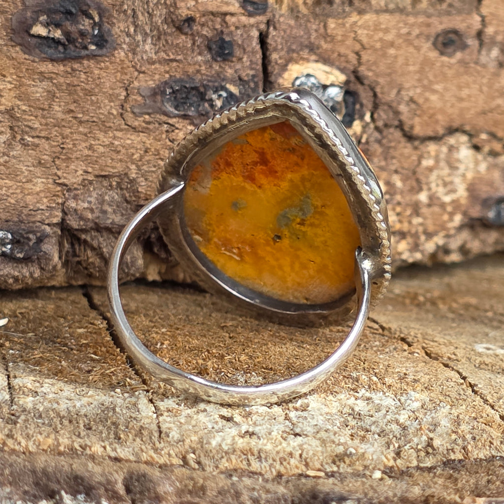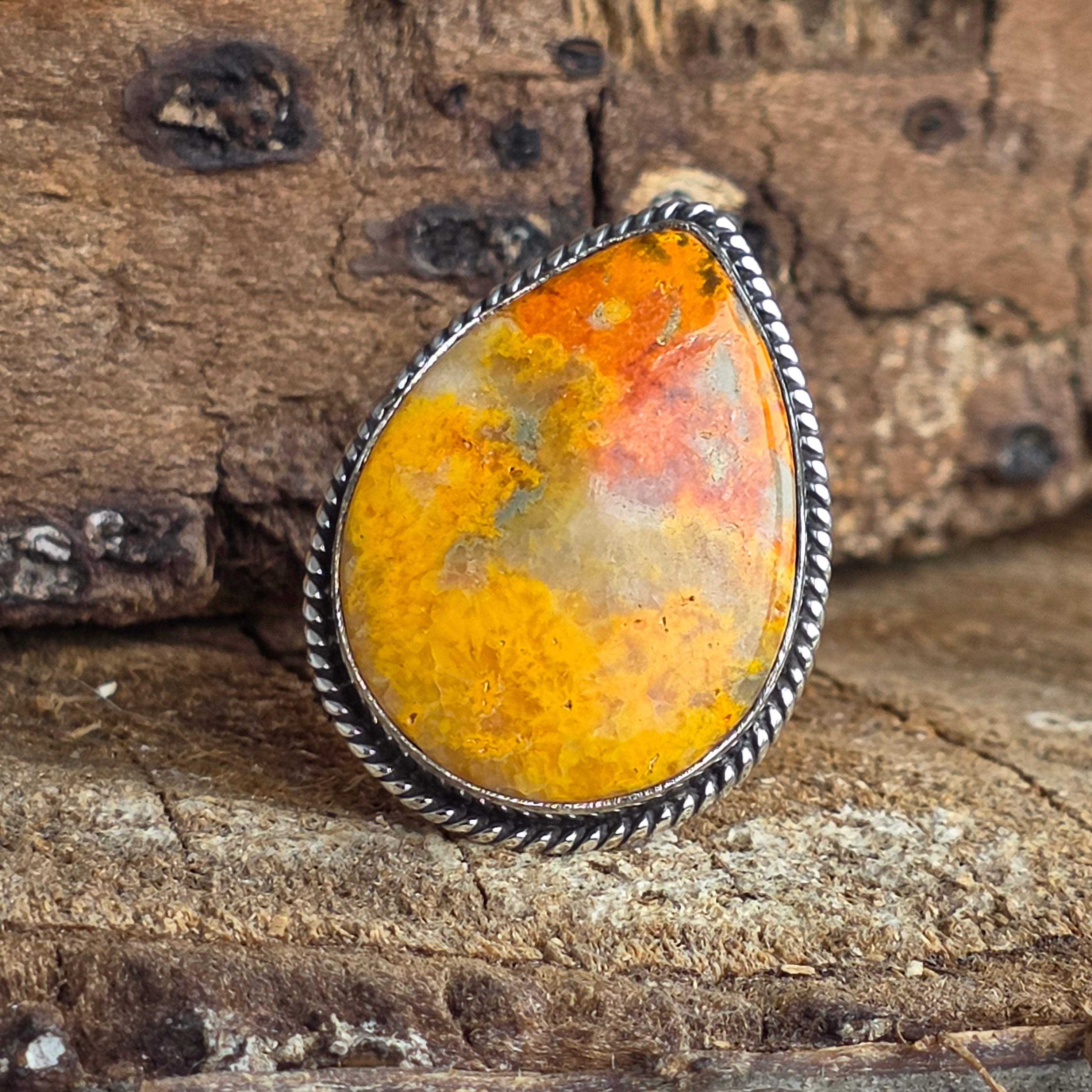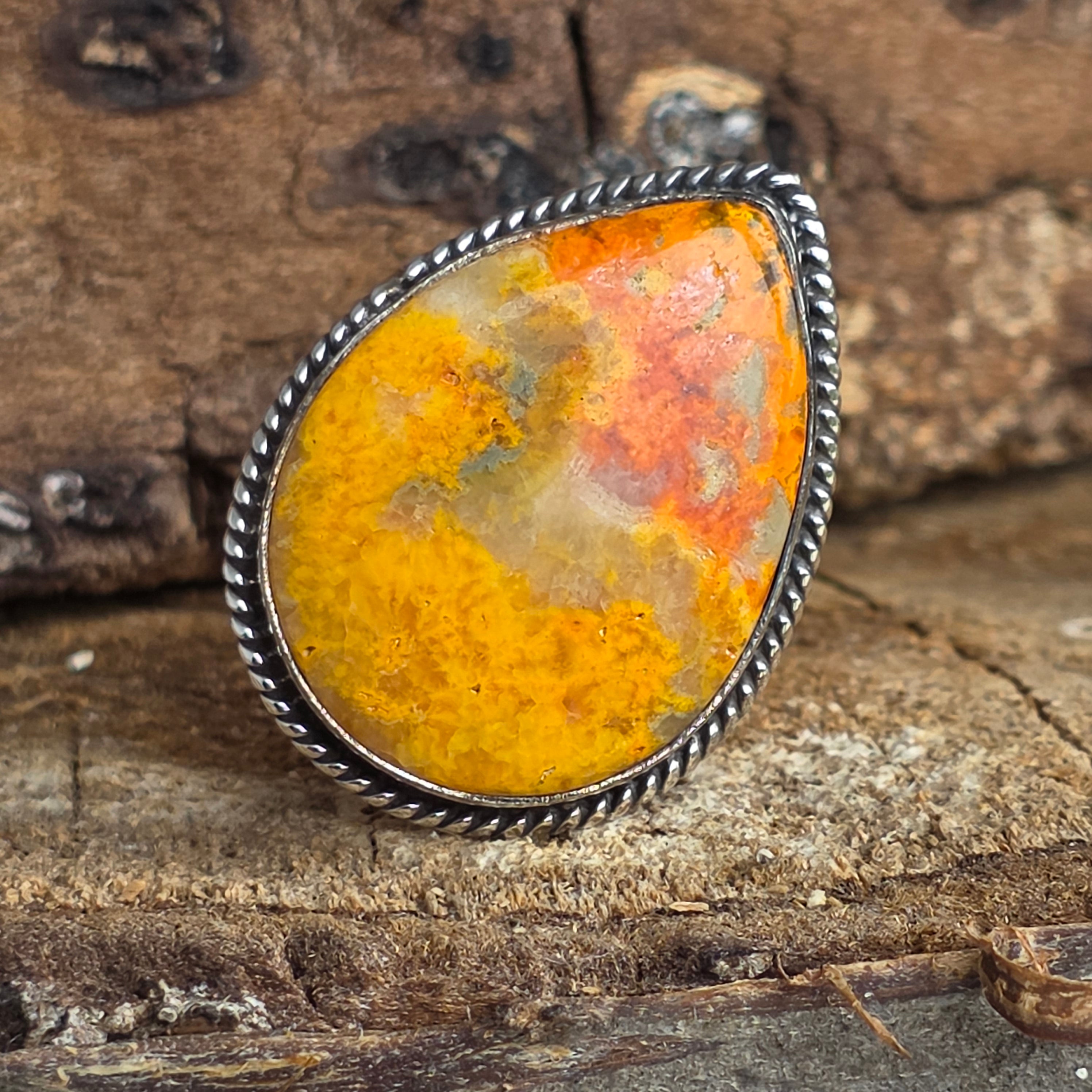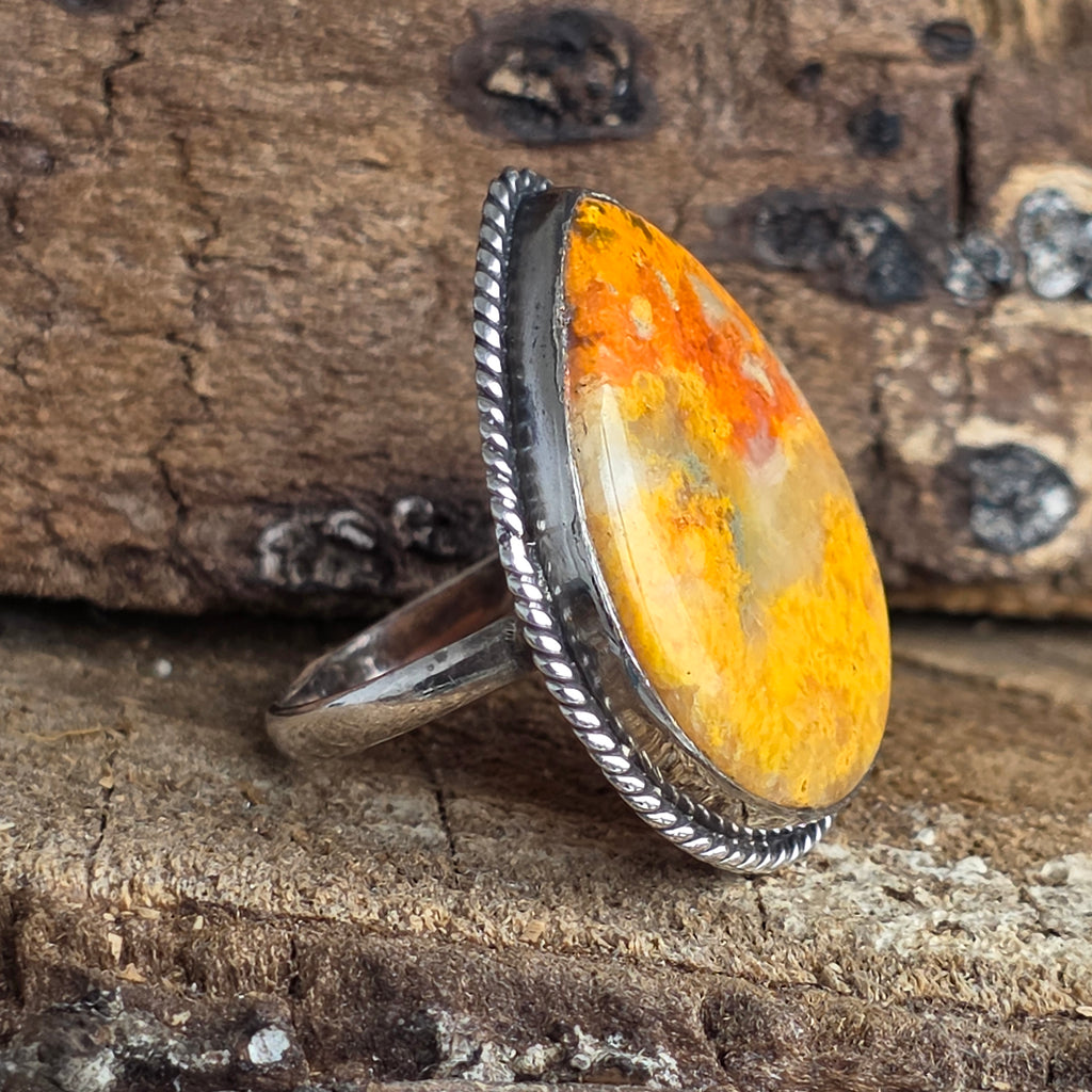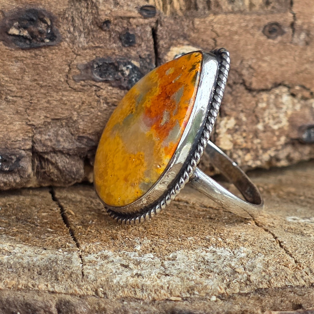Un inel spectaculos, realizat din argint 925, cu o piatră impresionantă de Bumblebee Jasper, cunoscută pentru amestecul vibrant de tonuri galbene, portocalii și gri-aurii. Modelul wire work lucrat manual încadrează piatra cu finețe, accentuându-i nuanțele calde și textura naturală.