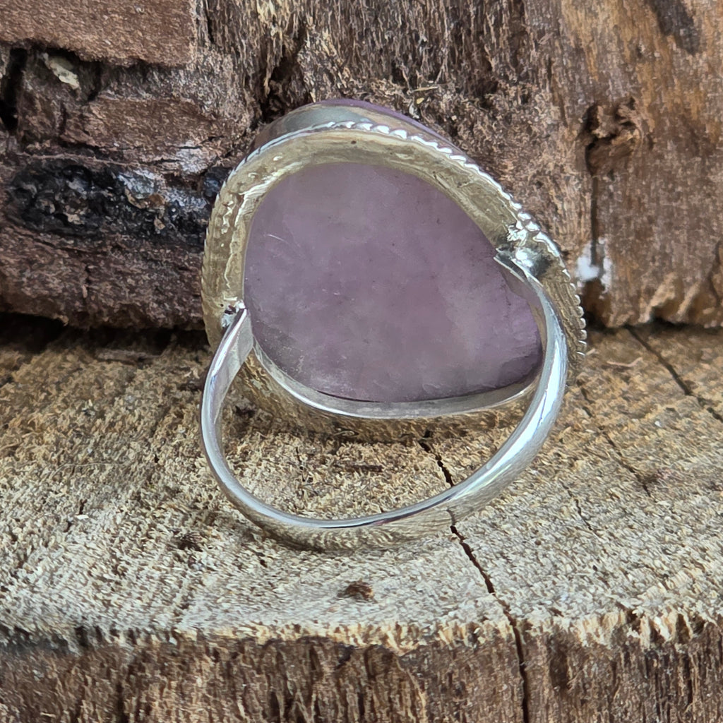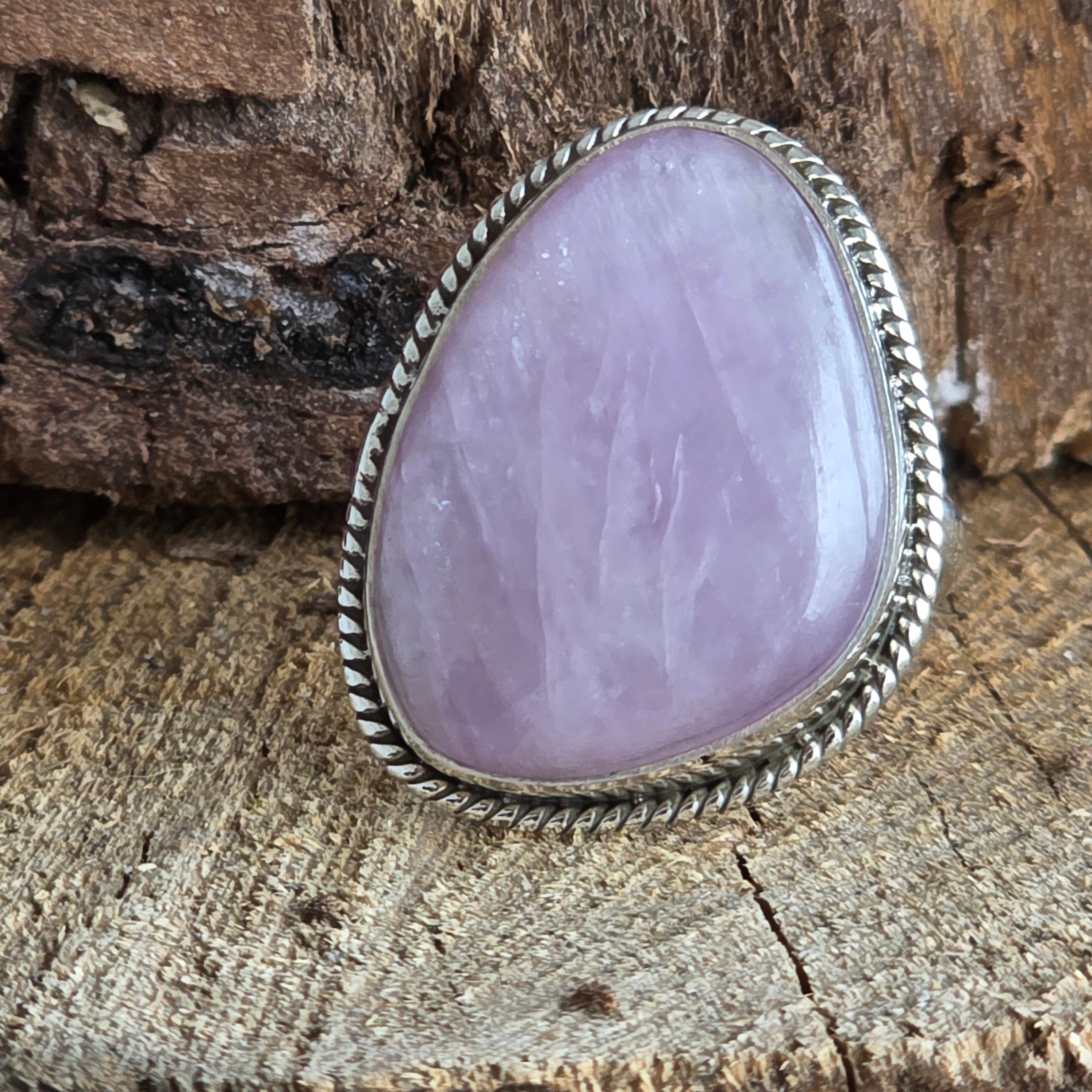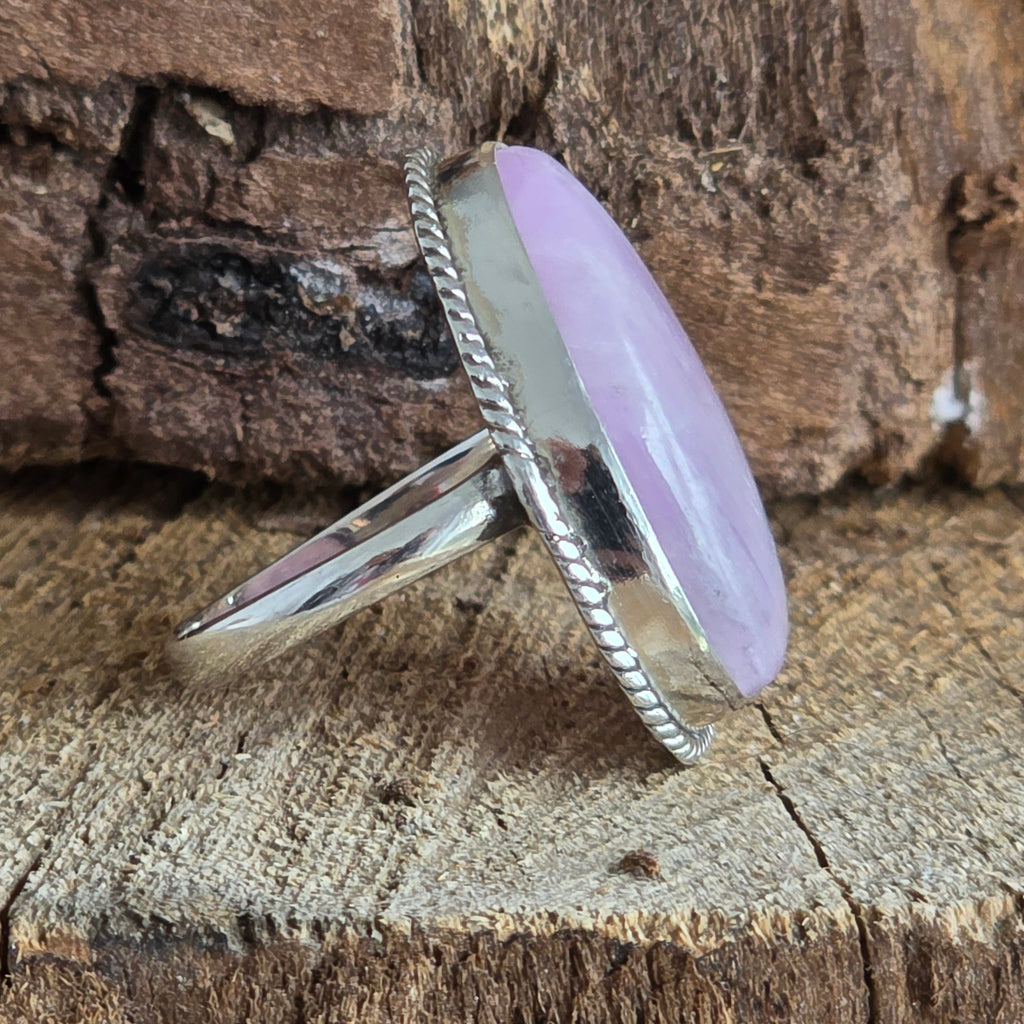 Un inel rafinat din argint 925, care poartă în centrul său delicatețea unei pietre de kunzit natural – cu tonuri fine de roz pal și reflexe translucide ce par să respire lumină.
