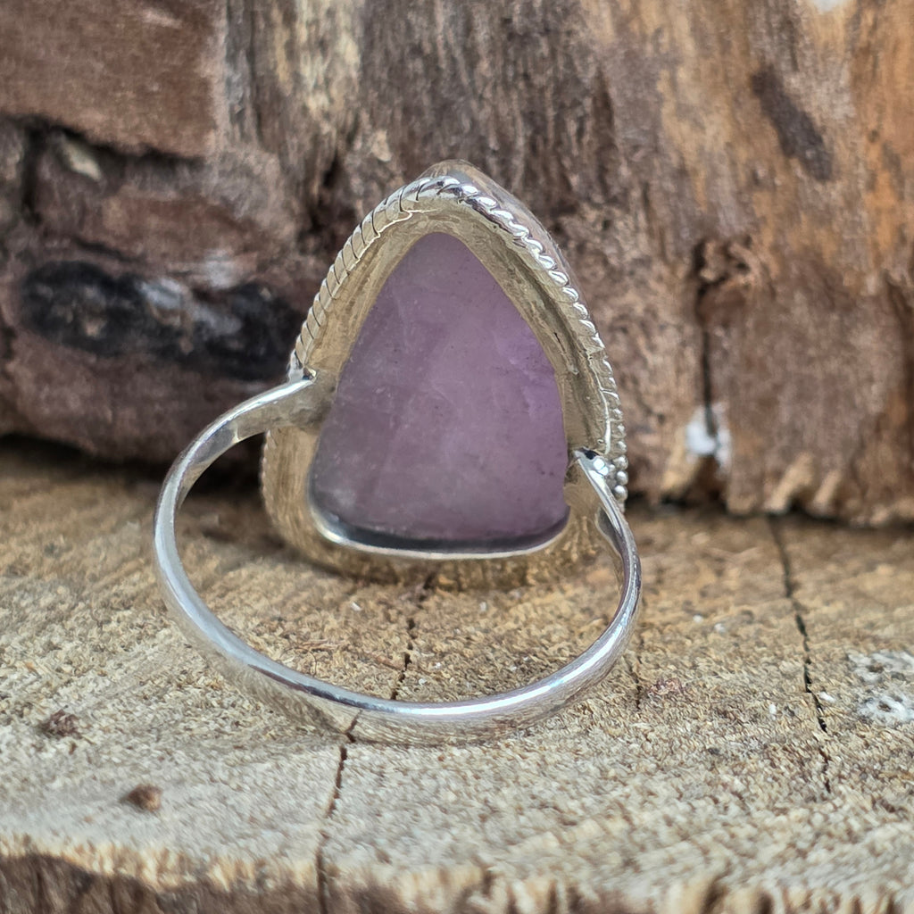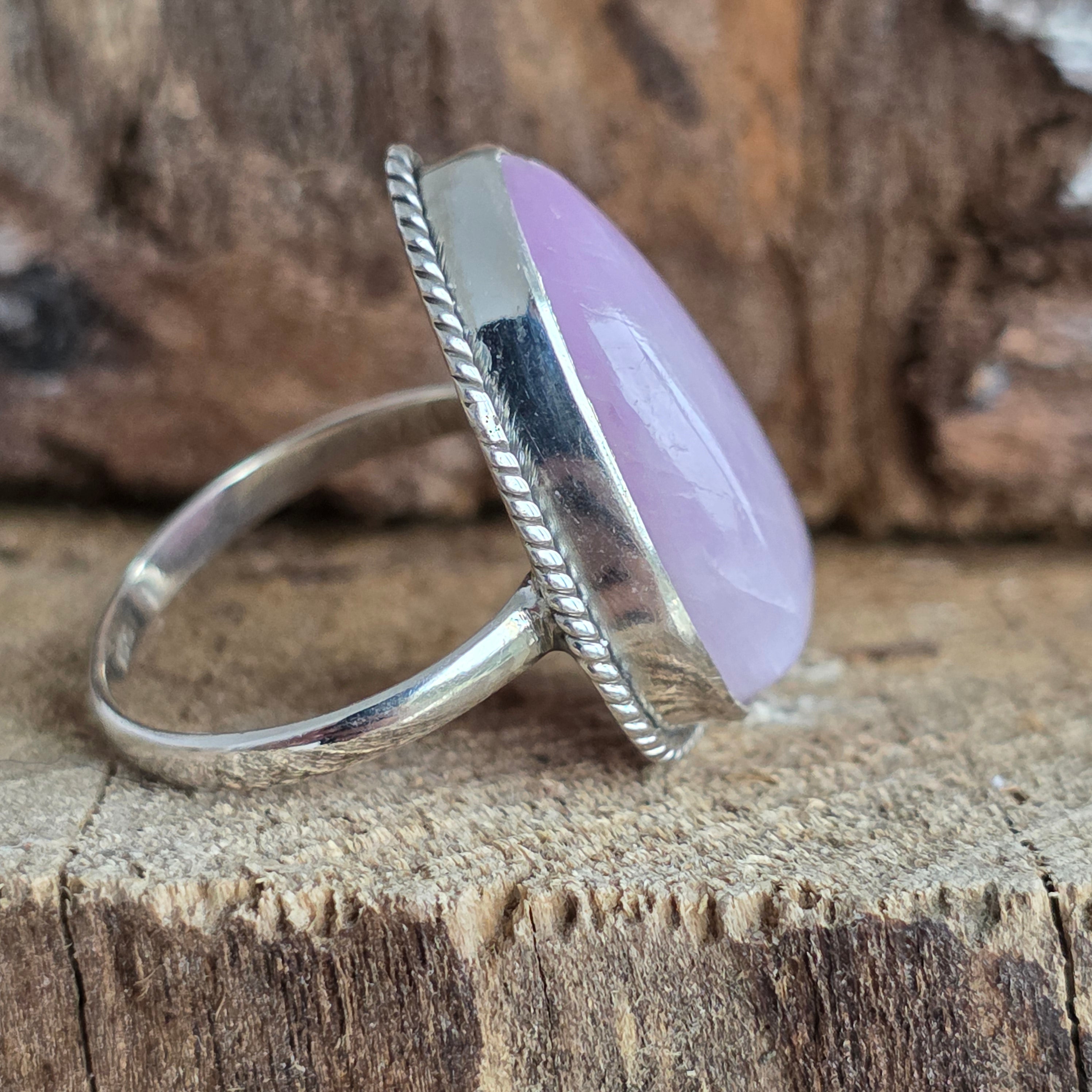 Un inel rafinat din argint 925, care poartă în centrul său delicatețea unei pietre de kunzit natural – cu tonuri fine de roz pal și reflexe translucide ce par să respire lumină.