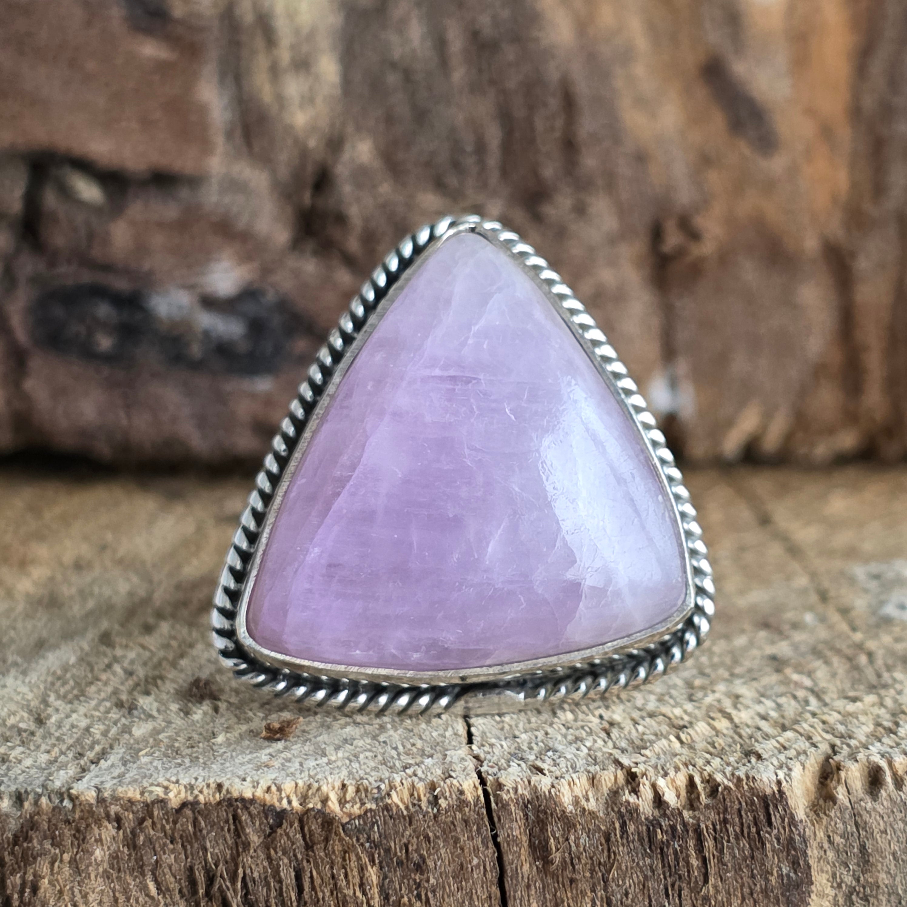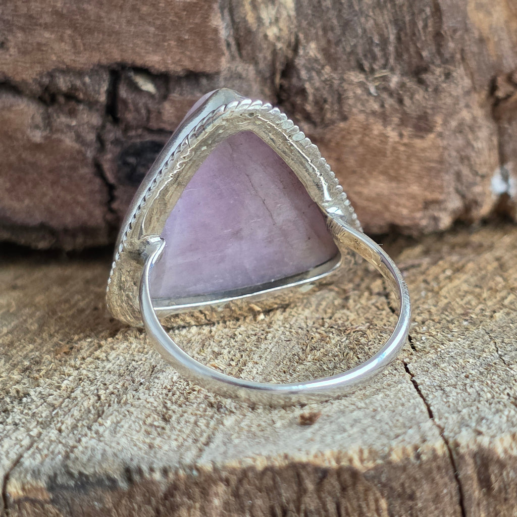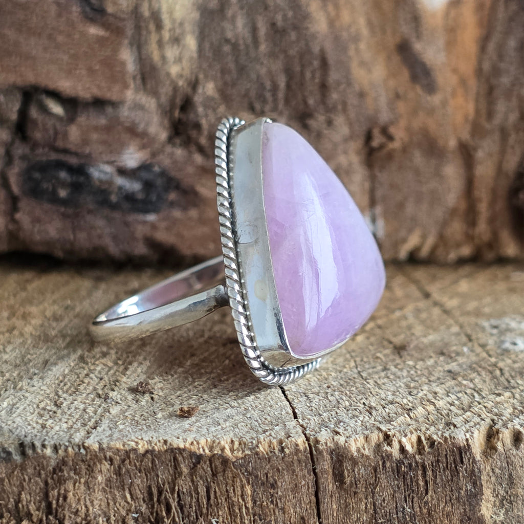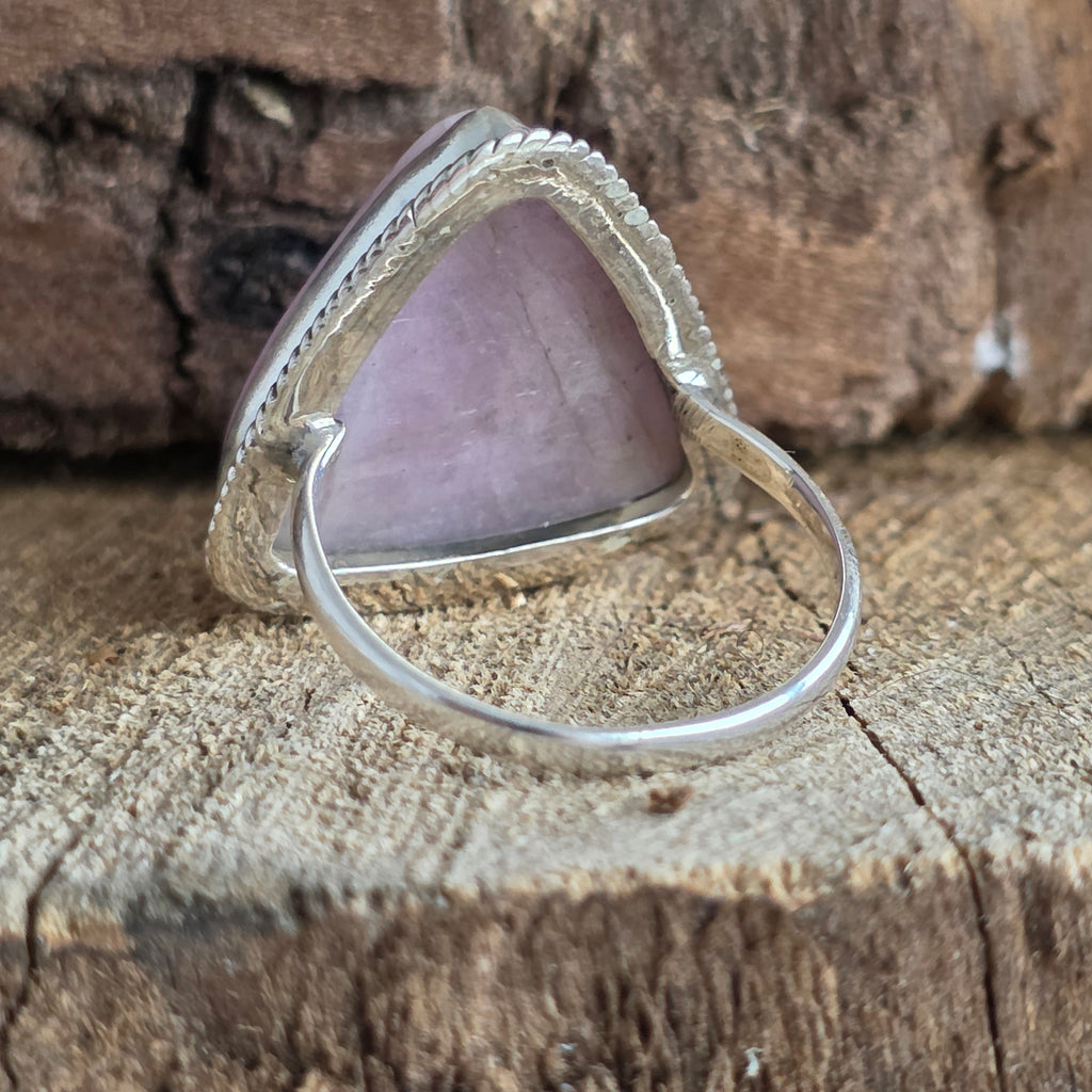 Un inel rafinat din argint 925, care poartă în centrul său delicatețea unei pietre de kunzit natural – cu tonuri fine de roz pal și reflexe translucide ce par să respire lumină.
