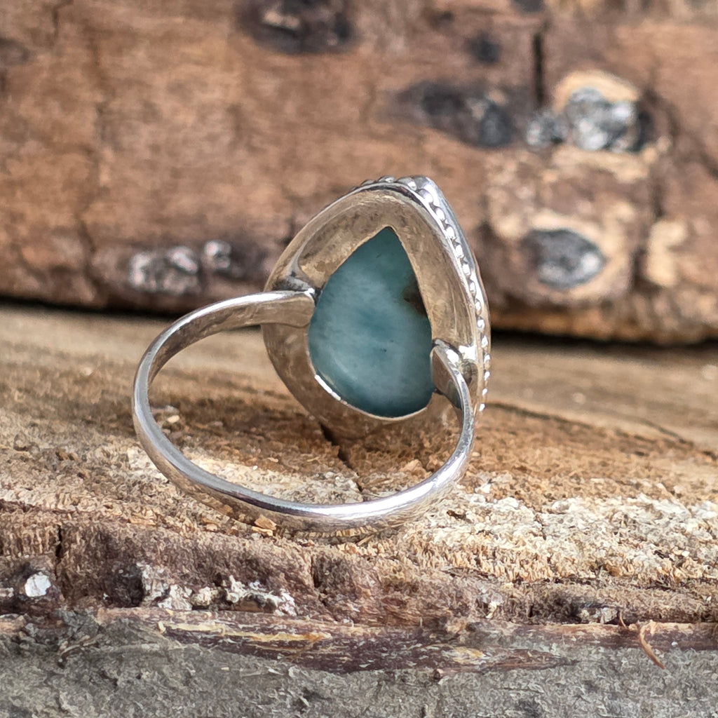 Un inel elegant din argint 925 cu larimar natural, în tonuri de albastru marin ce evocă apele Caraibelor. Detaliile rawa work lucrate manual adaugă profunzime și rafinament acestei bijuterii autentice.
