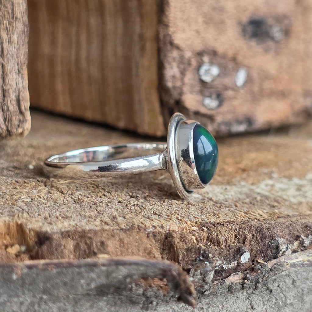 Un inel elegant și rafinat, realizat din argint 925, cu o piatră naturală de opal etiopian, cunoscută pentru reflexele sale irizante în nuanțe de verde, roșu și albastru. Designul minimalist plain wire setting permite pietrei să fie în centrul atenției, captând lumina din orice unghi.