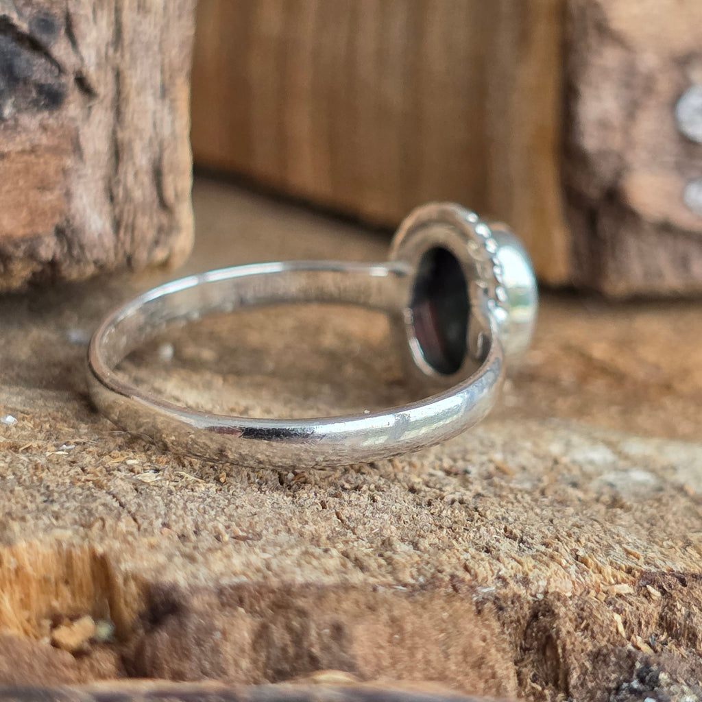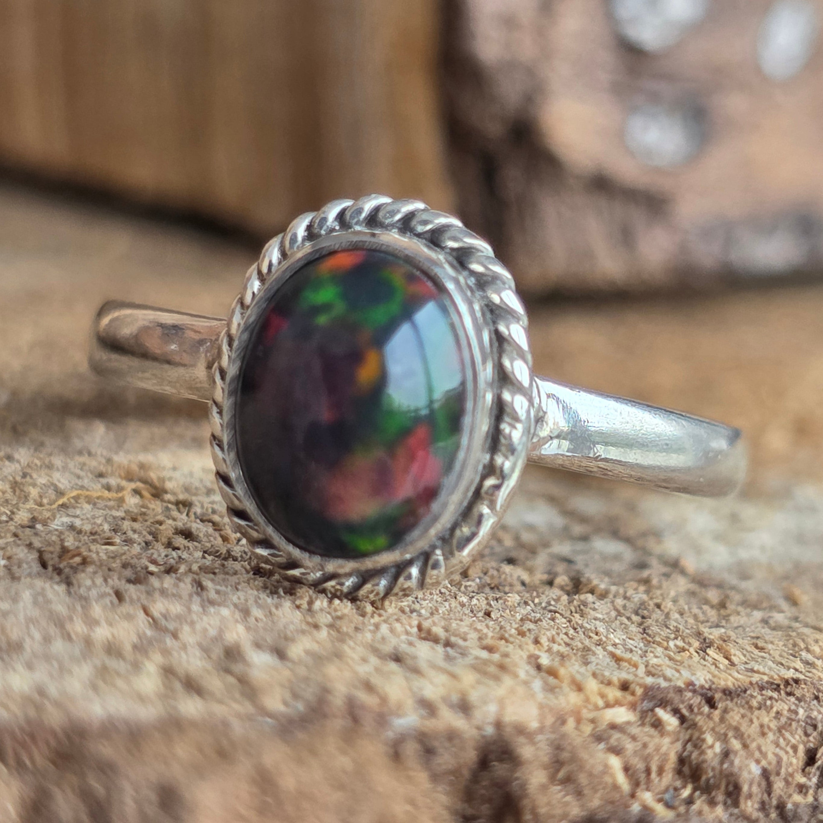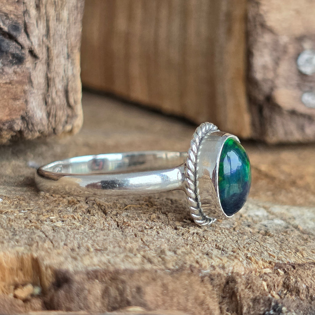 Un inel elegant și rafinat, realizat din argint 925, cu o piatră naturală de opal etiopian, cunoscută pentru reflexele sale irizante în nuanțe de verde, roșu și albastru. Designul minimalist plain wire setting permite pietrei să fie în centrul atenției, captând lumina din orice unghi.