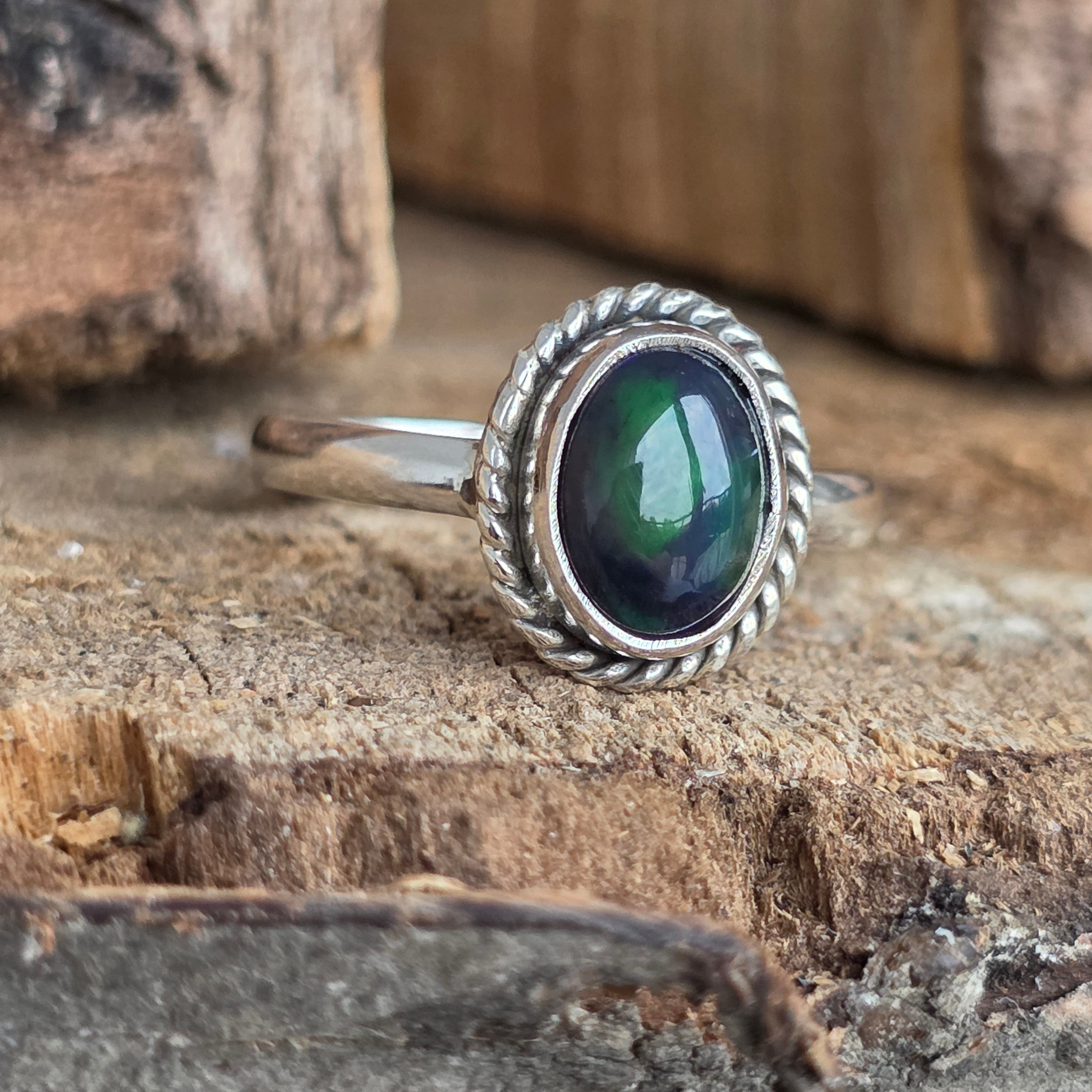 Un inel elegant și rafinat, realizat din argint 925, cu o piatră naturală de opal etiopian, cunoscută pentru reflexele sale irizante în nuanțe de verde, roșu și albastru. Designul minimalist plain wire setting permite pietrei să fie în centrul atenției, captând lumina din orice unghi.