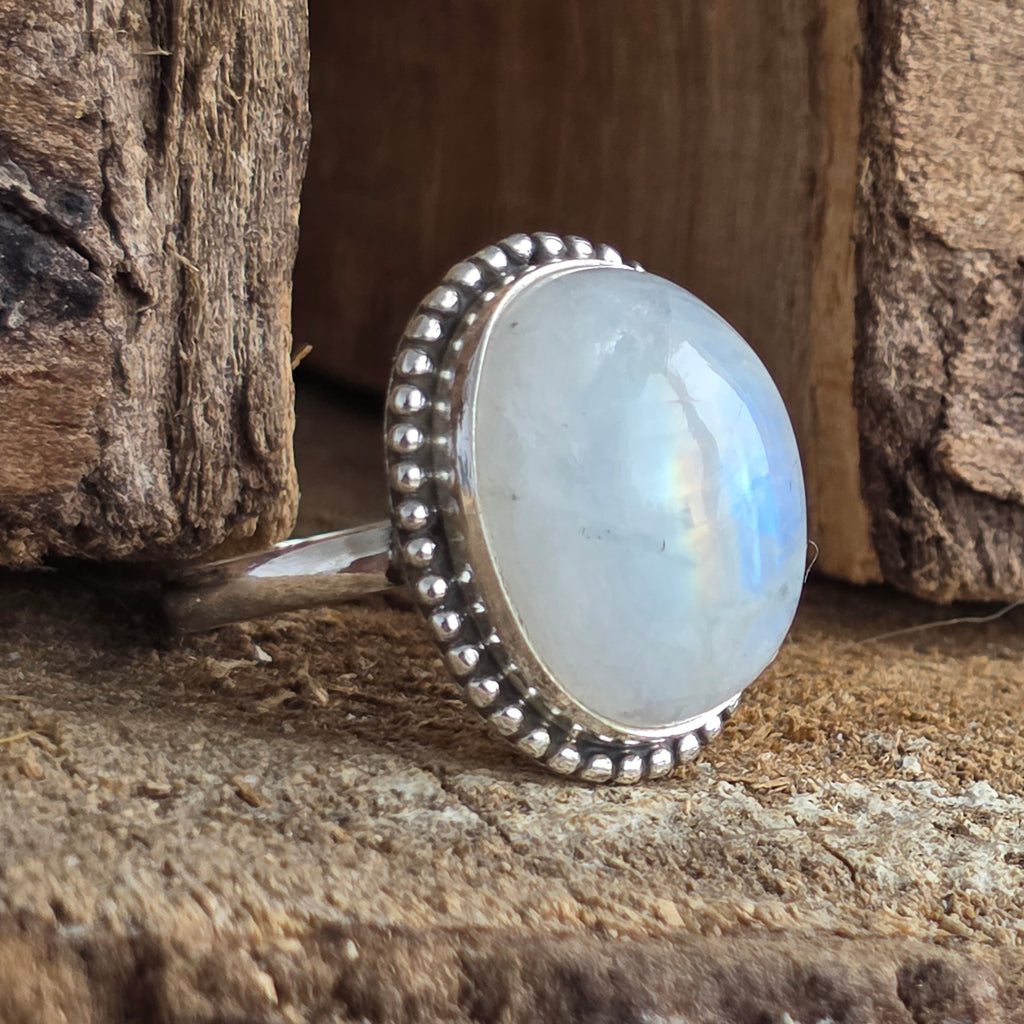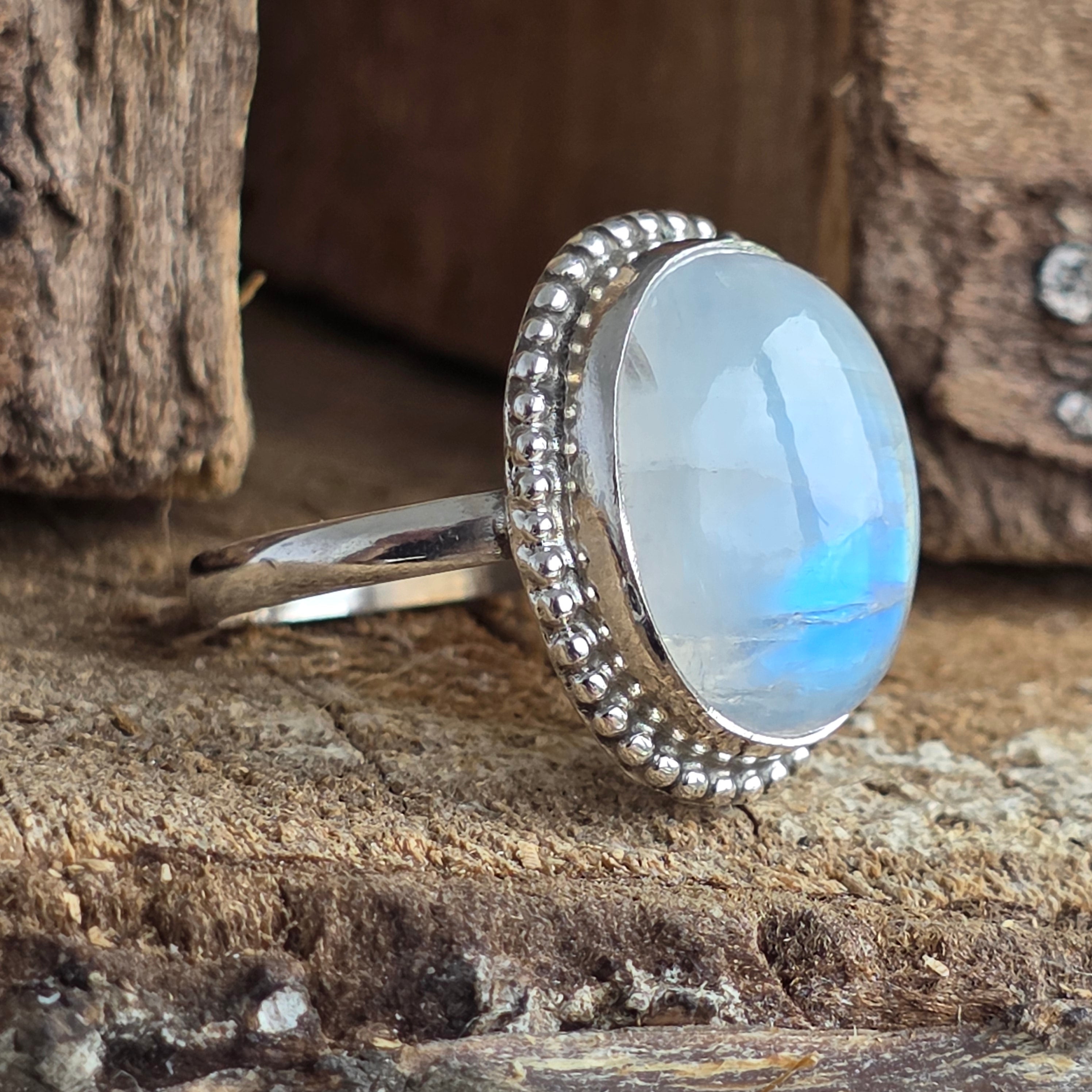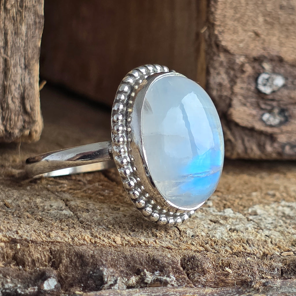 Un inel superb din argint 925, cu piatră lunii curcubeu naturală, recunoscută pentru reflexele sale albastre și perlate care dansează la fiecare mișcare. Designul rawa work, lucrat manual, accentuează eleganța pietrei și adaugă un aer sofisticat și boem în același timp.