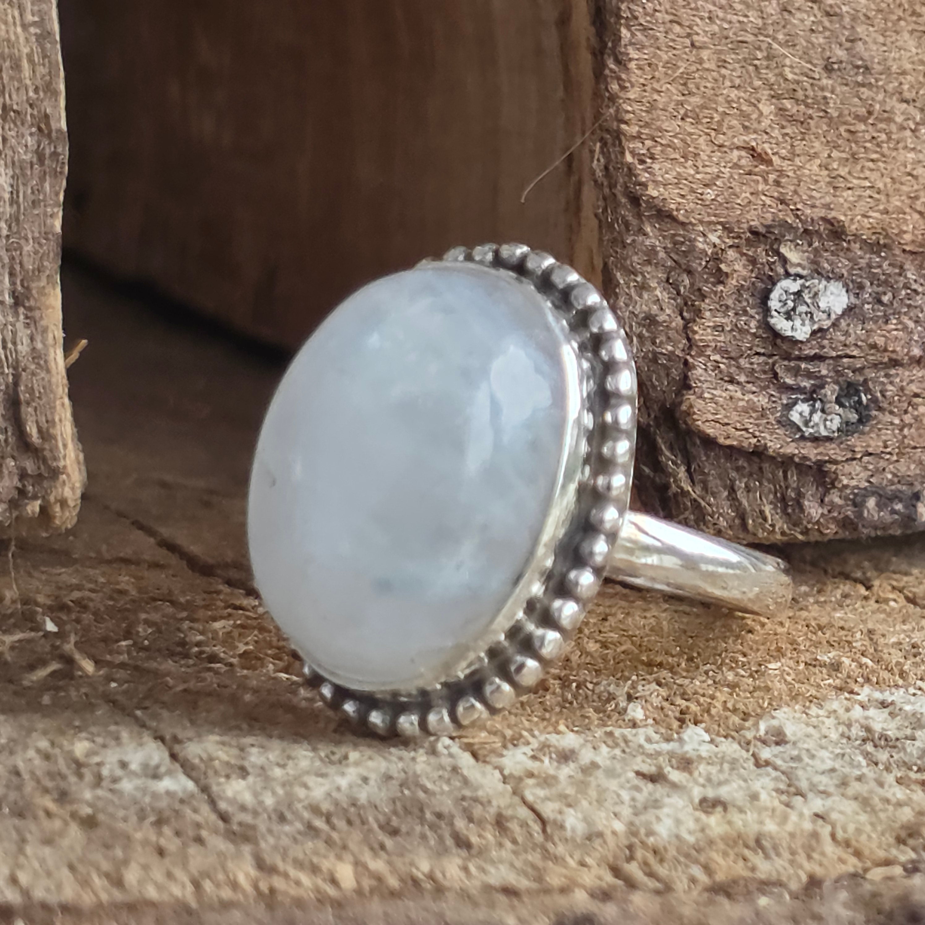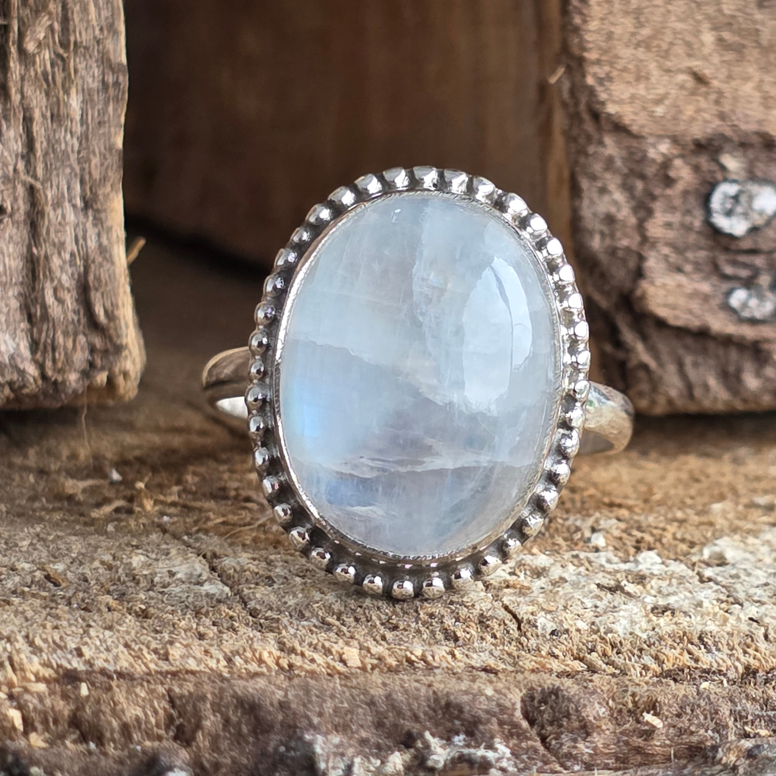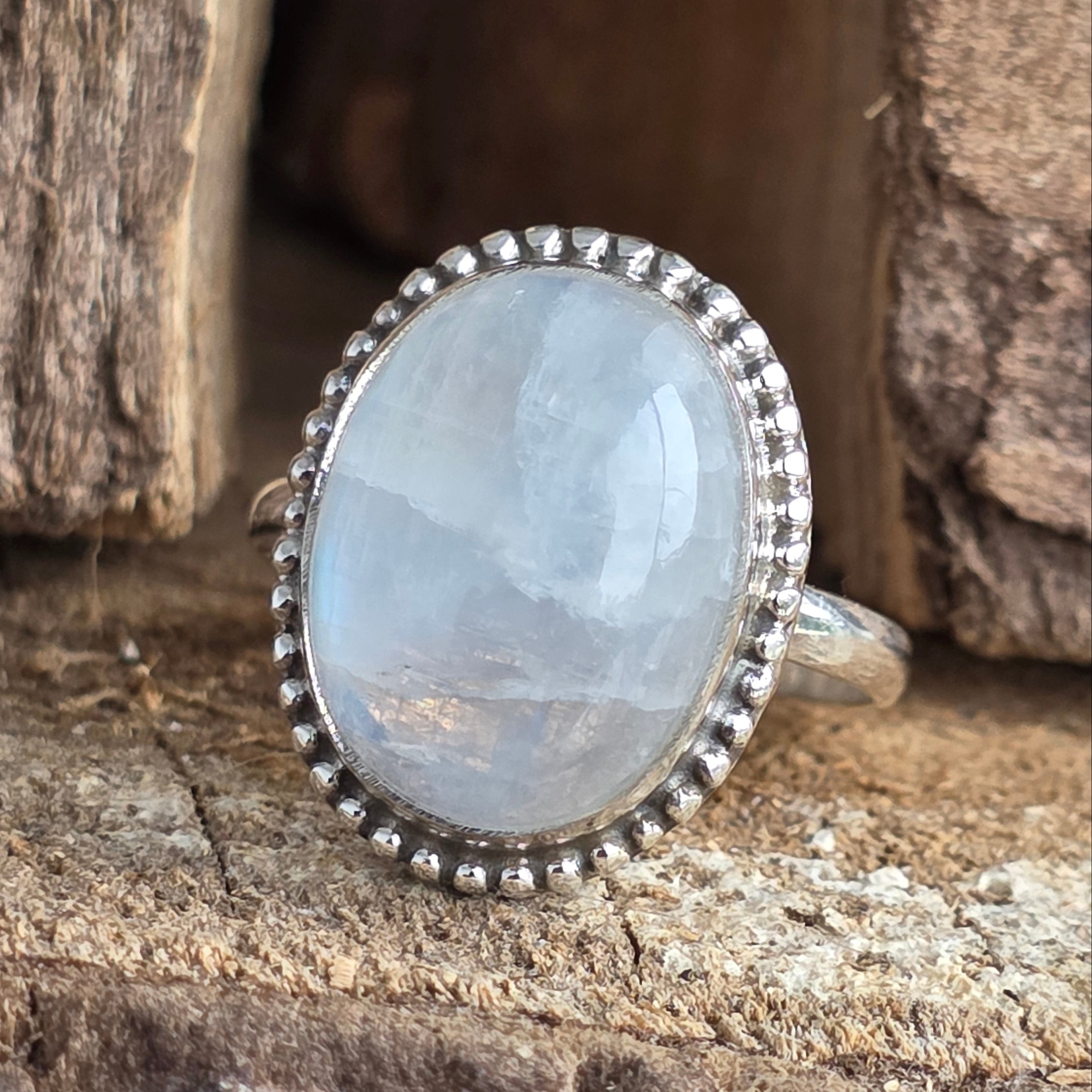 Un inel superb din argint 925, cu piatră lunii curcubeu naturală, recunoscută pentru reflexele sale albastre și perlate care dansează la fiecare mișcare. Designul rawa work, lucrat manual, accentuează eleganța pietrei și adaugă un aer sofisticat și boem în același timp.