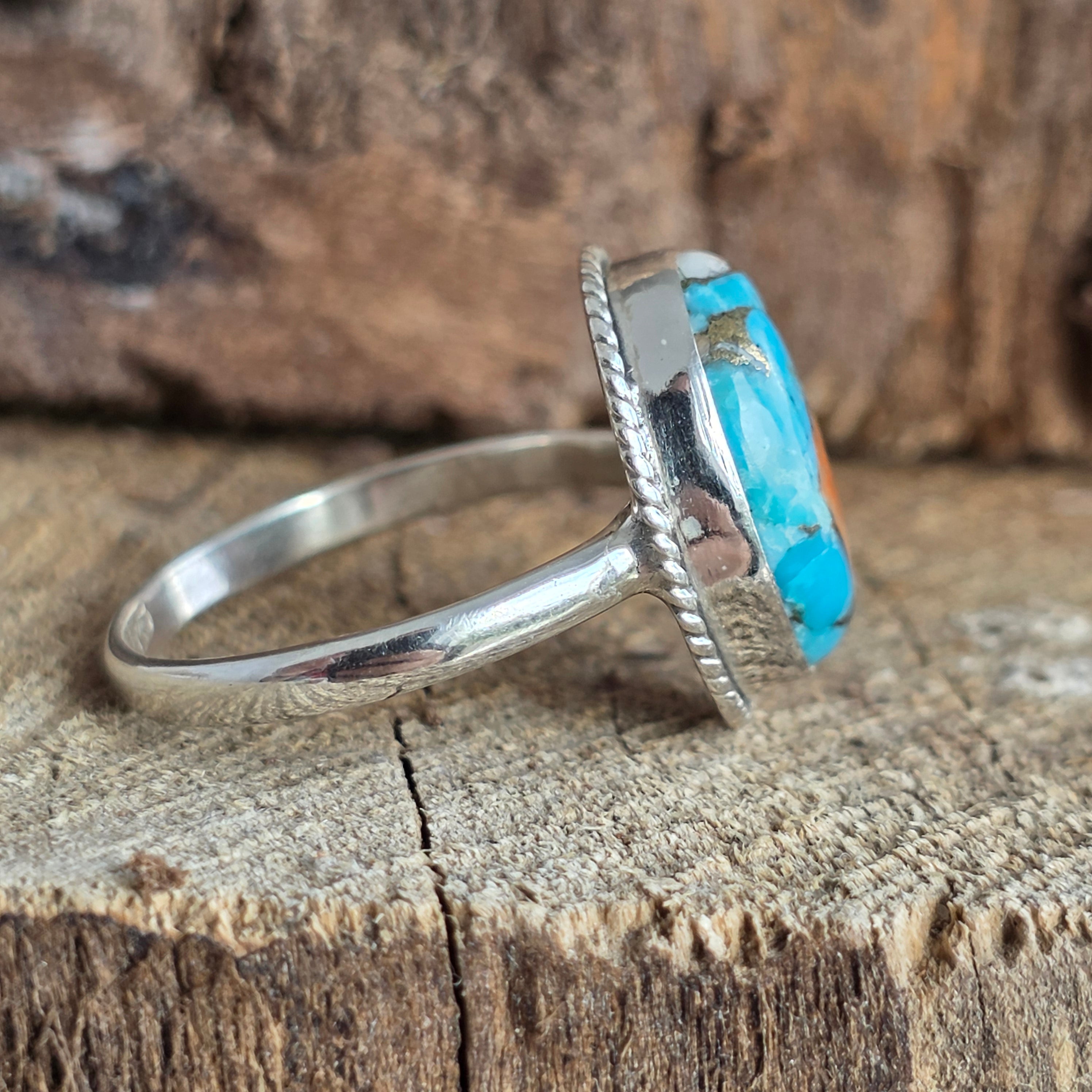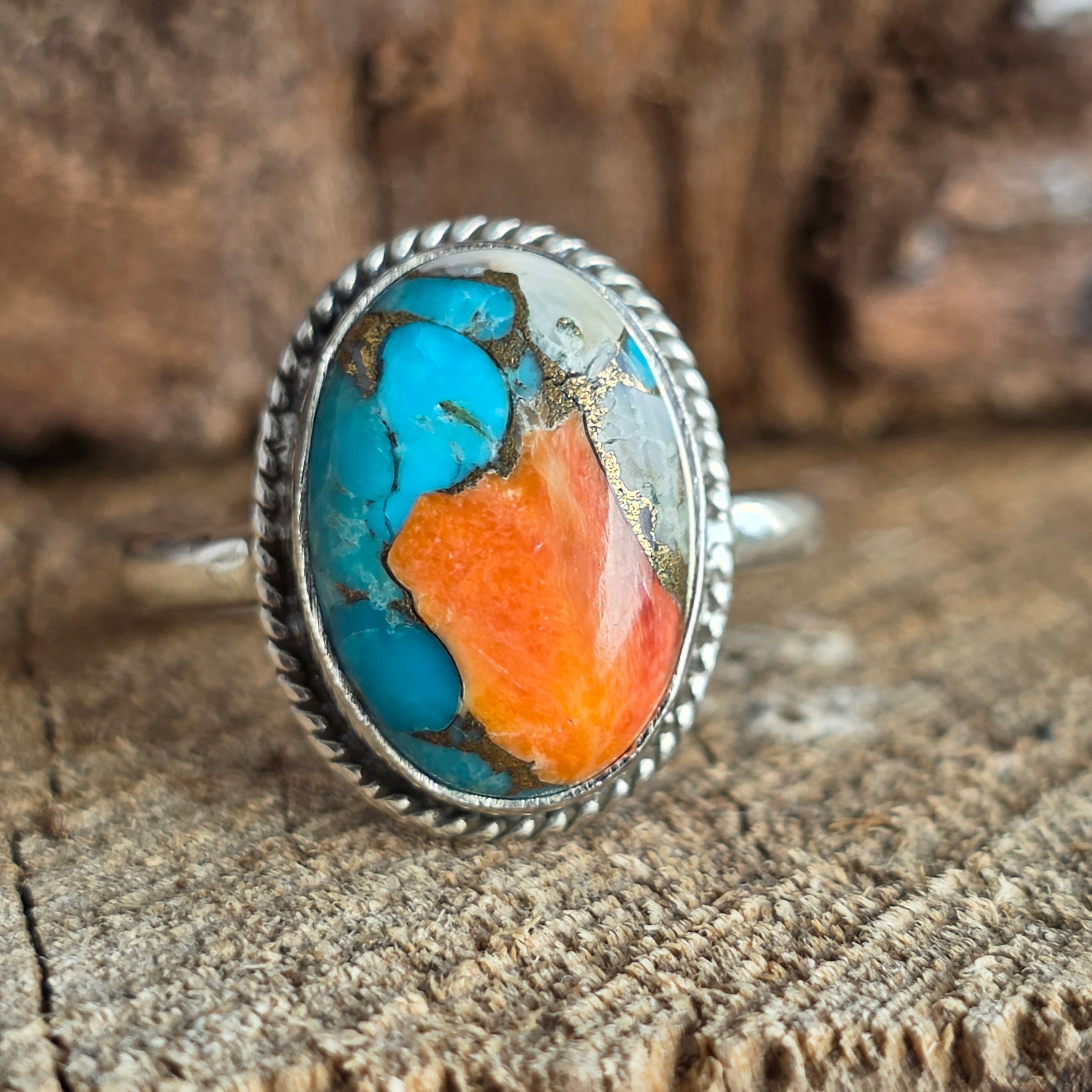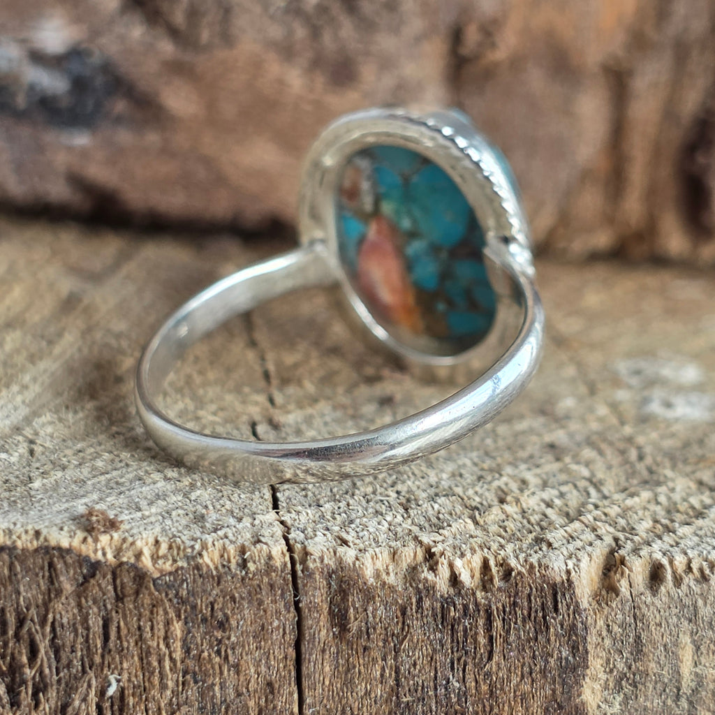 Acest inel din argint 925 aduce în prim-plan o piatră fascinantă – Oyster Copper Turquoise, o combinație naturală de turcoaz, scoică și inserții fine de cupru, ce creează un mozaic viu de culori: albastru cer, portocaliu coral, alb sidefat și reflexe metalice aurii.