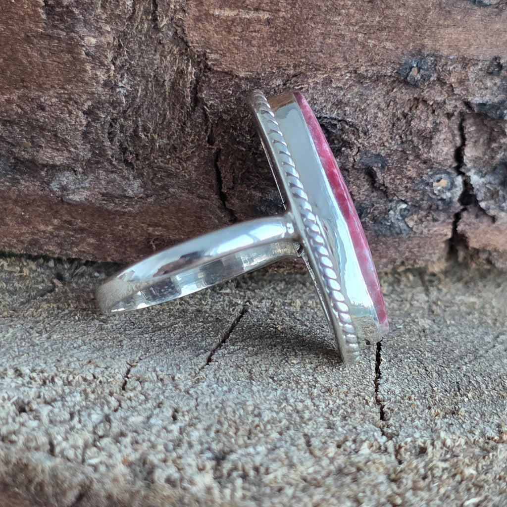 Un inel din argint 925 ce poartă în sine energia pământului nordic – Tulitul, o varietate roz de zoisit, cu textură naturală și variații fine de culoare între roz somon, fucsia și alb calcaros.