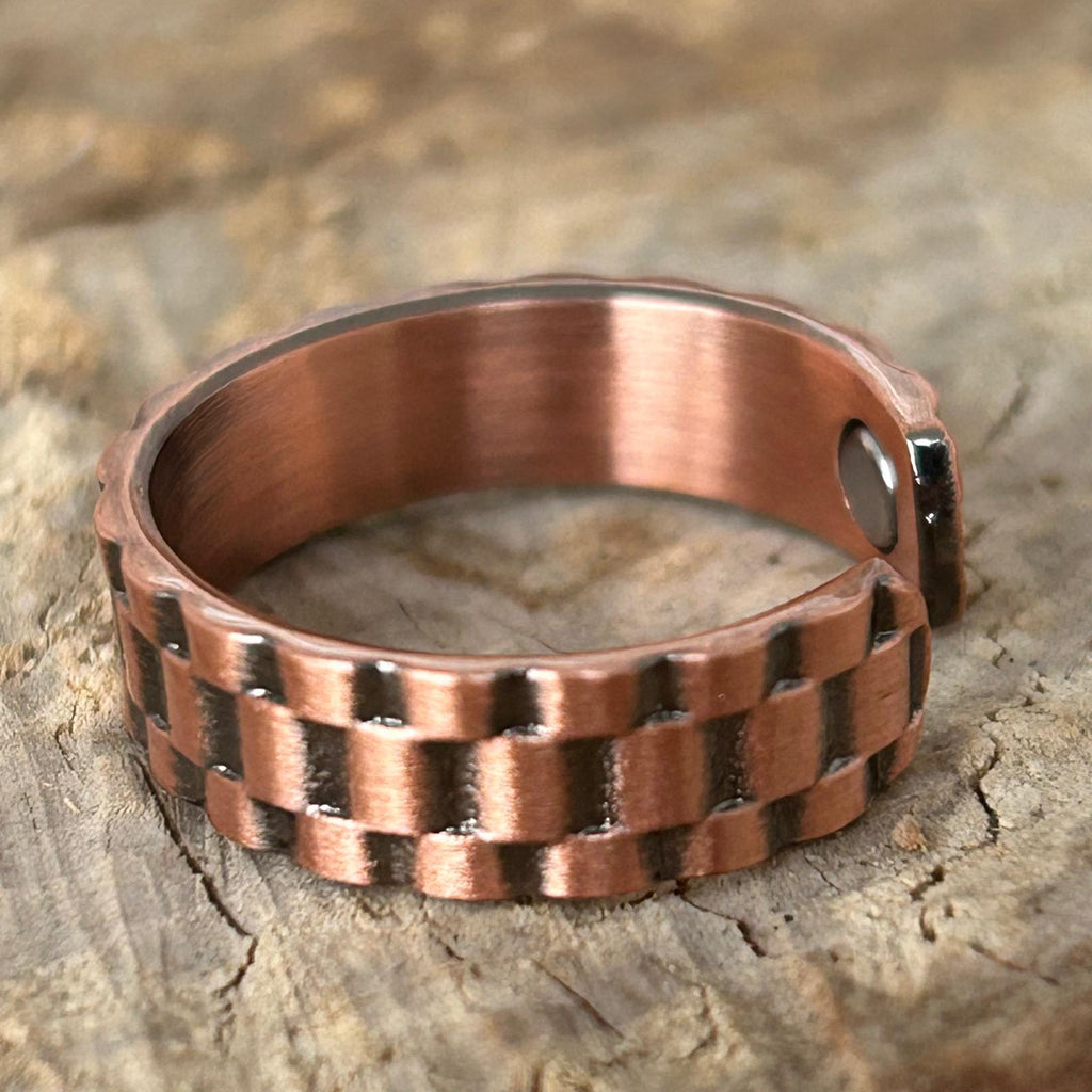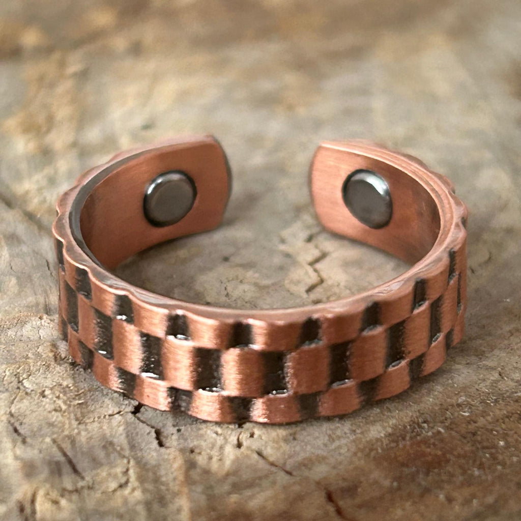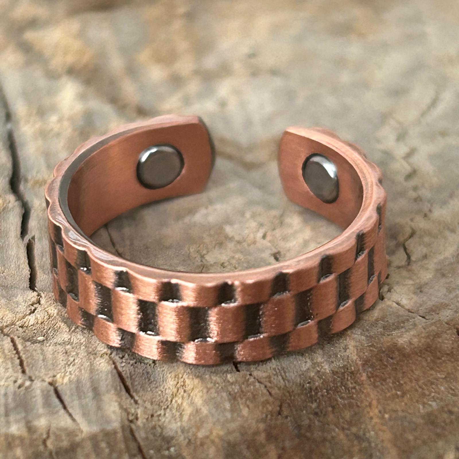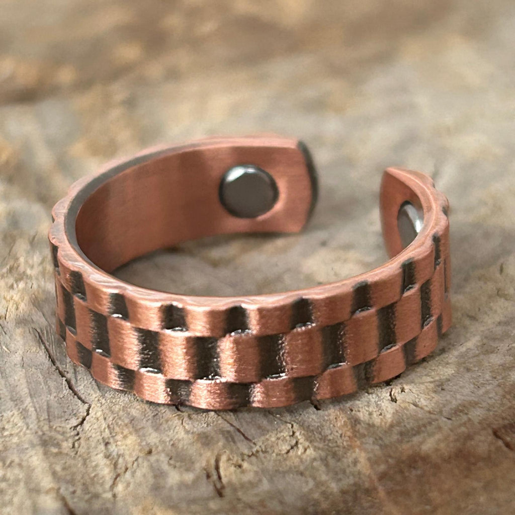 Cuprul, purtat din vechime ca metal protector și vindecător, este considerat un catalizator al energiei vitale și al echilibrului interior. În combinație cu forma ajustabilă, inelul devine nu doar o bijuterie, ci și un simbol al adaptabilității și al curgerii armonioase prin viață.