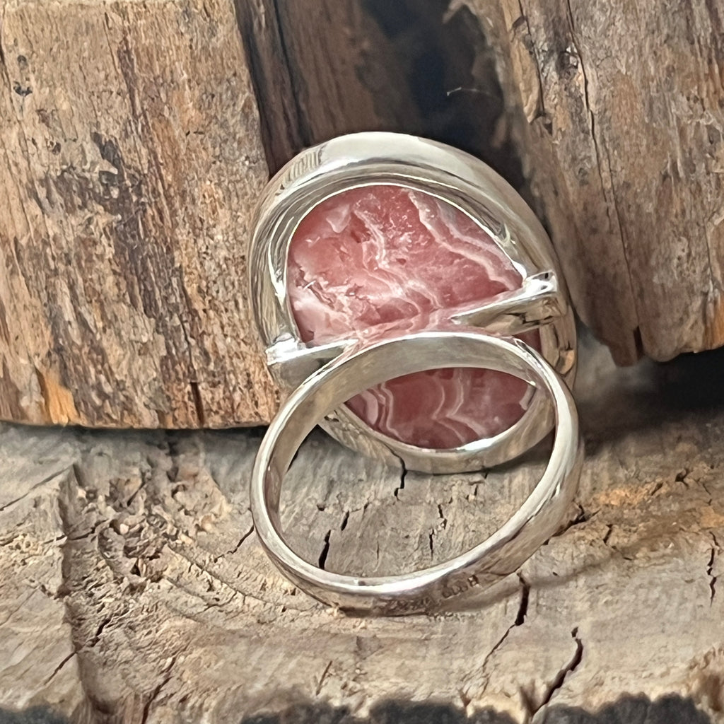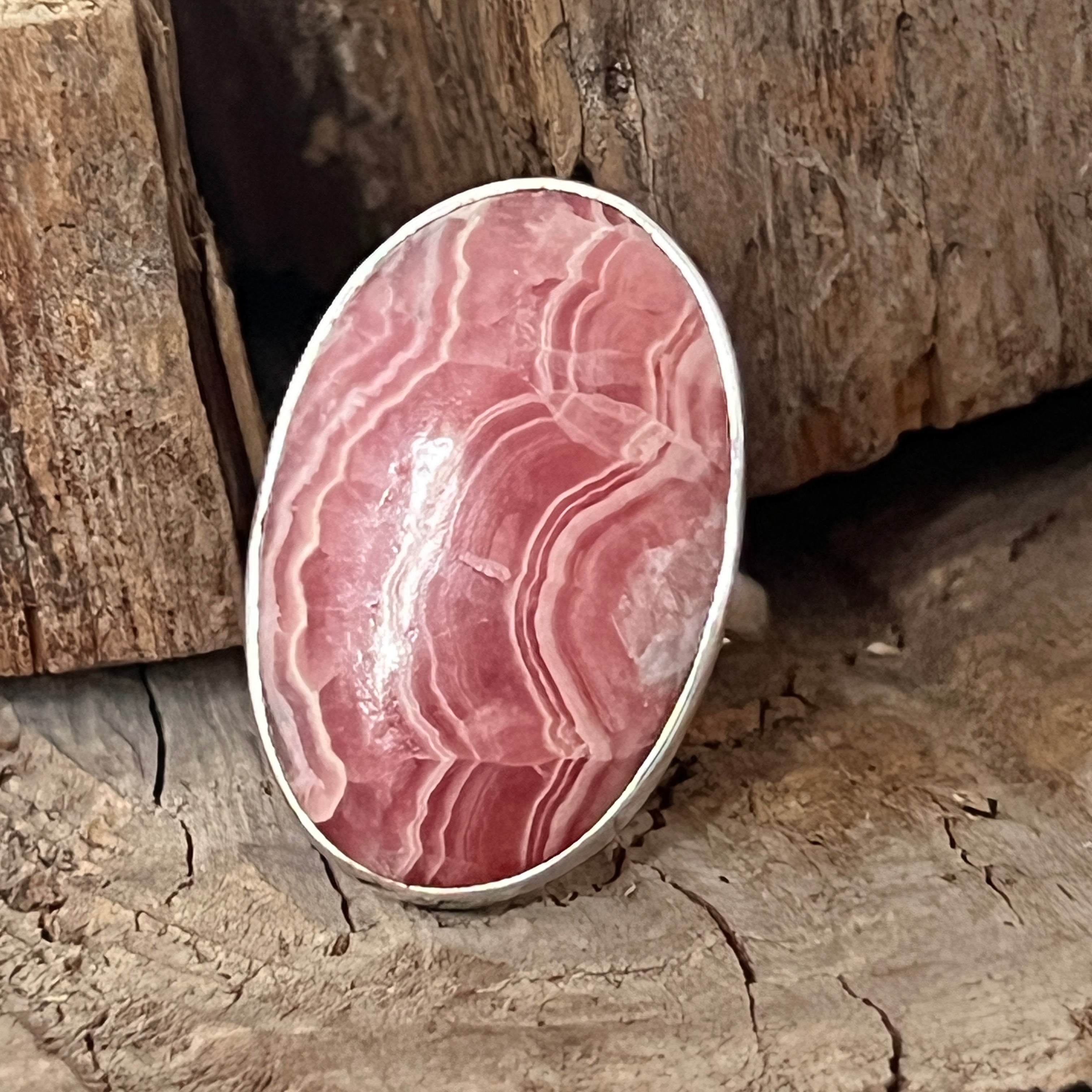Acest inel cu rodocrozit natural montat în argint 925 este o piesă deosebită, care îmbină frumusețea pietrei cu eleganța clasică a argintului. Fiecare inel este unic, datorită striațiilor roz-coral specifice rodocrozitului, ceea ce îl face o adevărată bijuterie de colecție.