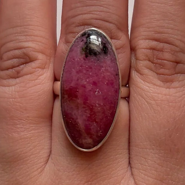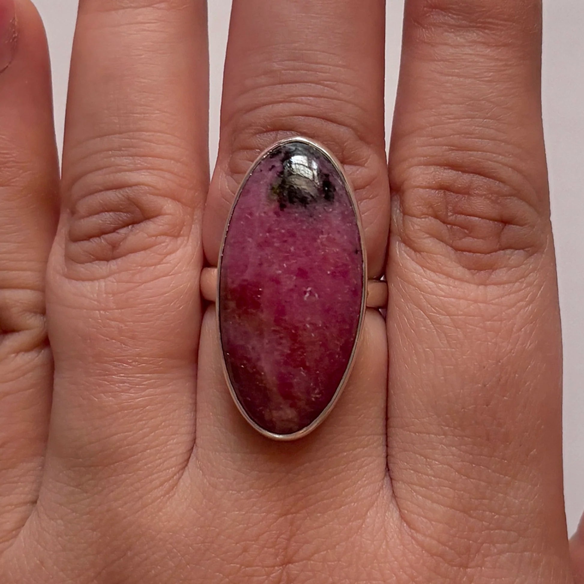 Acest inel din argint 925 cu rodonit este o bijuterie deosebită, în care rozul intens al pietrei se îmbină cu nuanțe naturale mai închise, rezultând un joc cromatic elegant și plin de personalitate. Forma ovală alungită îi conferă rafinament și îl transformă într-o piesă statement, ideală pentru cei care caută un accesoriu original și autentic.
