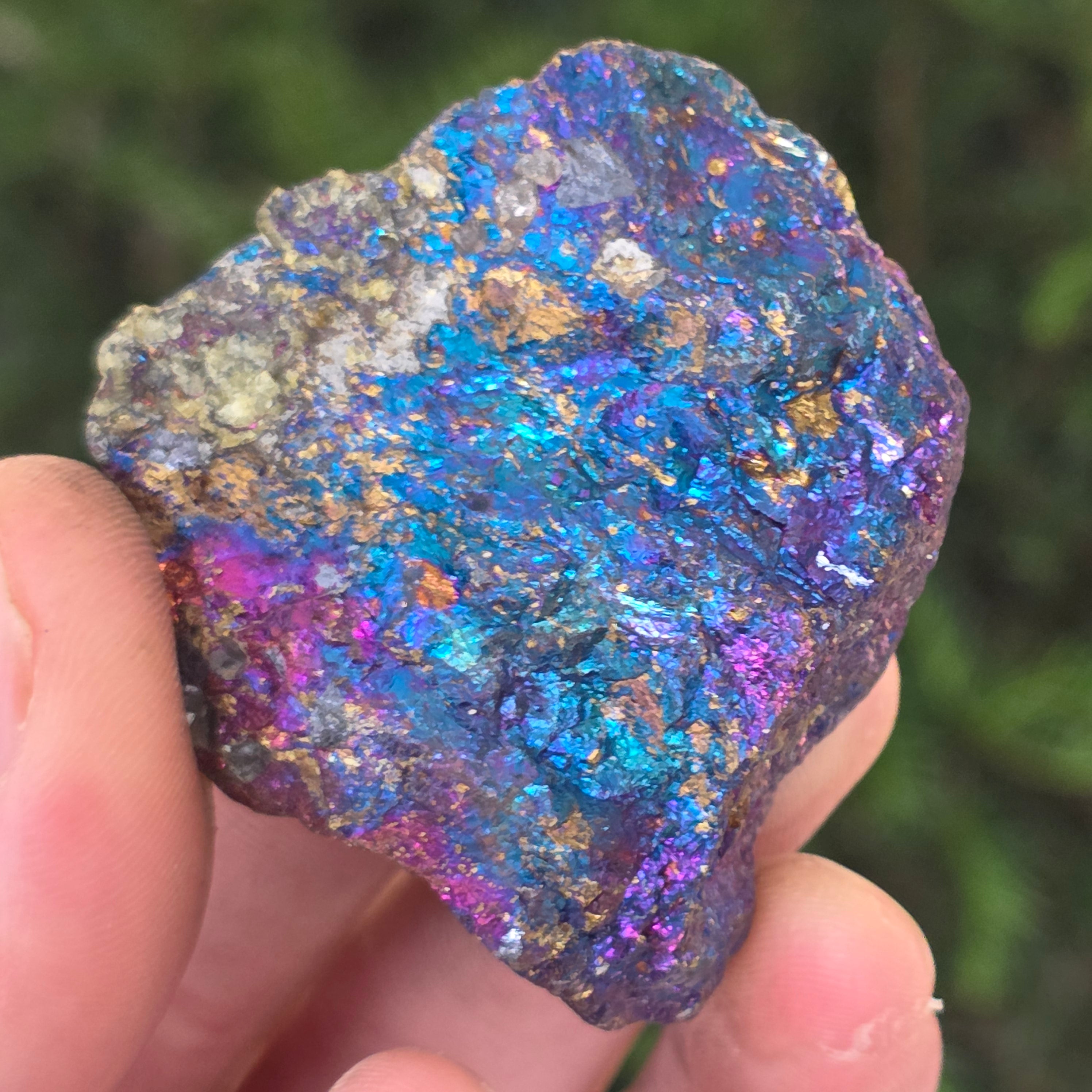 Blue chalcopyrite, also known as Iridescent chalcopyrite, is a type of chalcopyrite that exhibits bright shades of blue, purple, green, or other iridescent colors. This iridescence is caused by a thin layer of oxidation on the surface of the mineral, a natural process that occurs when chalcopyrite is exposed to air and moisture for an extended period.
