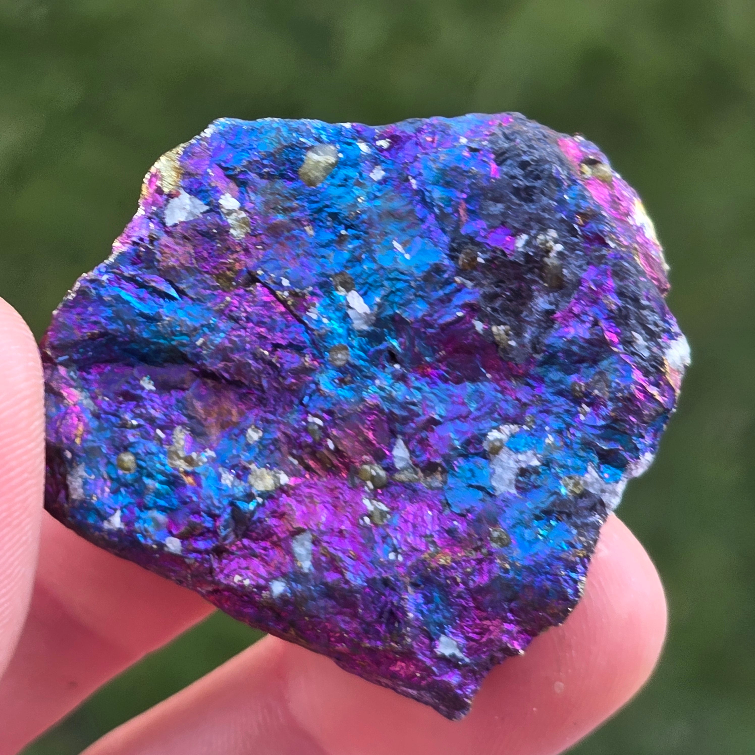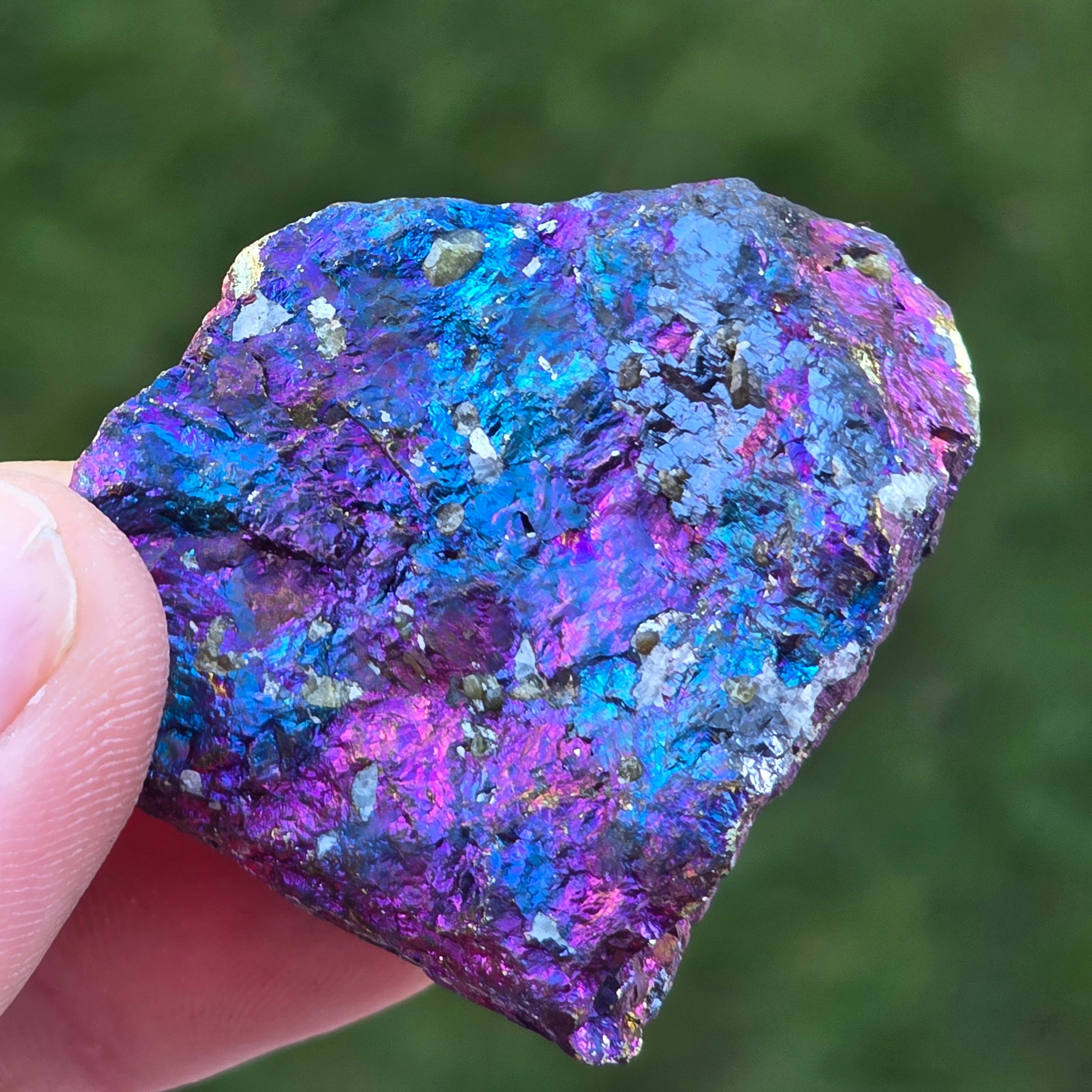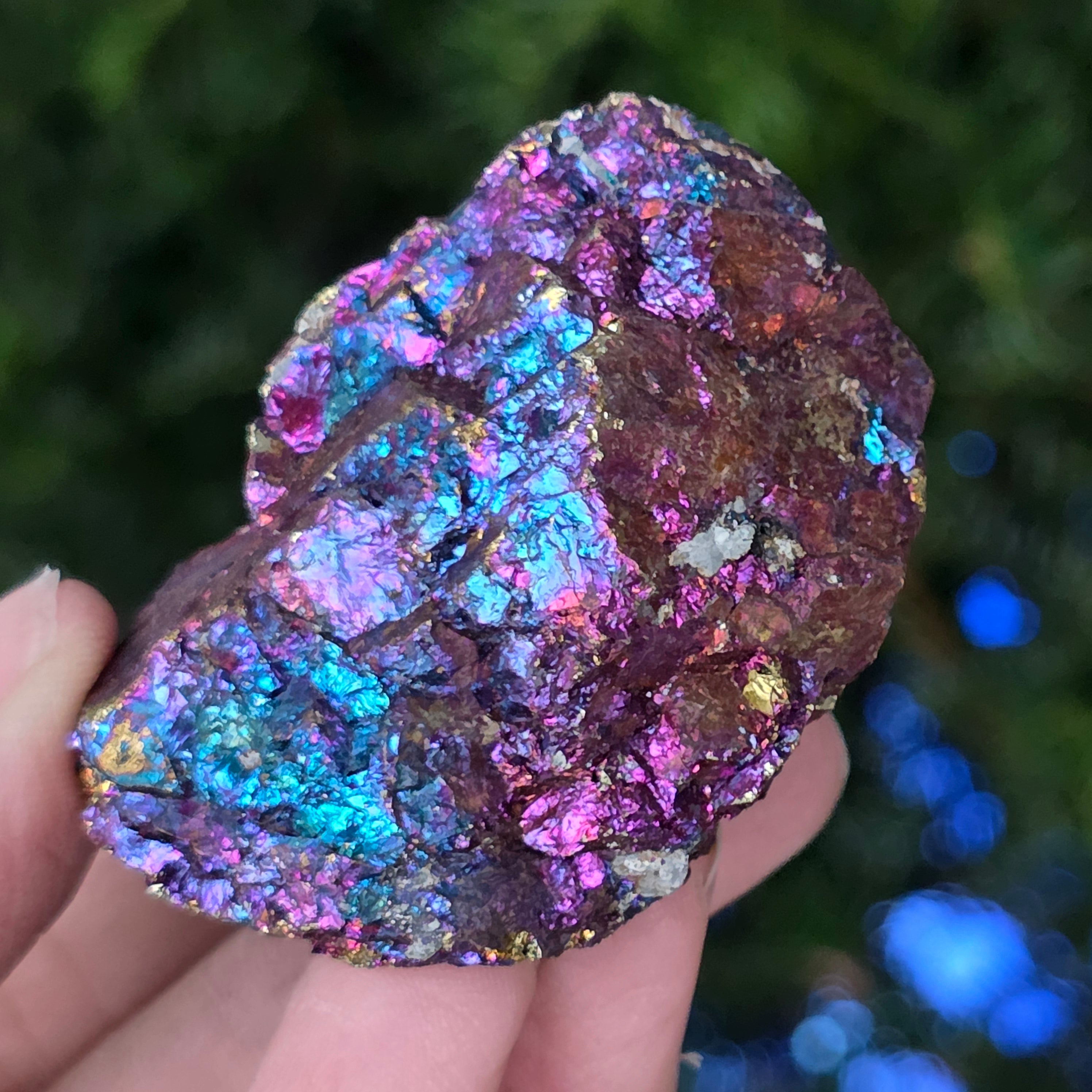 Blue and purple chalcopyrite are associated with spiritual growth, intuition, and connecting with higher energies. It is believed to help calm the mind and stimulate creativity. Its iridescent shades are symbolically linked to balance and harmony.