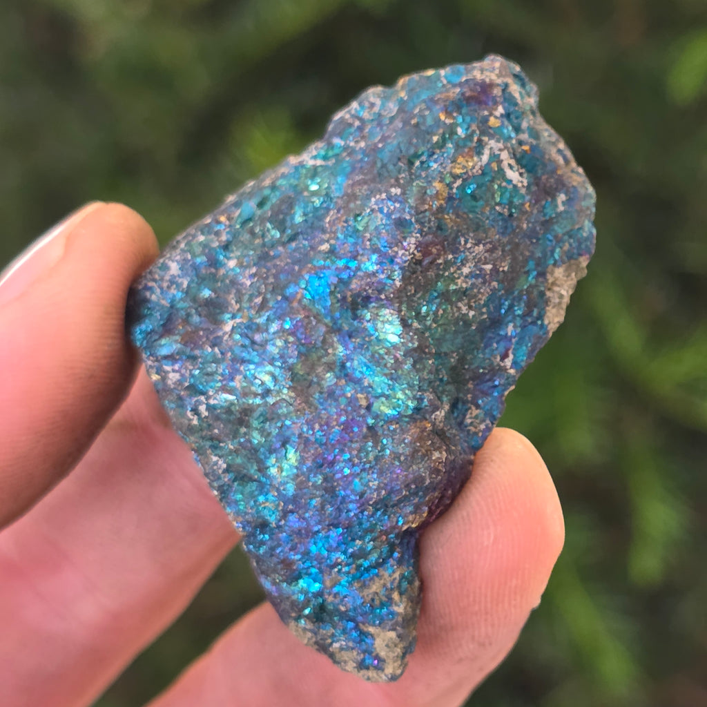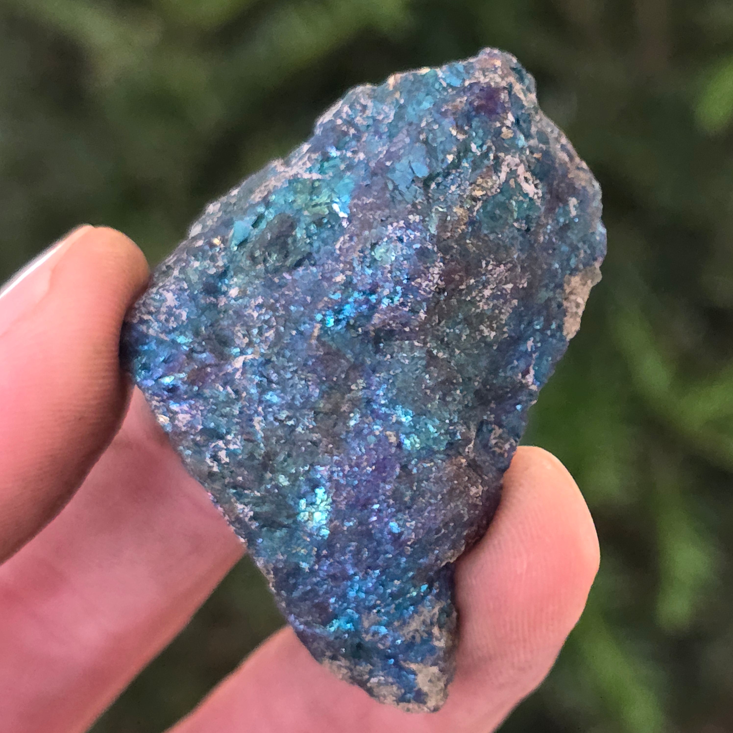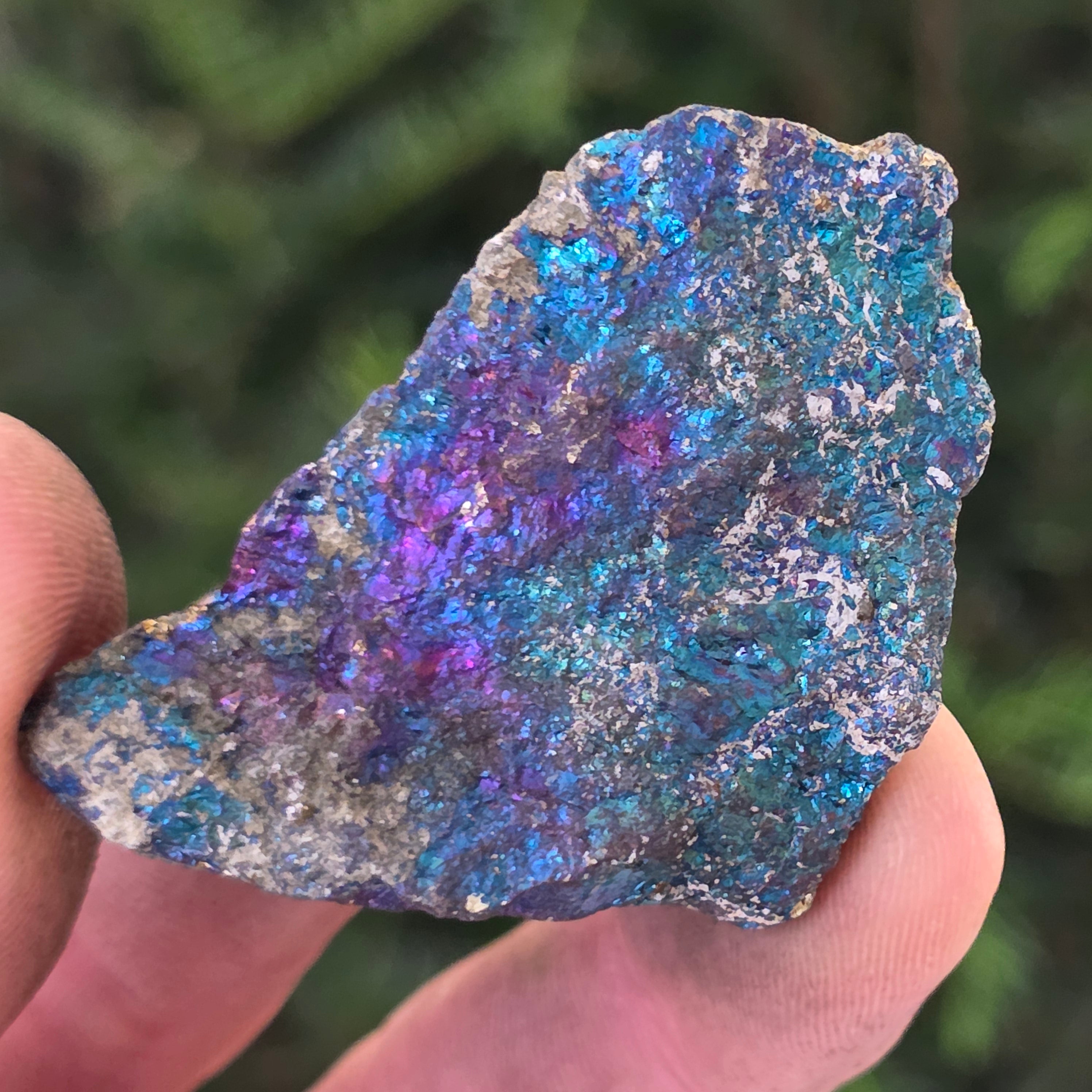 Blue chalcopyrite, also known as Iridescent chalcopyrite, is a type of chalcopyrite that exhibits bright shades of blue, purple, green, or other iridescent colors. This iridescence is caused by a thin layer of oxidation on the surface of the mineral, a natural process that occurs when chalcopyrite is exposed to air and moisture for an extended period.