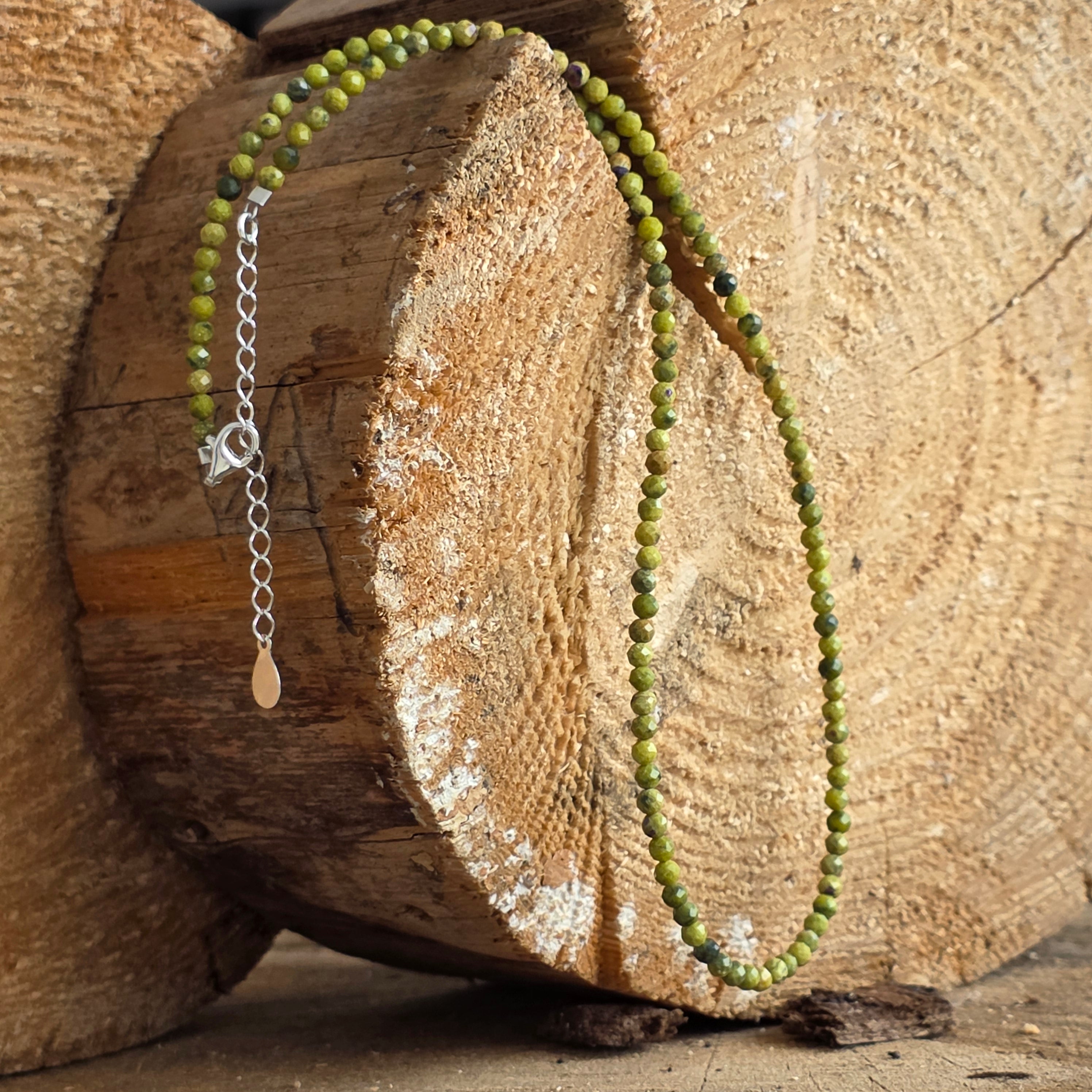 A necklace that carries the energy of inner awakening and the force of the earth. The serpentine, with its golden-green hues, recalls the tranquility of the forests and the silent power of nature that is constantly regenerating. The 3mm faceted beads subtly capture the light, like the scales of a mythical creature—hence its name, inspired by the ancient symbols of the sacred serpent.