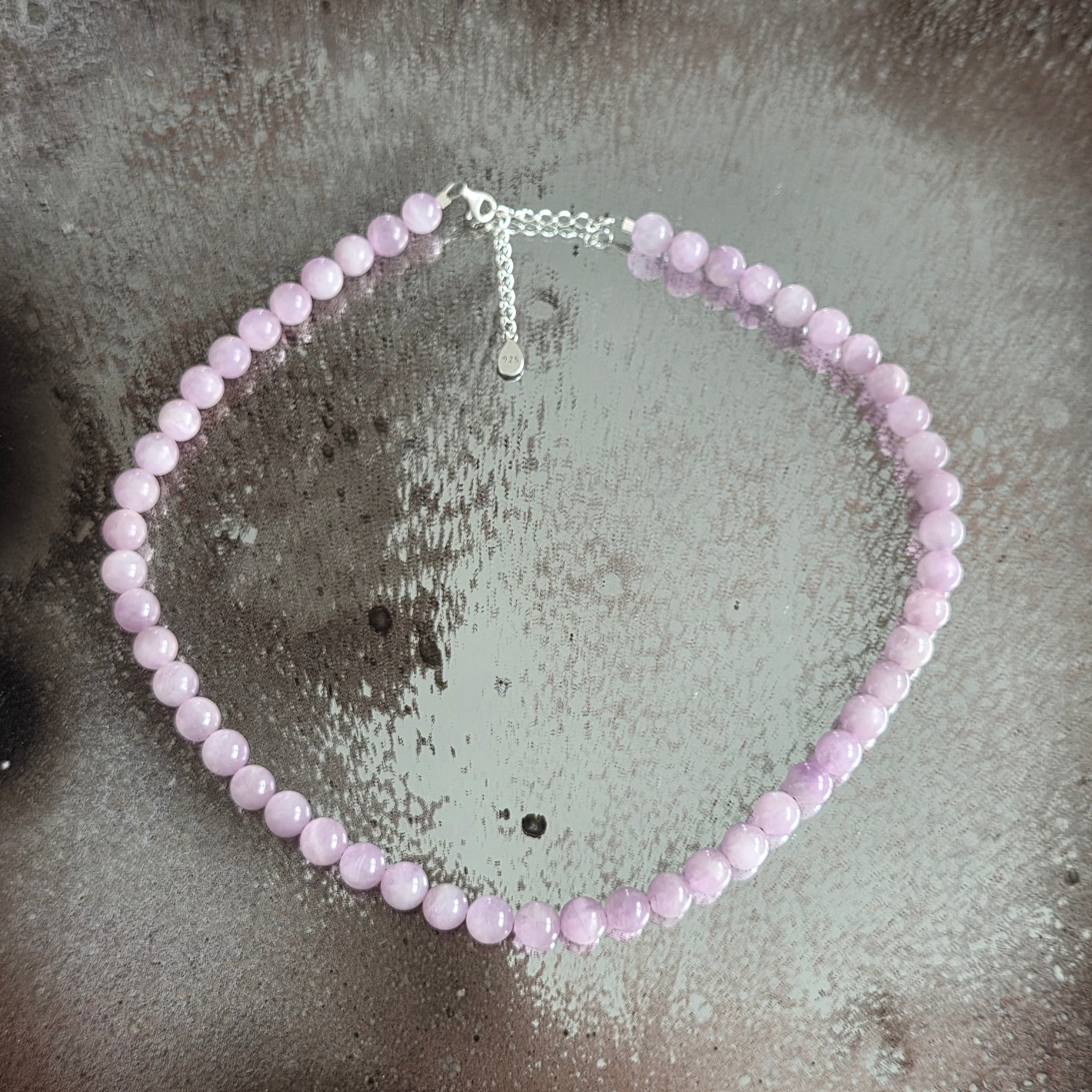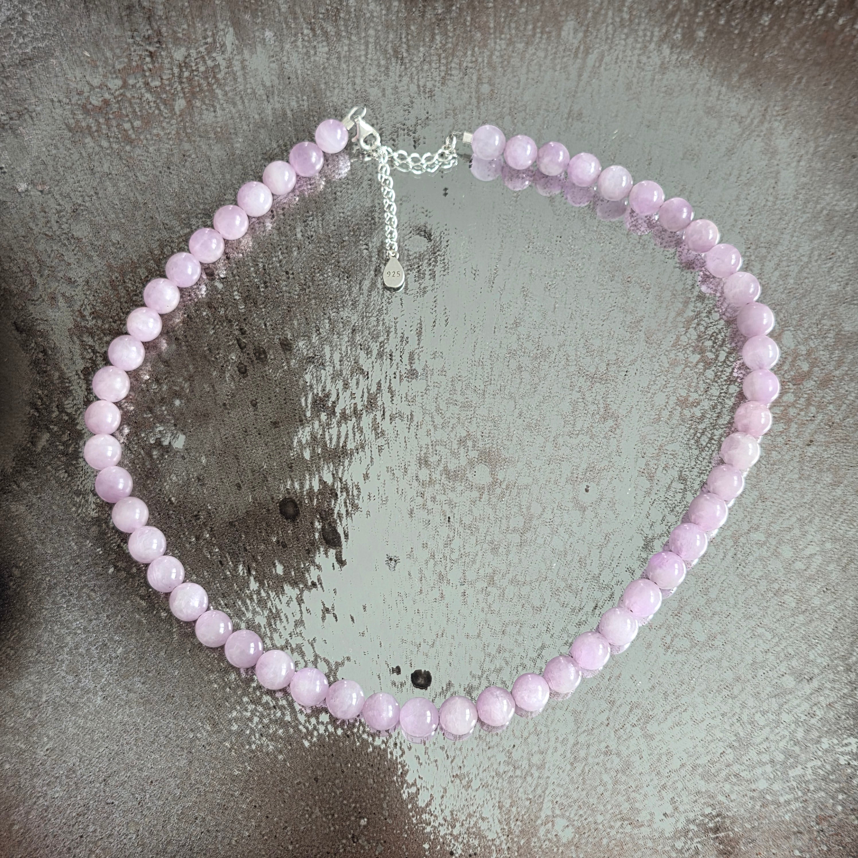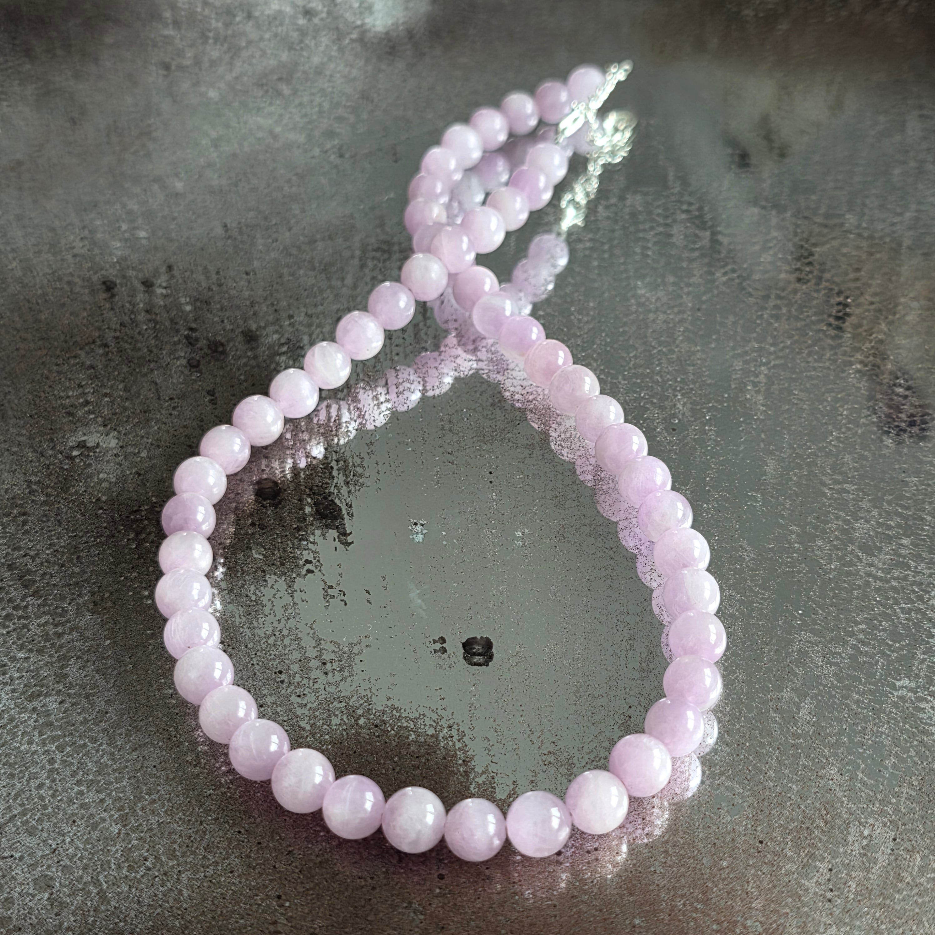 Materials: natural kunzite (7–8 mm beads), 925 silver, 925 silver lobster clasp