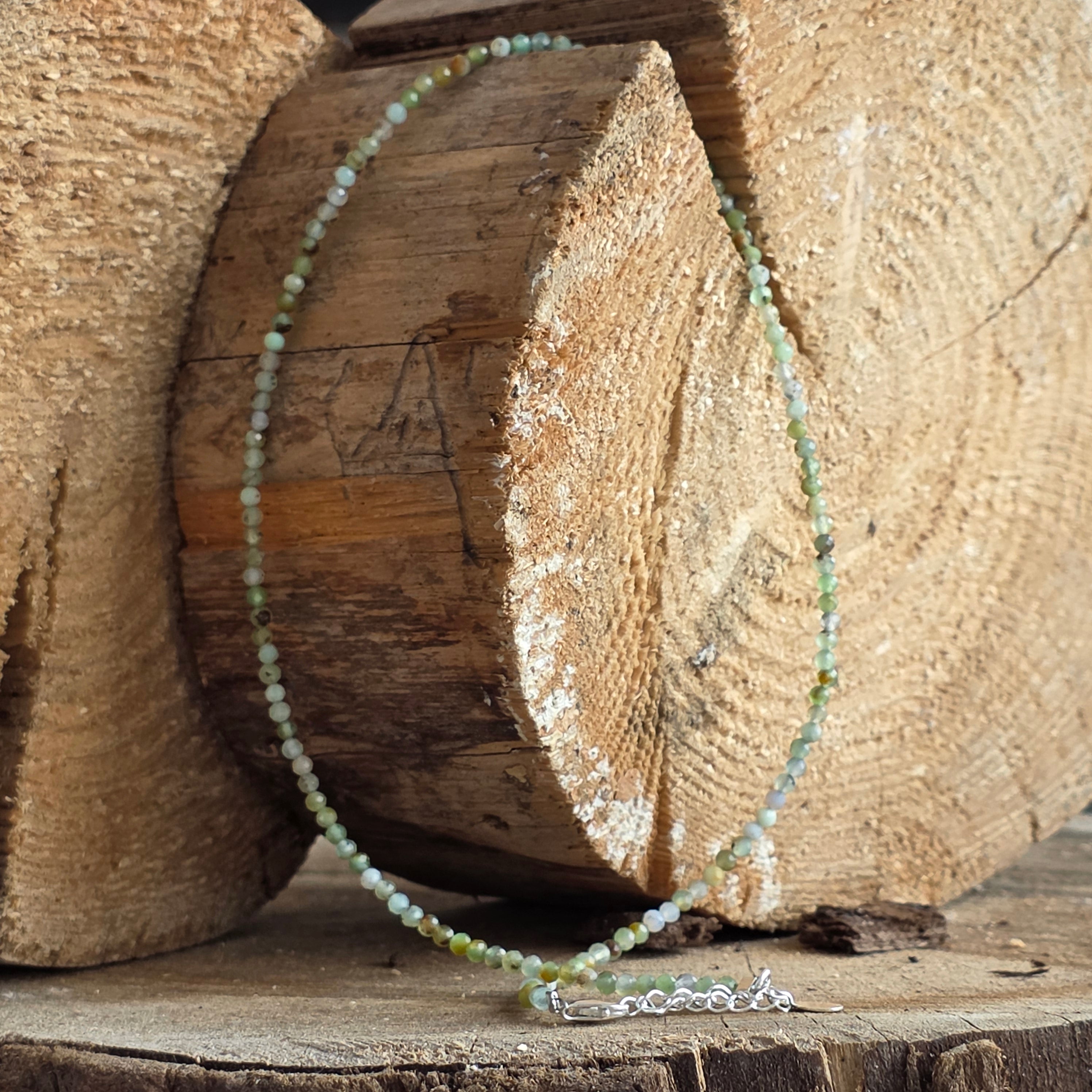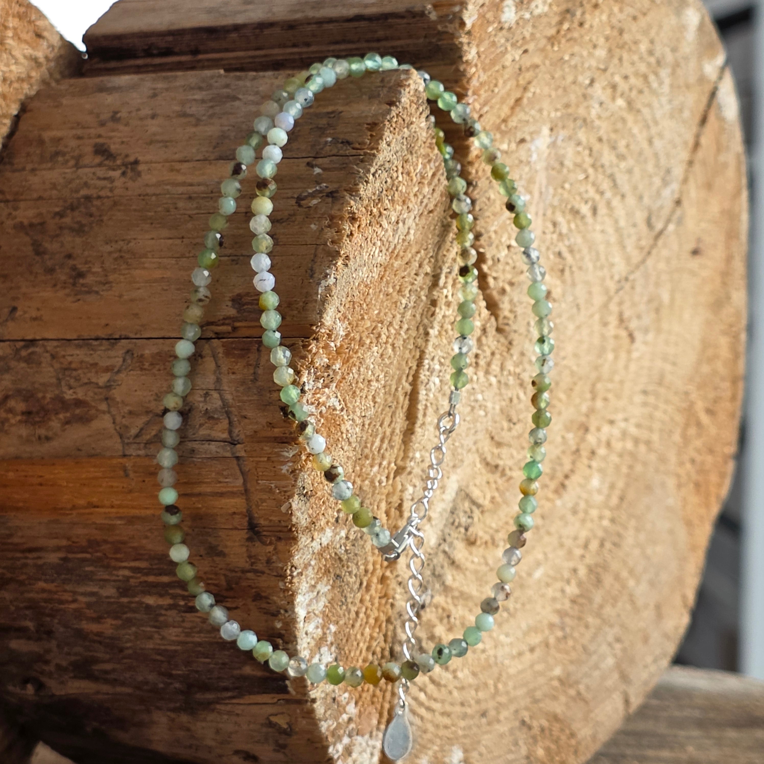 A necklace that carries the light of summer and the tenderness of a new beginning. Chrysoprase, with its bright, translucent green, is a stone of the open heart—a symbol of of pure love, compassion and soul renewal. The 3mm faceted beads catch every ray of light, turning the necklace into a vibrant, radiant and delicate jewel.