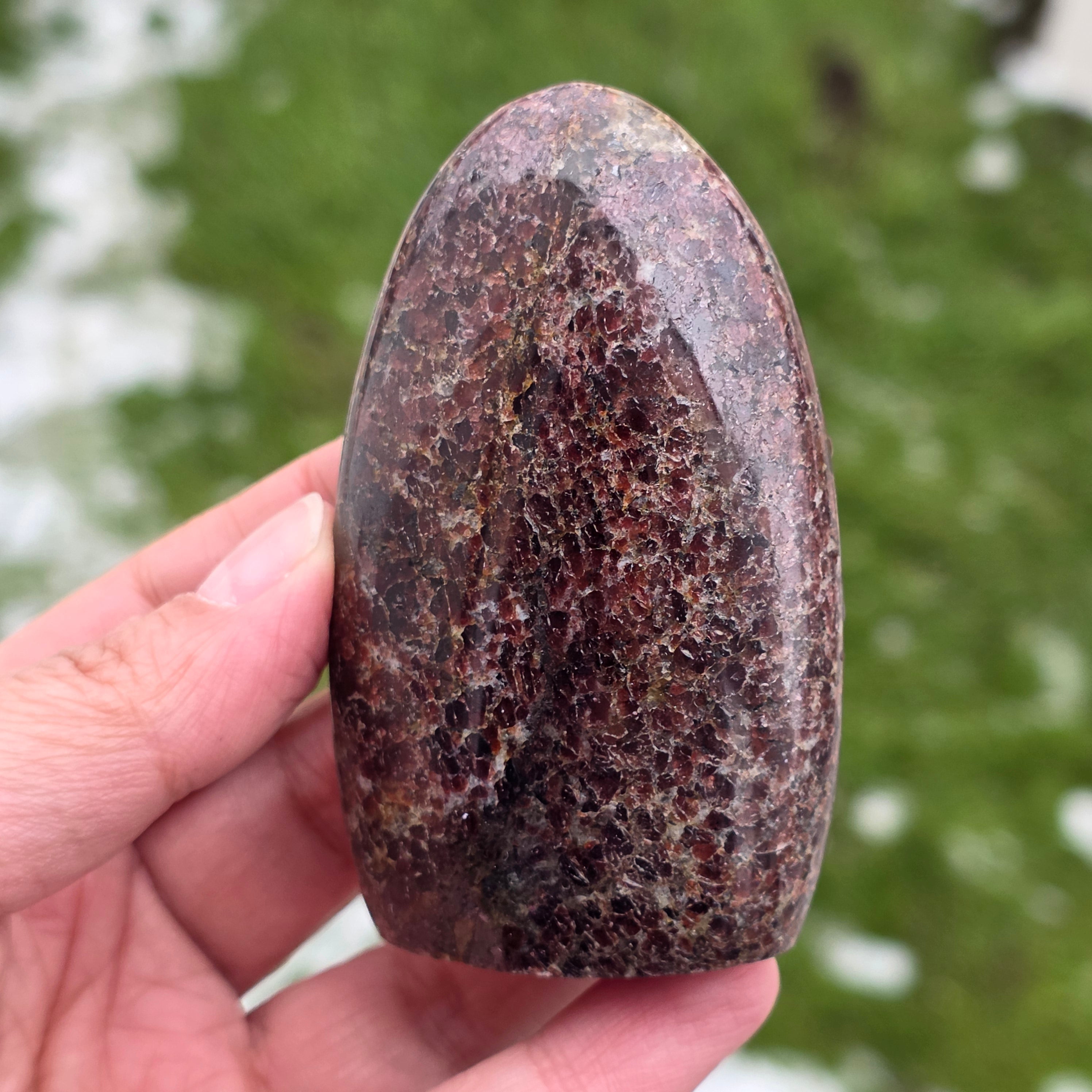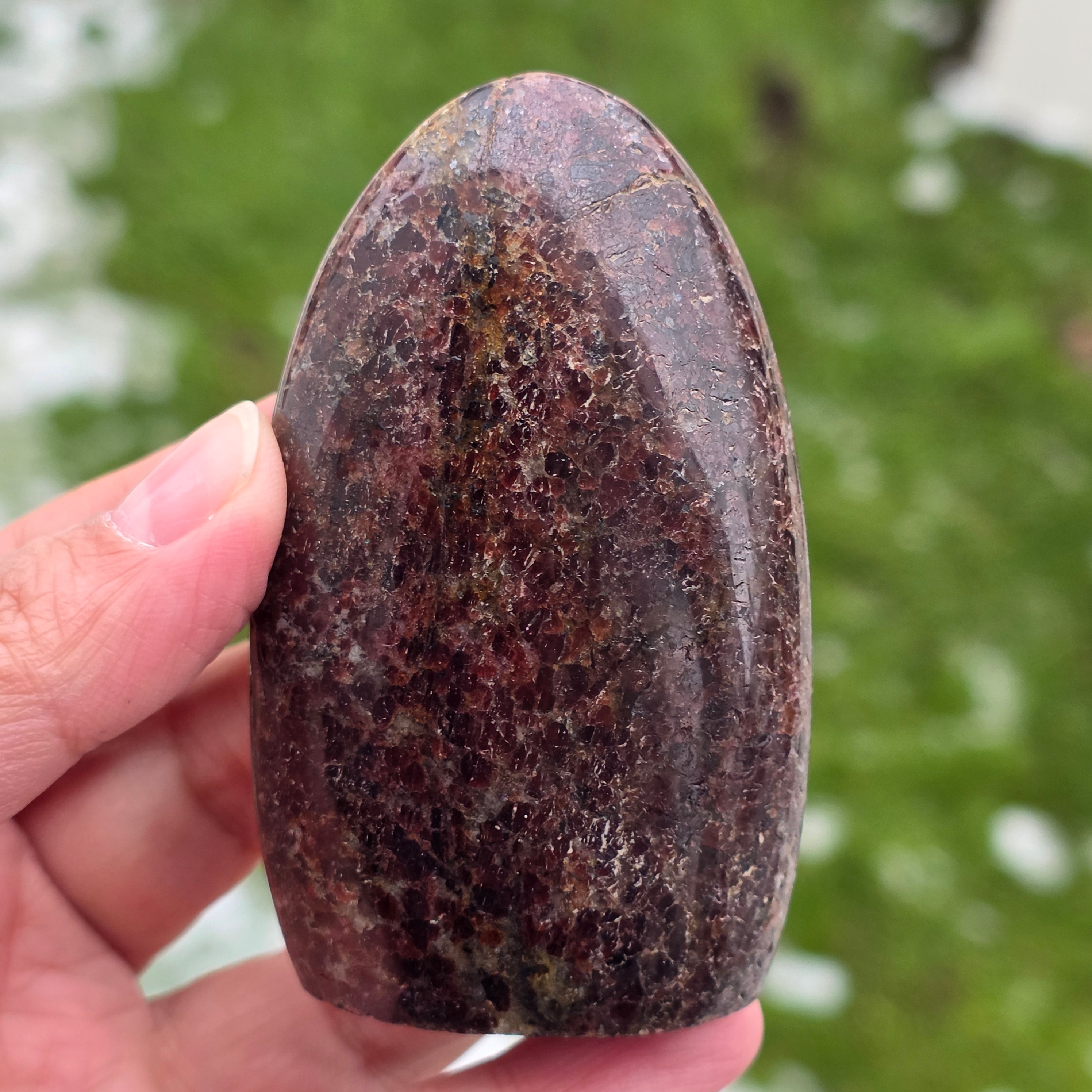 This piece of natural garnet from Madagascar, with a free-form structure, preserves the authentic character of the crystal, highlighting the balance between the polished surfaces and the natural areas. It is a piece suitable for a collection, meditation spaces, or an office, having a strong and stabilizing presence. Garnet is associated with vitality, grounding, and inner strength, often chosen to support energy during periods of effort, transformation, and reconnection with one’s own power. The freeform shape allows a natural expression of energy, giving this piece a unique and authentic character. Garnet is also considered a stone of passion and sexual energy and is often worn to increase energy and vitality levels.