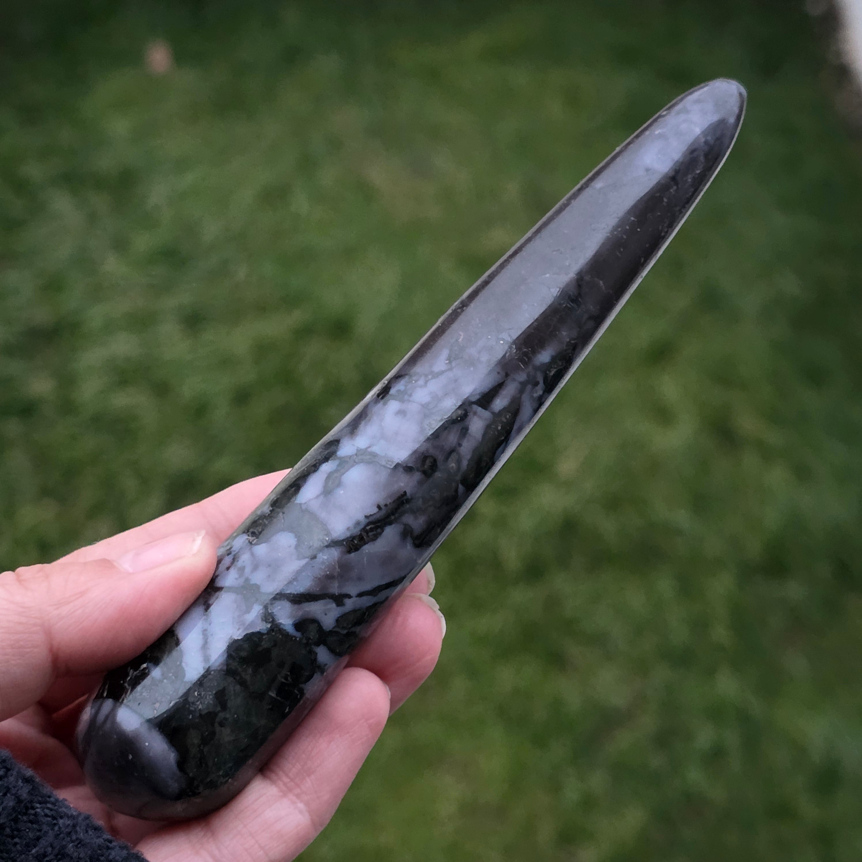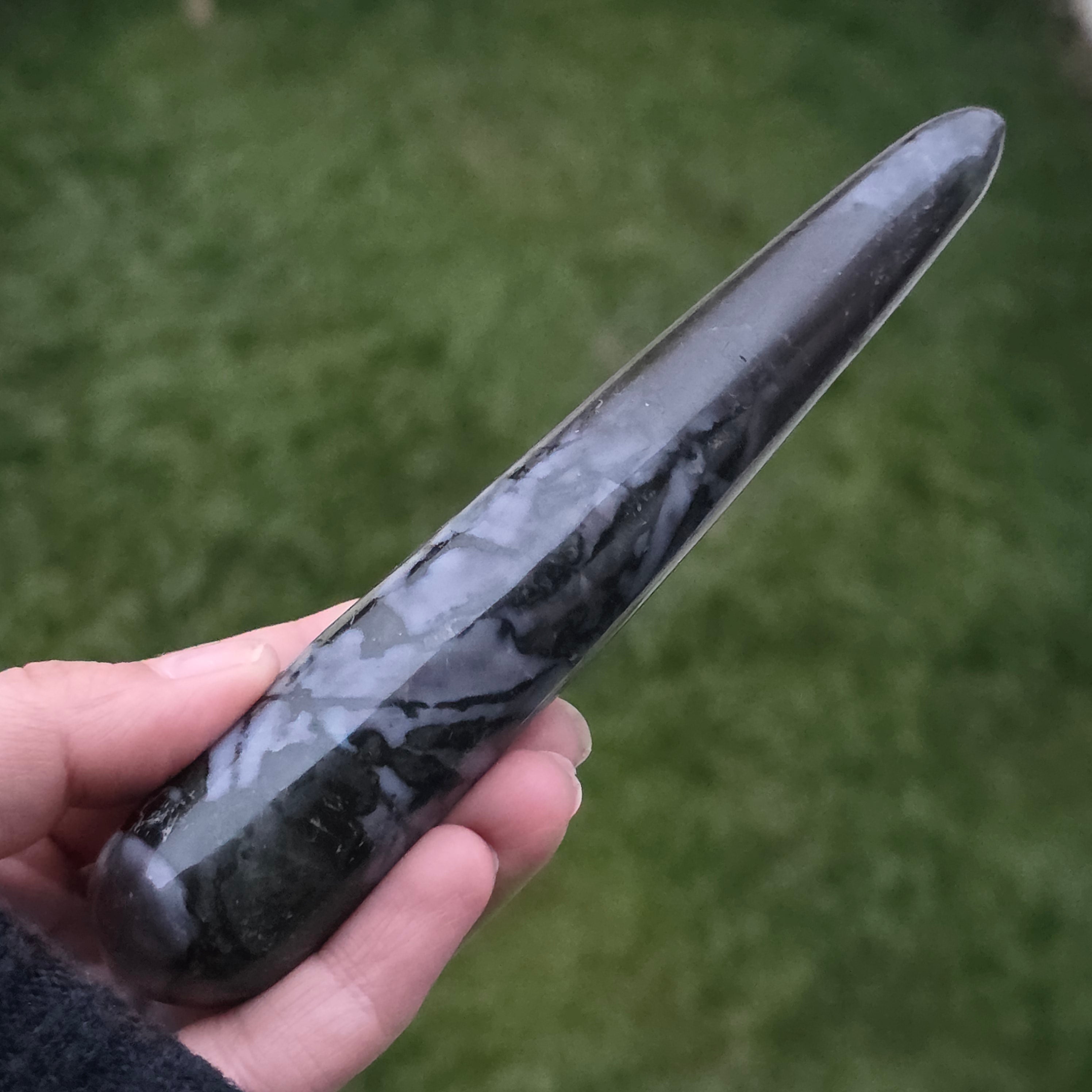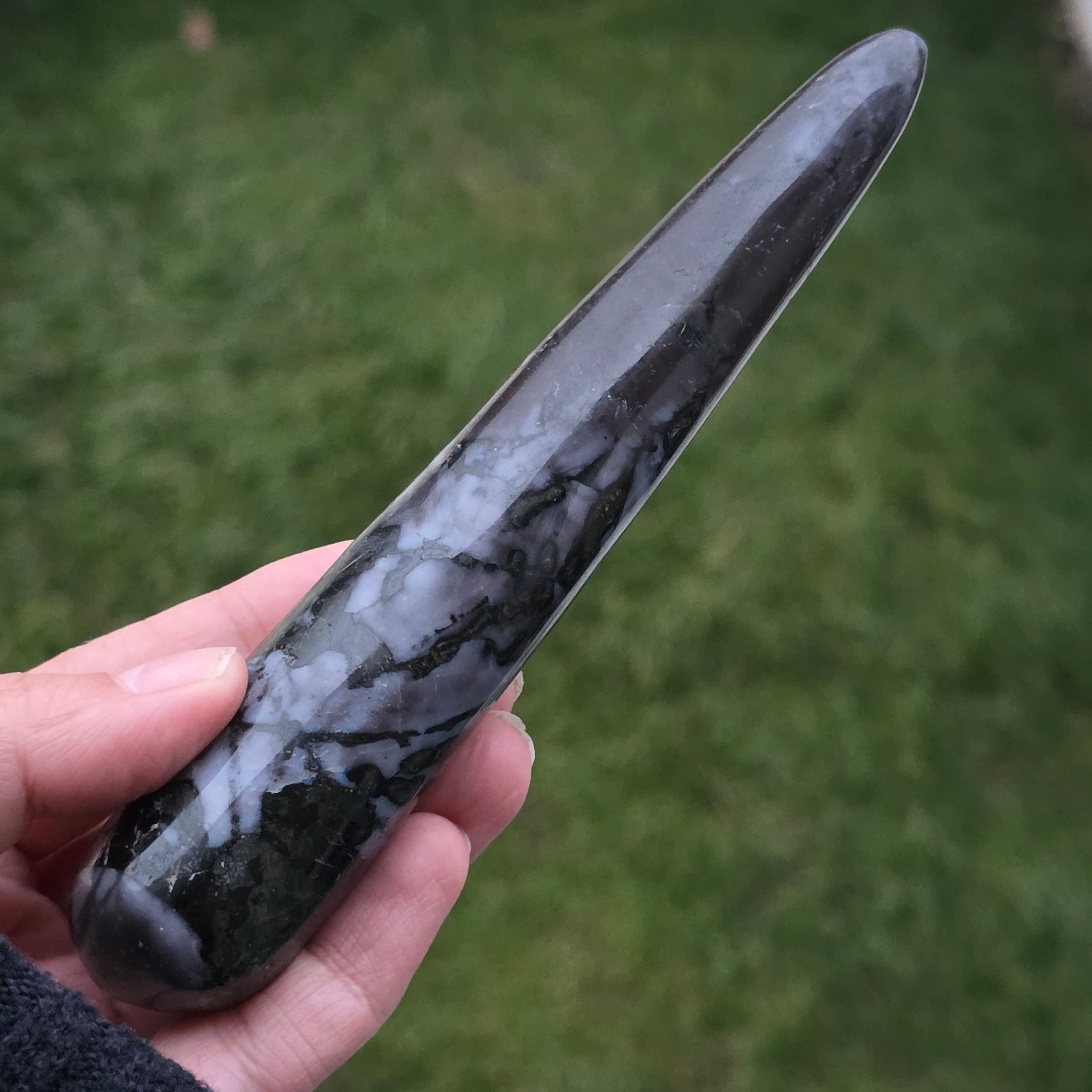 Merlinite is a rare and fascinating semi-precious stone, known for its combination of contrasting black and white colors, which gives it a unique appearance. It is considered a variety of dendritic opal or a combination of quartz and other minerals, and its complex structure makes it appreciated both for its beauty and for its supposed energetic properties. Merlinite is known in the world of crystal therapy for its mystical energies and its association with intuition, clairvoyance, and spiritual knowledge.