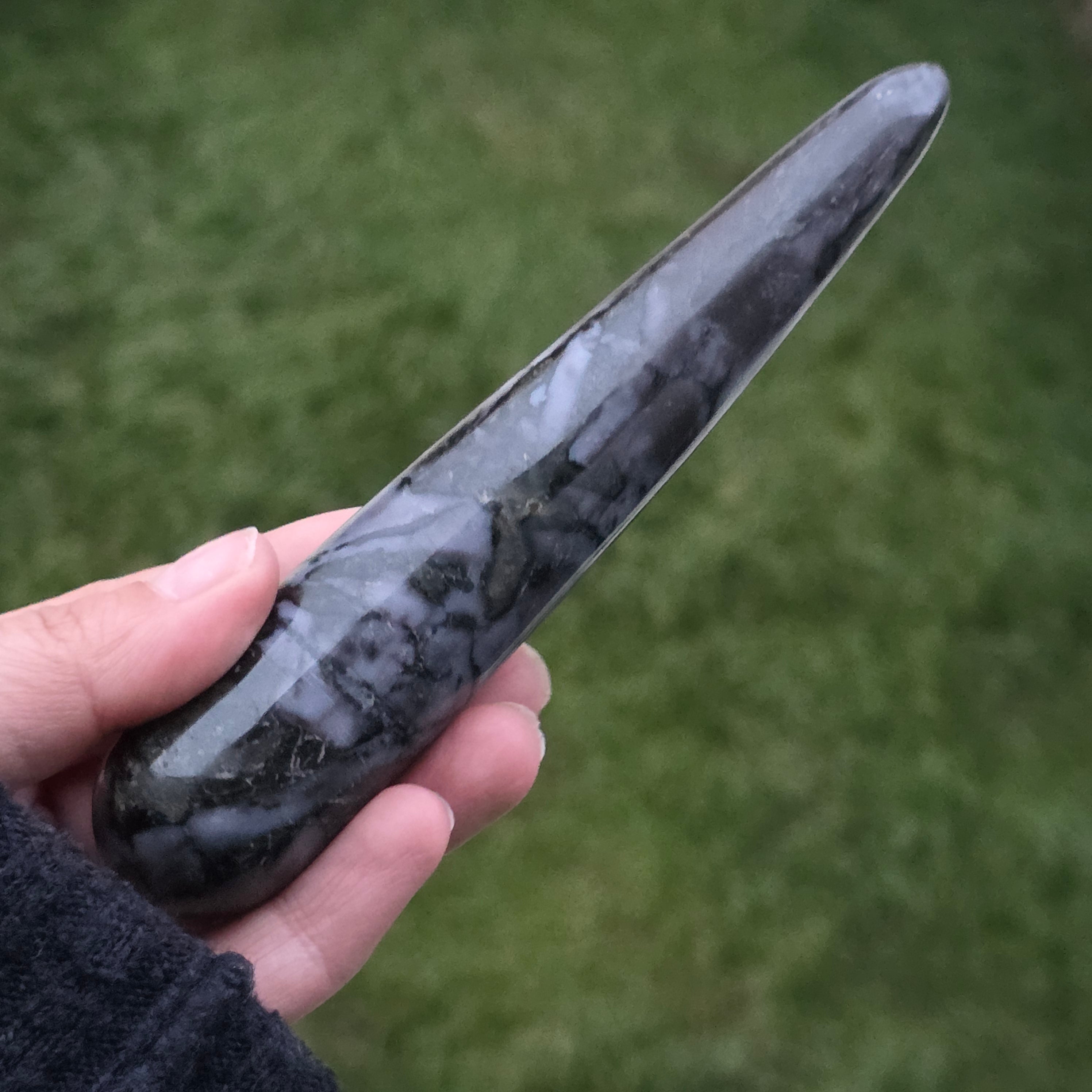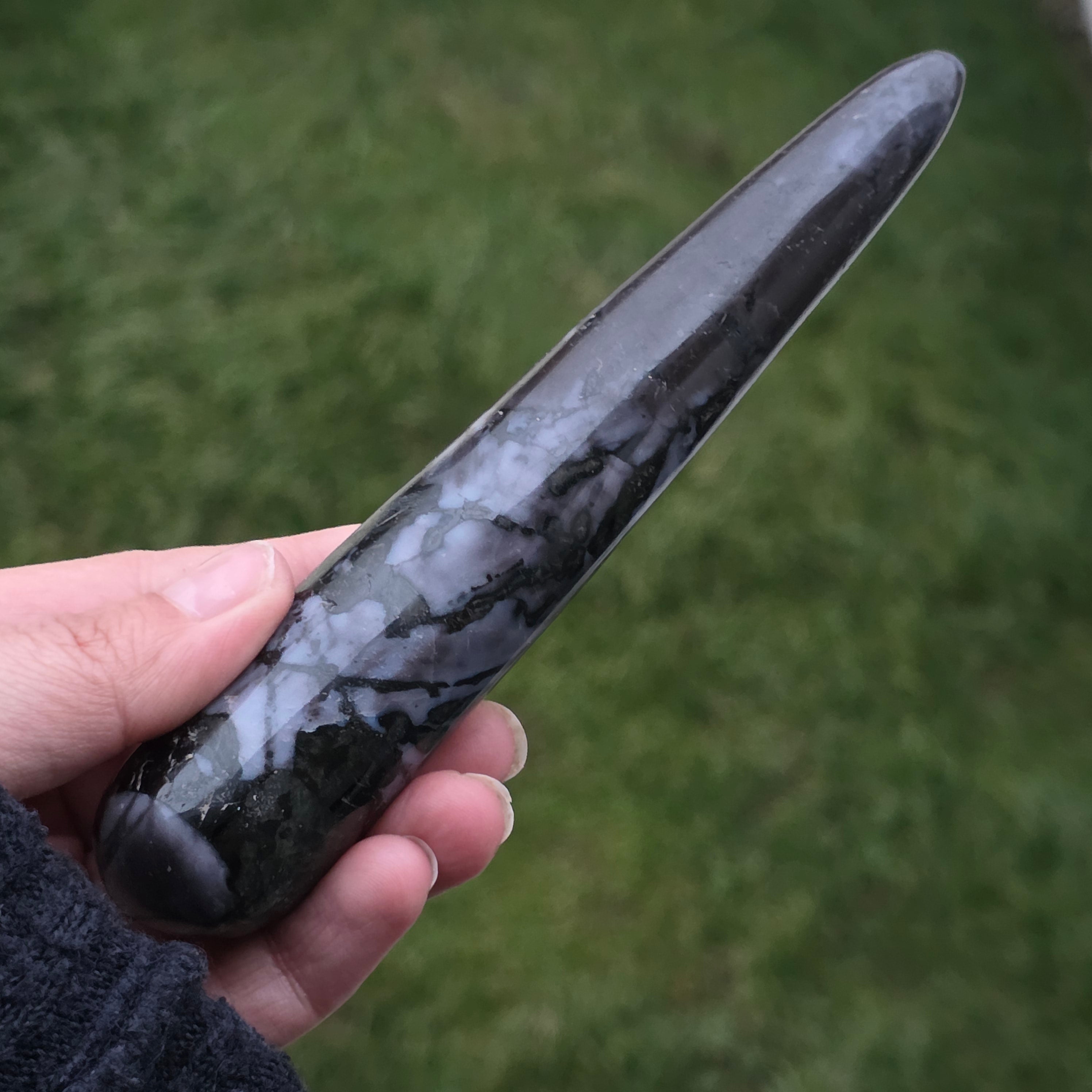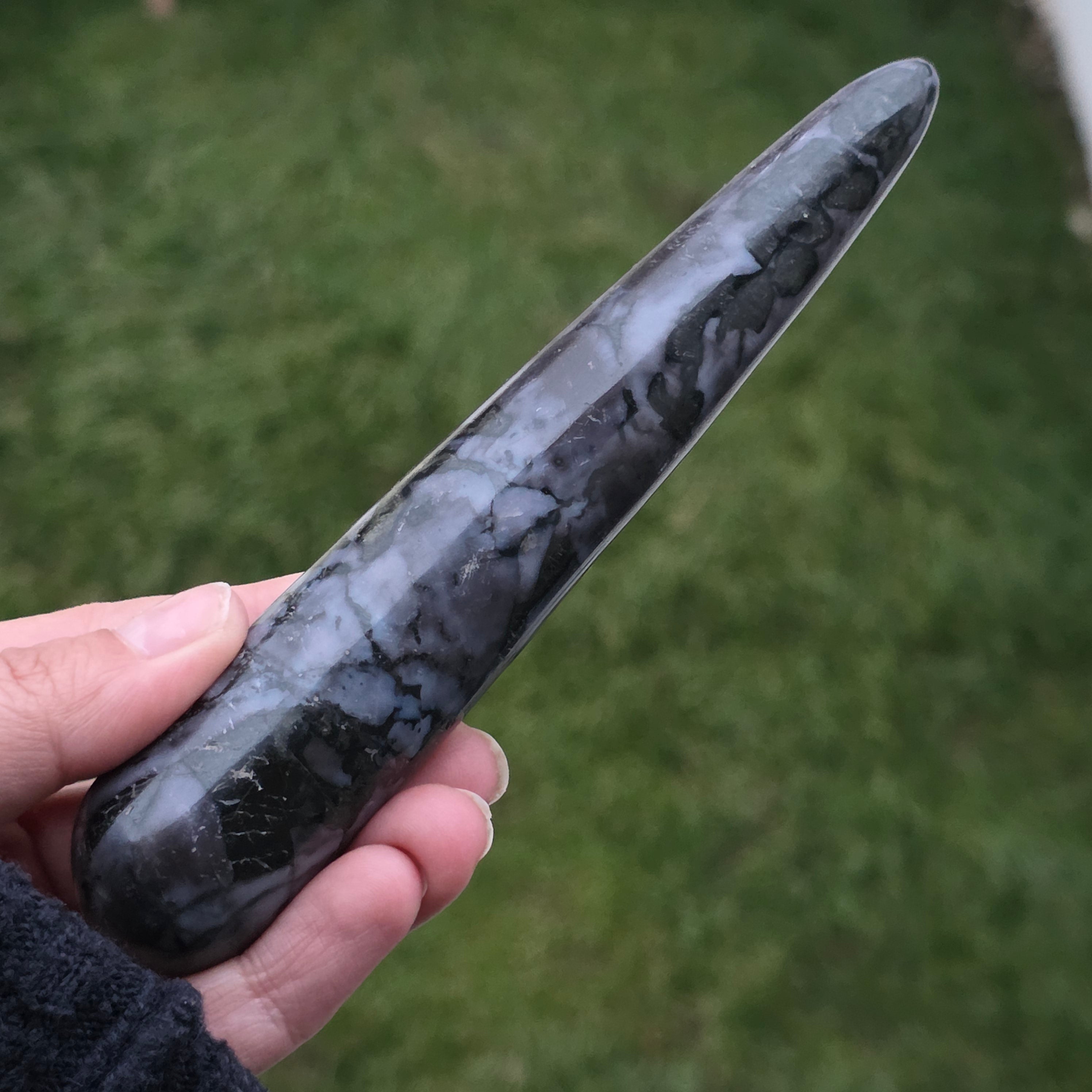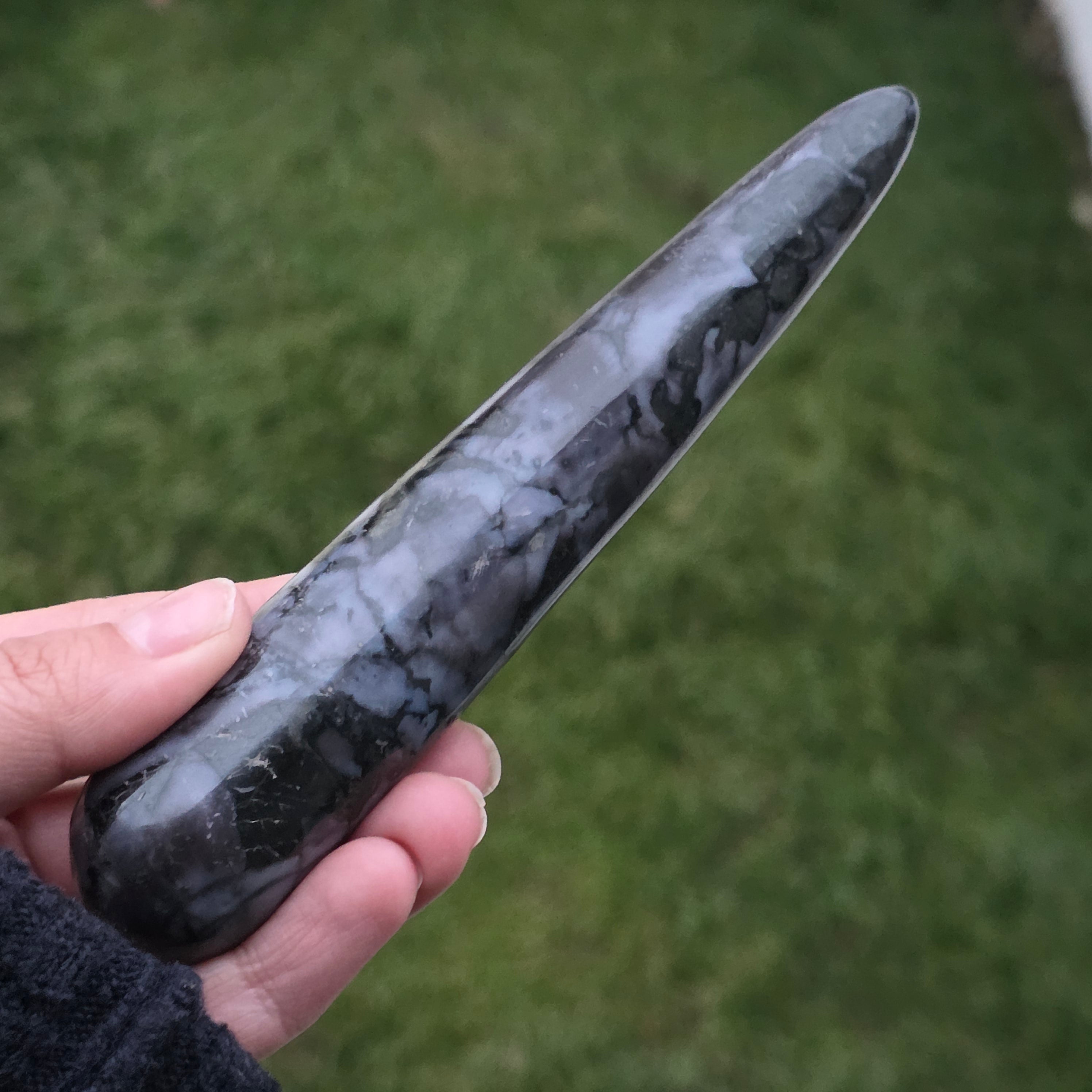 Merlinite is a rare and fascinating semi-precious stone, known for its combination of contrasting black and white colors, which gives it a unique appearance. It is considered a variety of dendritic opal or a combination of quartz and other minerals, and its complex structure makes it appreciated both for its beauty and for its supposed energetic properties. Merlinite is known in the world of crystal therapy for its mystical energies and its association with intuition, clairvoyance, and spiritual knowledge.