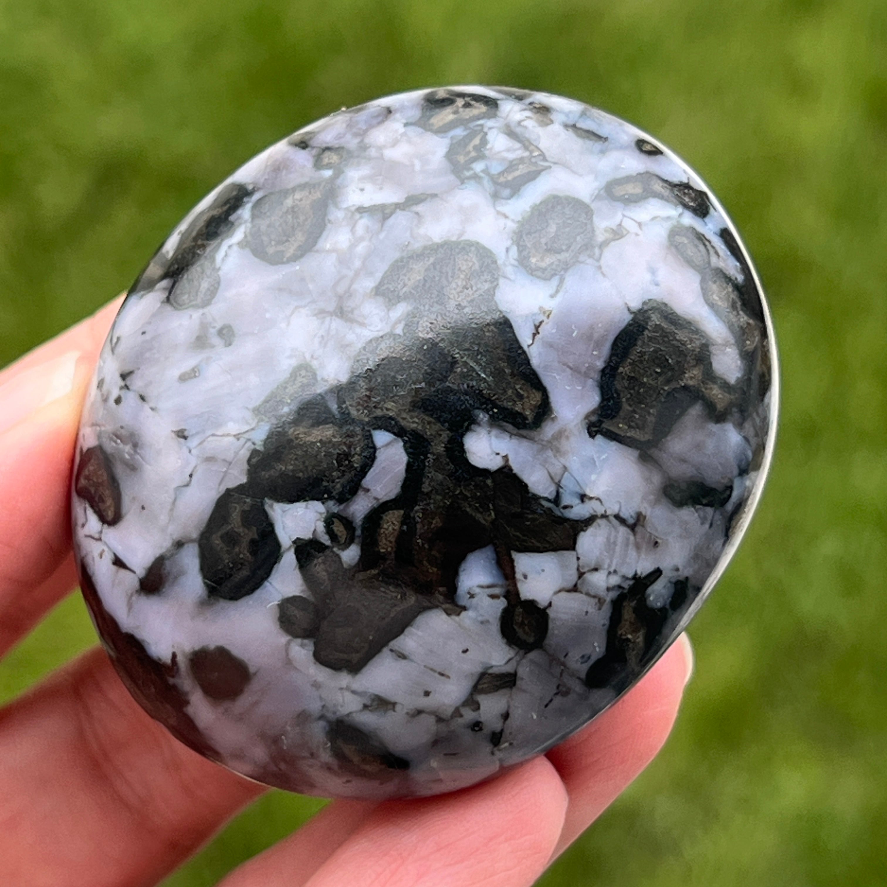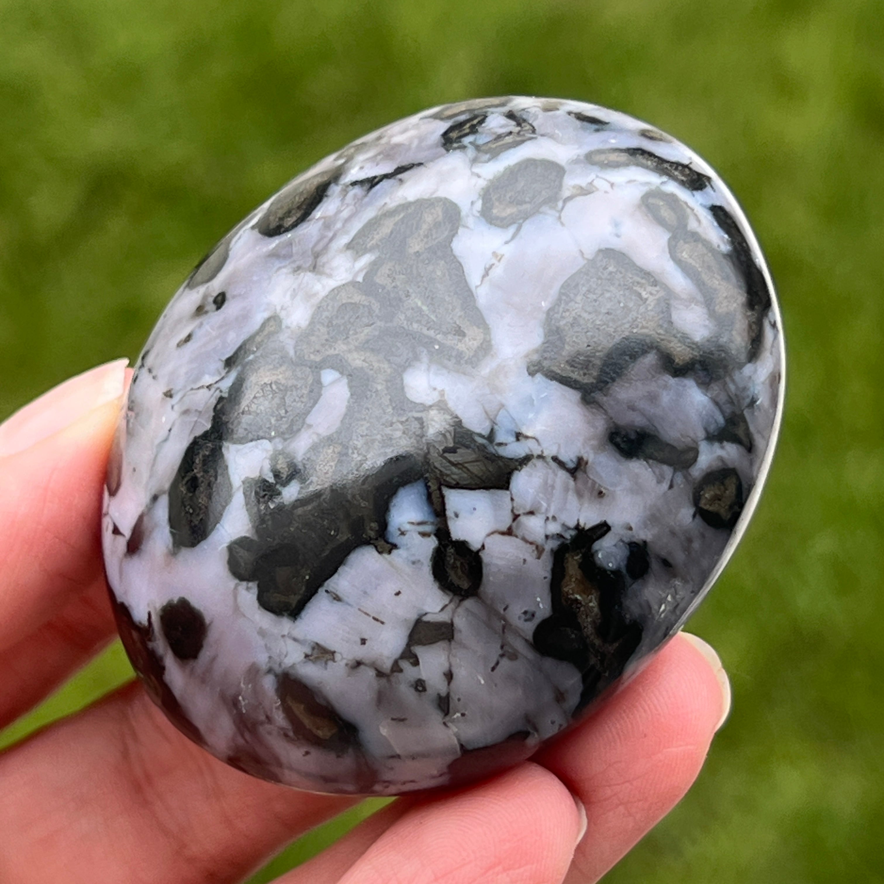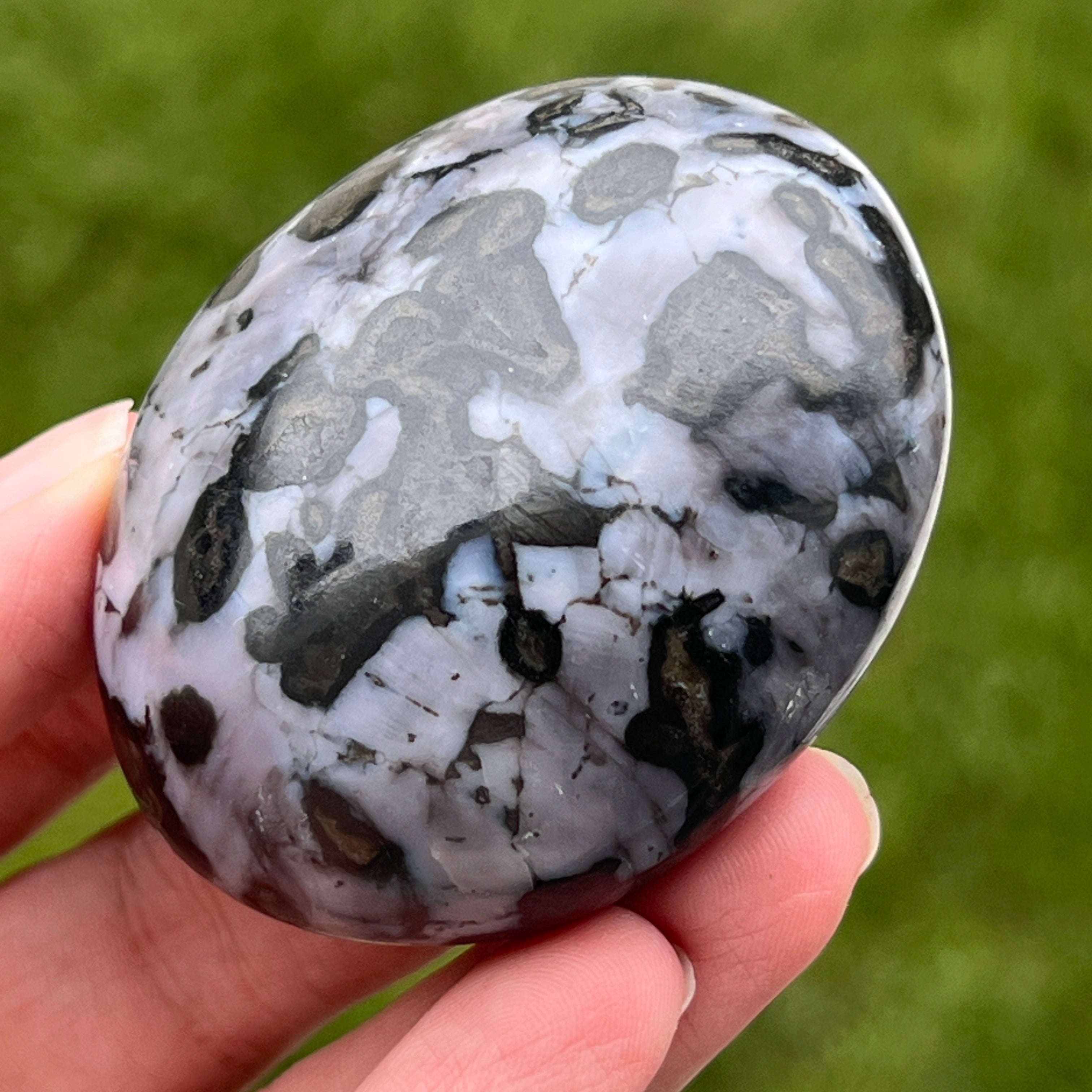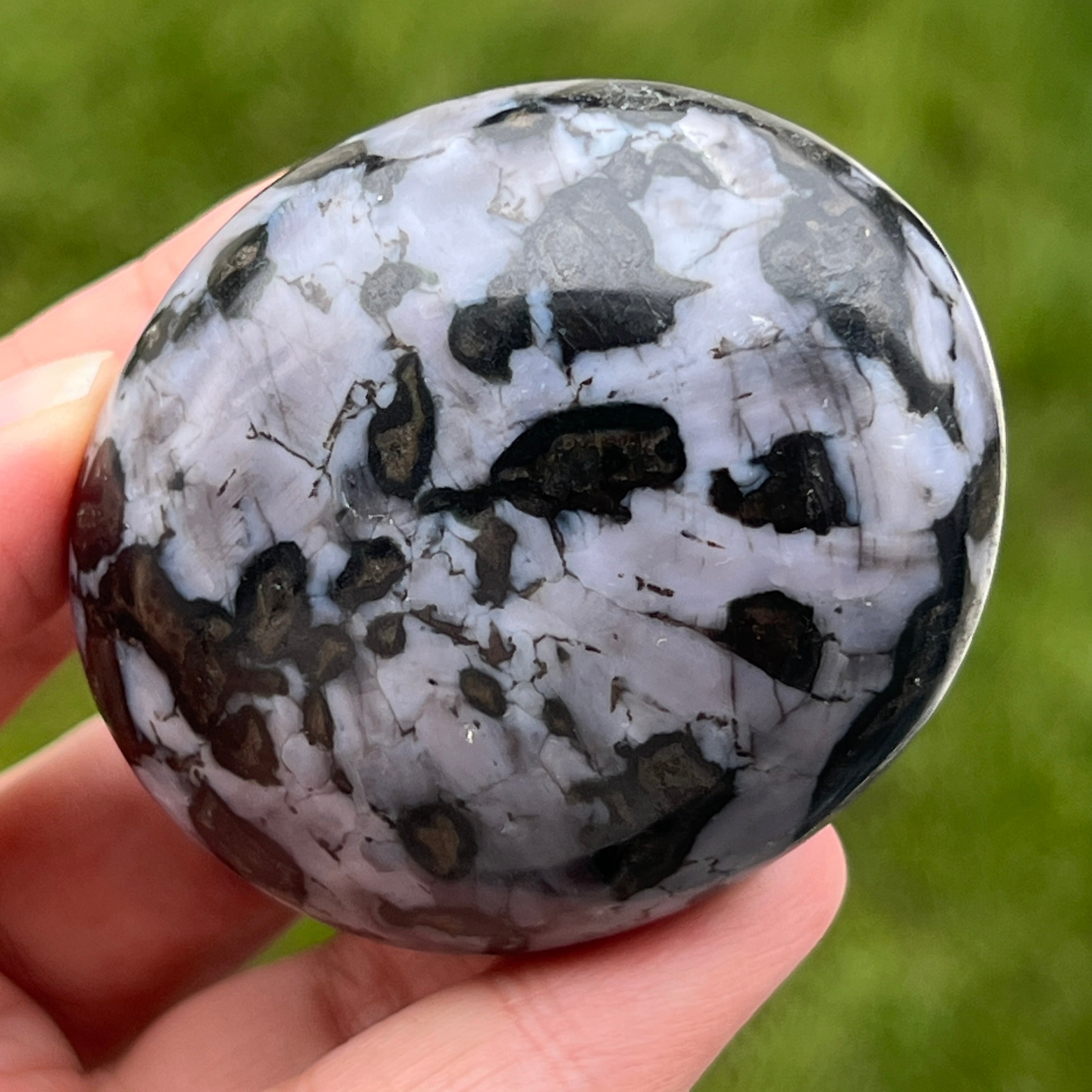 Merlinite is a rare and fascinating semi-precious stone, recognized for its contrasting colors, black and white, which give it a unique appearance. It is considered a variety of dendritic opal or a combination of quartz and other minerals, and its complex structure makes it appreciated both for its beauty and its alleged energetic properties. Merlinite is known in the world of crystal healing for its mystical energies and its association with intuition, clairvoyance, and spiritual knowledge.