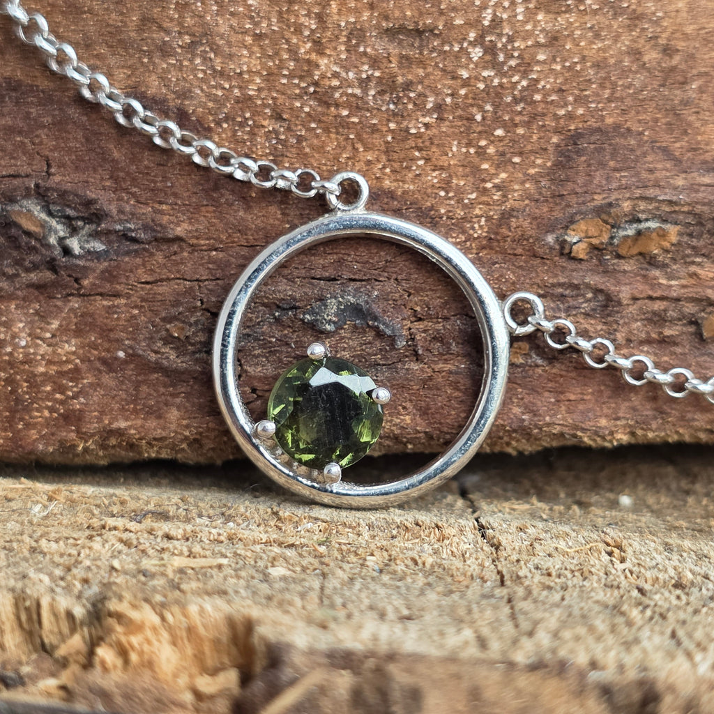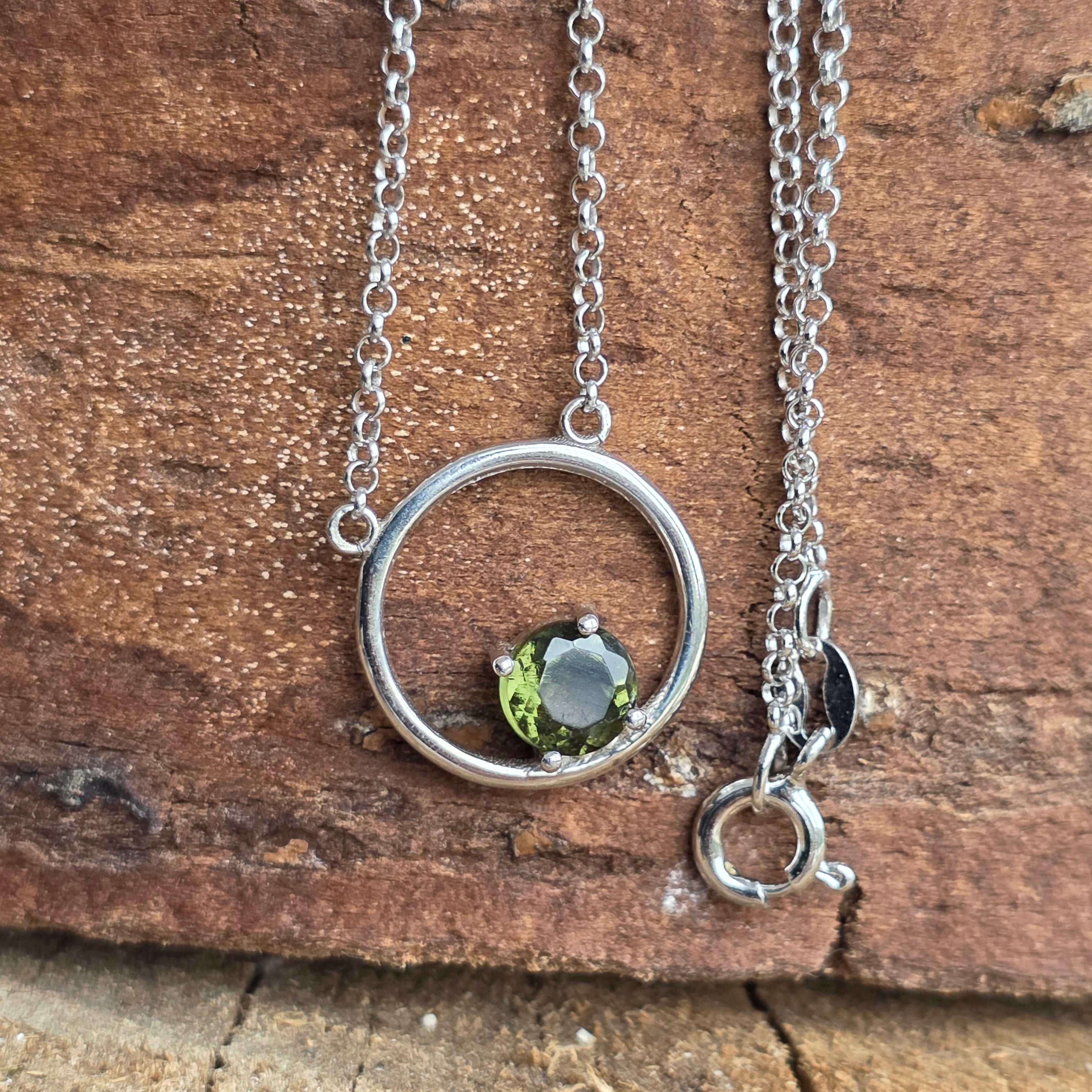 A minimalist design with maximum impact: the Moldavit stone floats inside a silver circle, like a small orbit of light. The deep green of Moldavit is accentuated by the clean line of the medallion, resulting in a modern, fine and easy necklace or on special occasions.