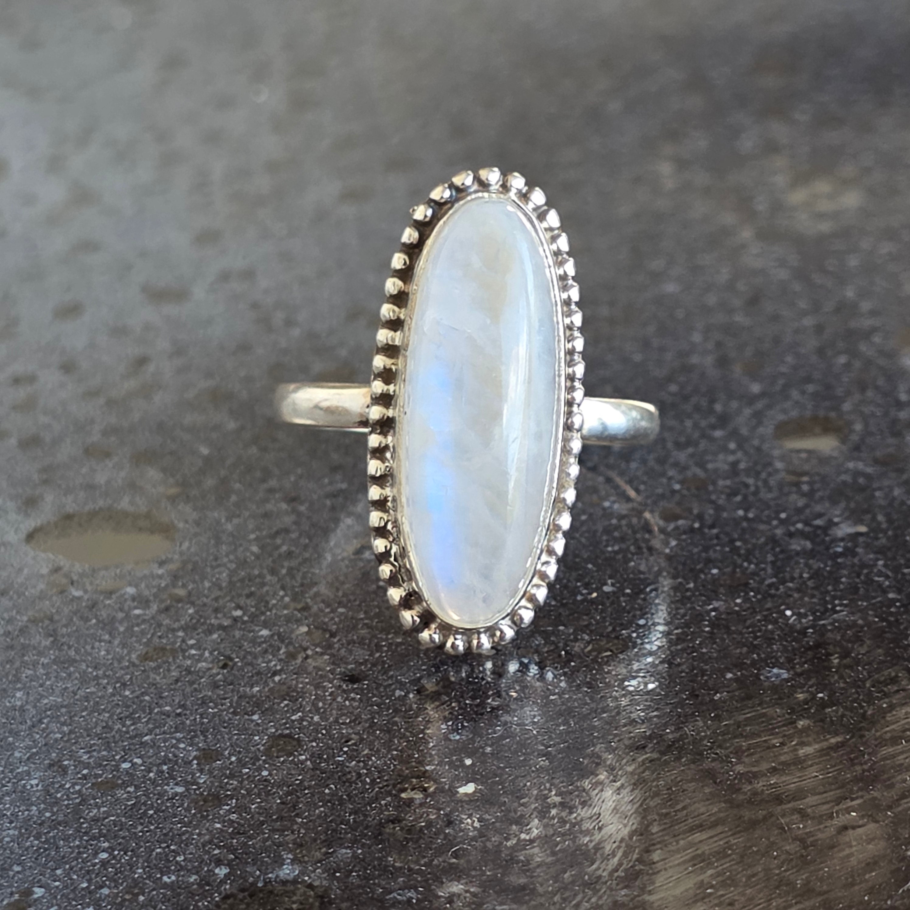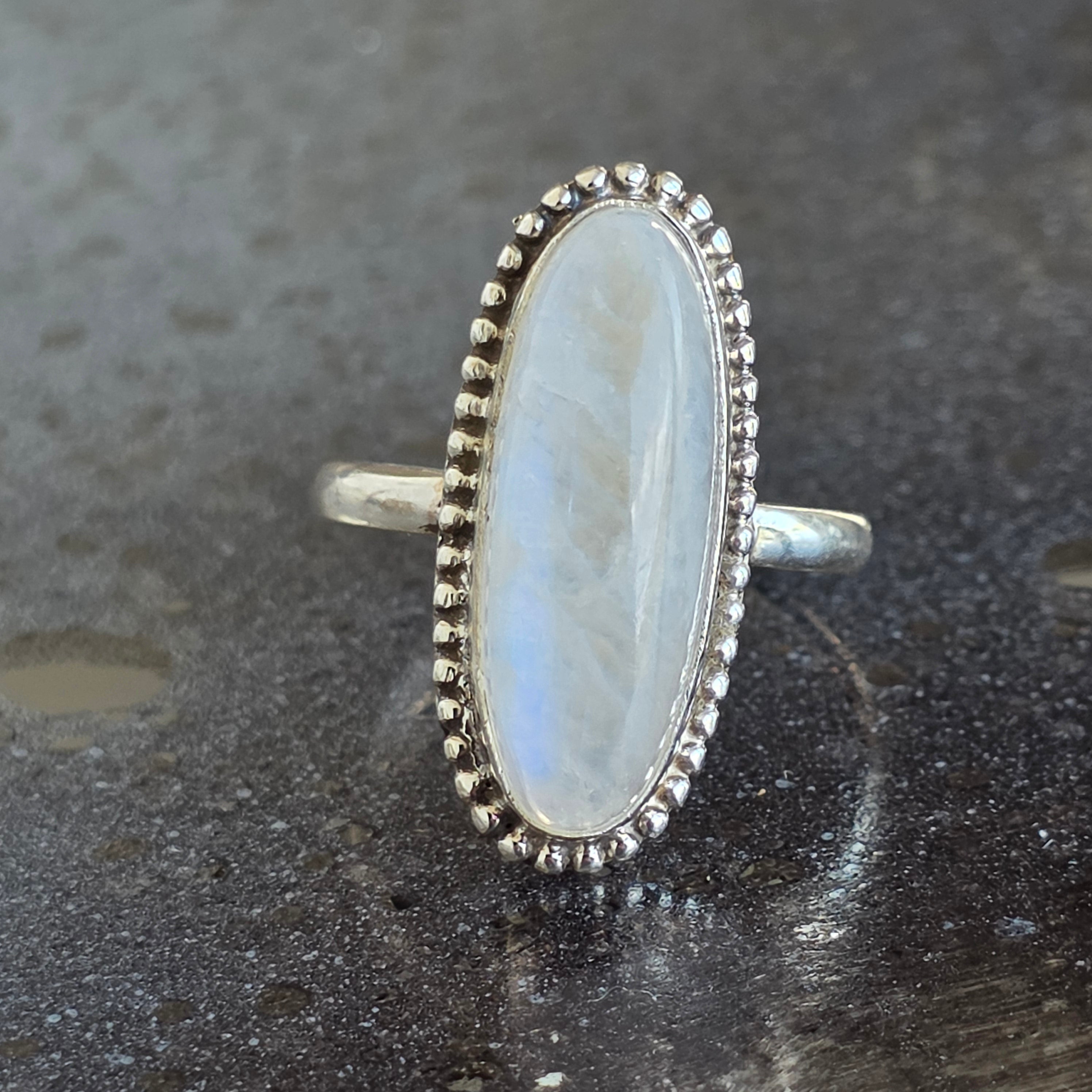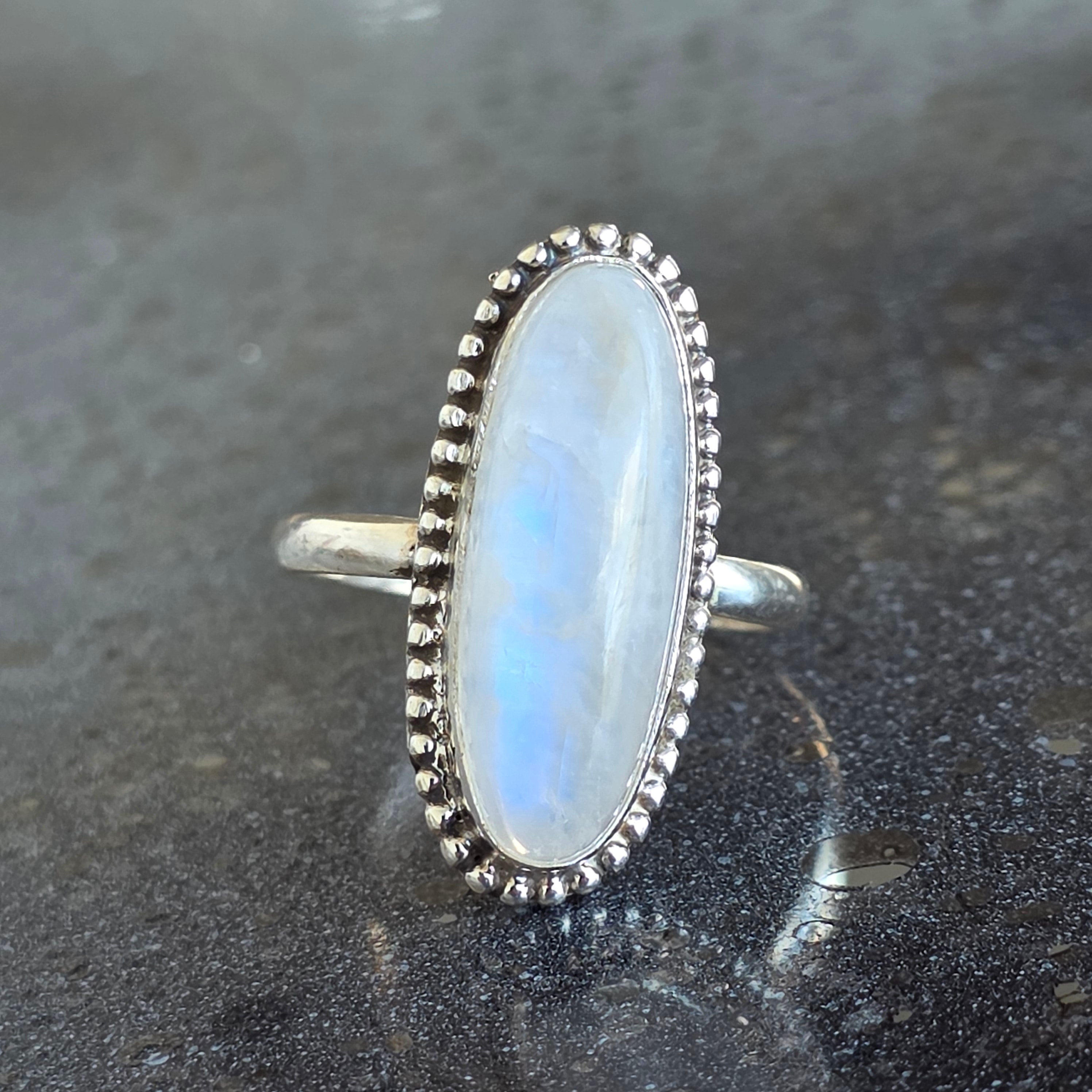An elegant and luminous 925 silver ring with a natural rainbow moonstone, recognized for its blue, silver and mother-of-pearl reflections. The design raw work handcrafted highlights the elongated shape of the stone, creating a piece of jewelry that is sophisticated and delicate at the same time.