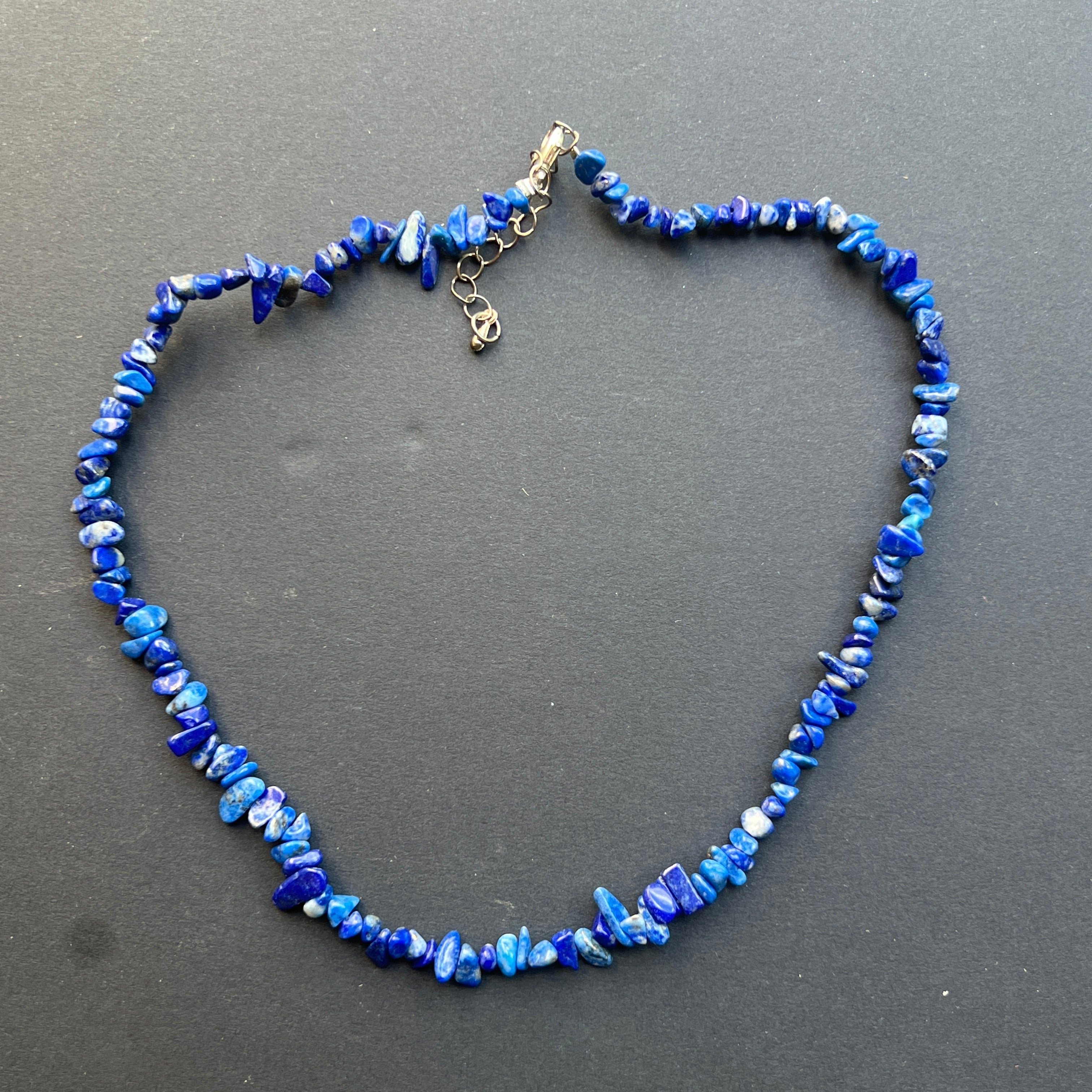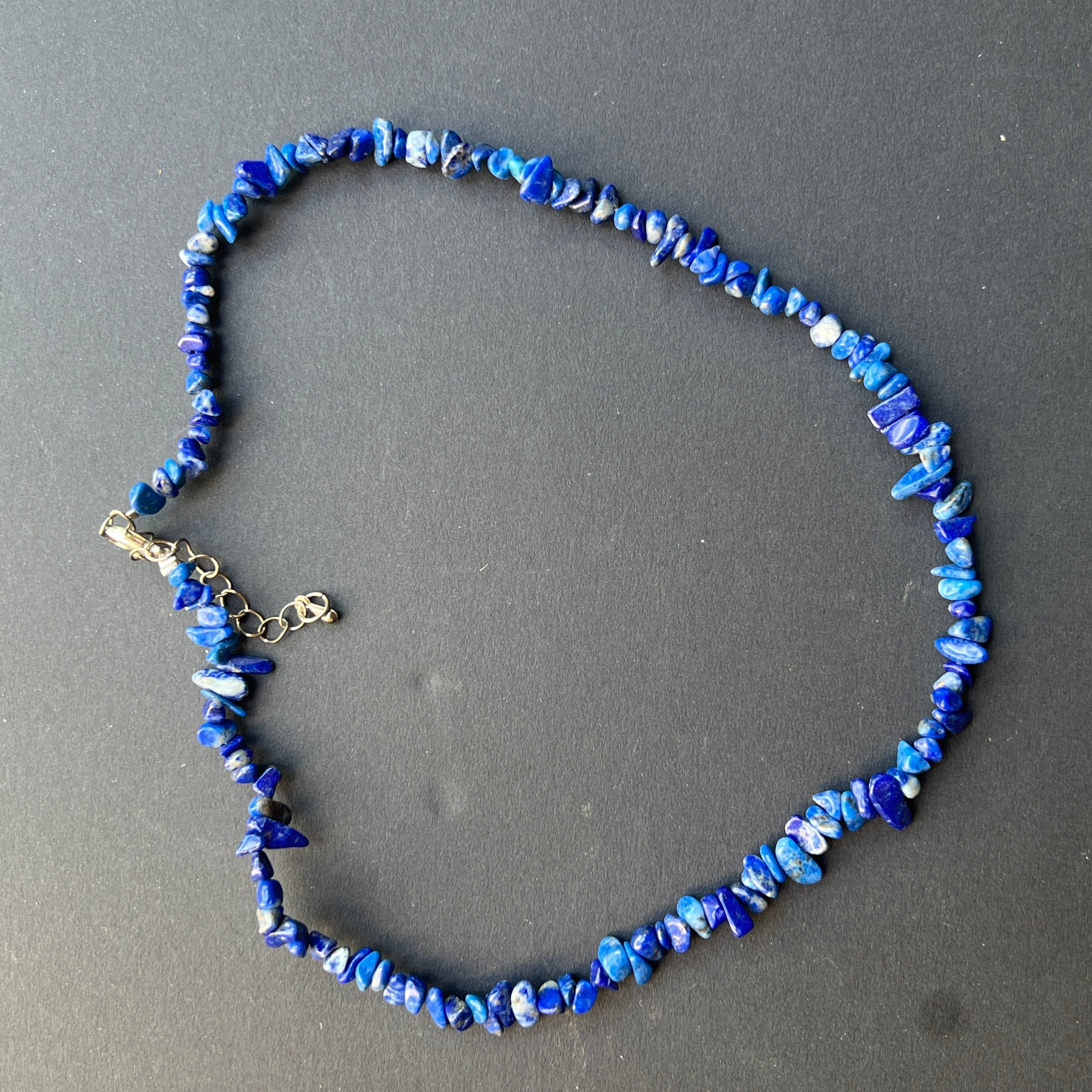 Enrich your wardrobe with this spectacular necklace made of natural lapis chips, mounted on a delicate 40 cm chain, completed with a 5 cm metal extension for perfect adjustment.