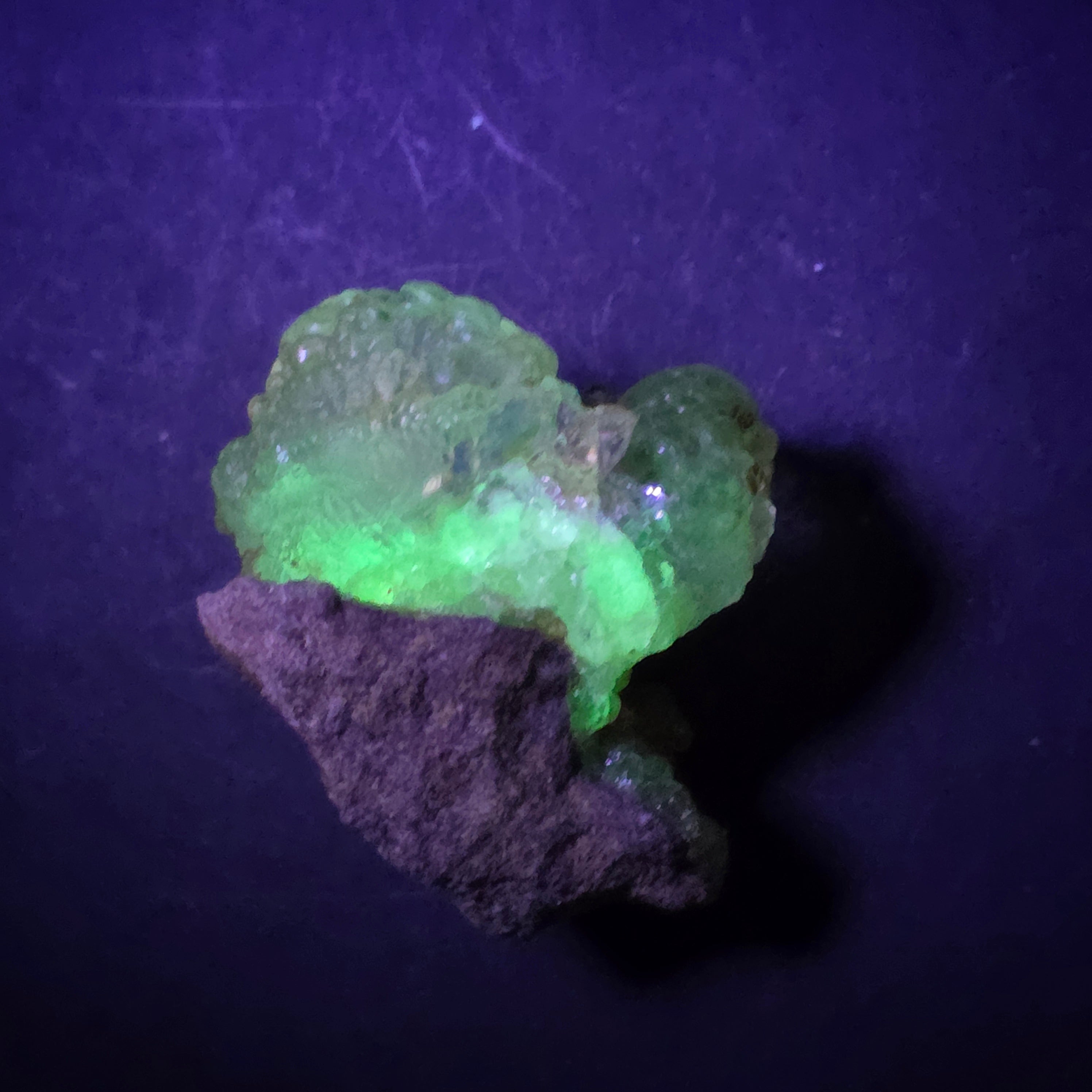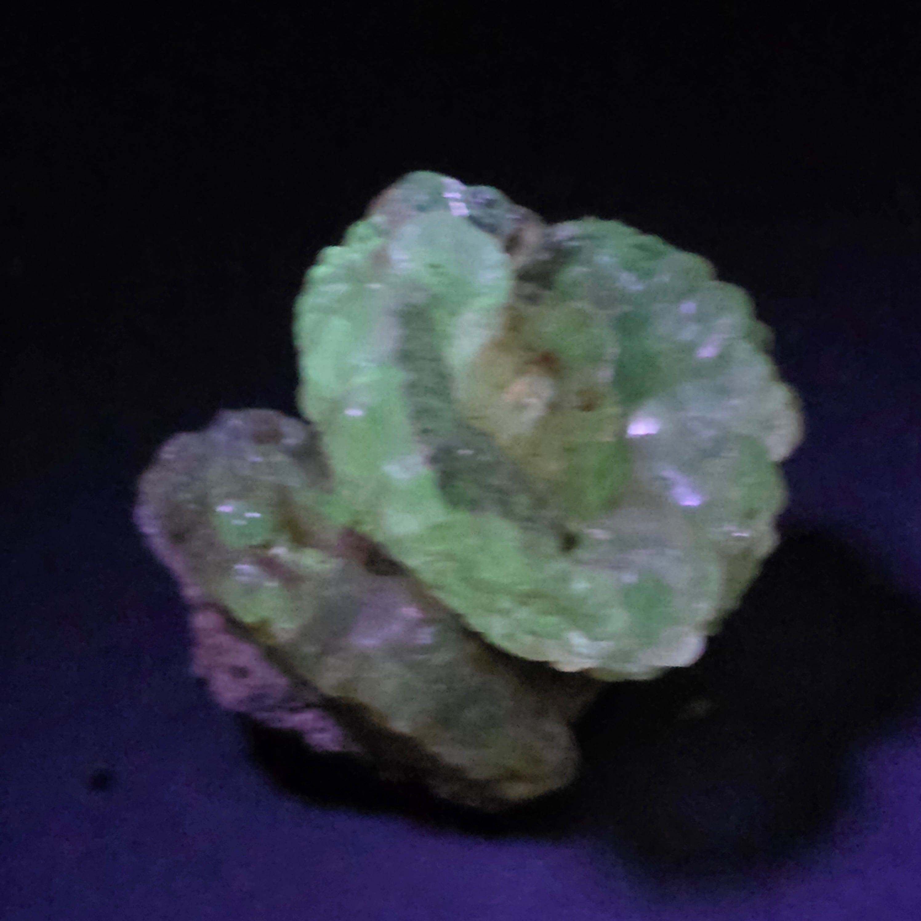 În lumină naturală, opalul hialit apare incolor până la alb-translucid, cu un aspect discret și elegant. Sub lumină ultravioletă însă, mineralul se transformă complet, emițând o strălucire verde neon, puternică și uniformă, efect care îl face extrem de căutat de colecționari. Această fluorescență se datorează urmelor naturale de uraniu din structura sa, prezente în cantități foarte mici și stabile.