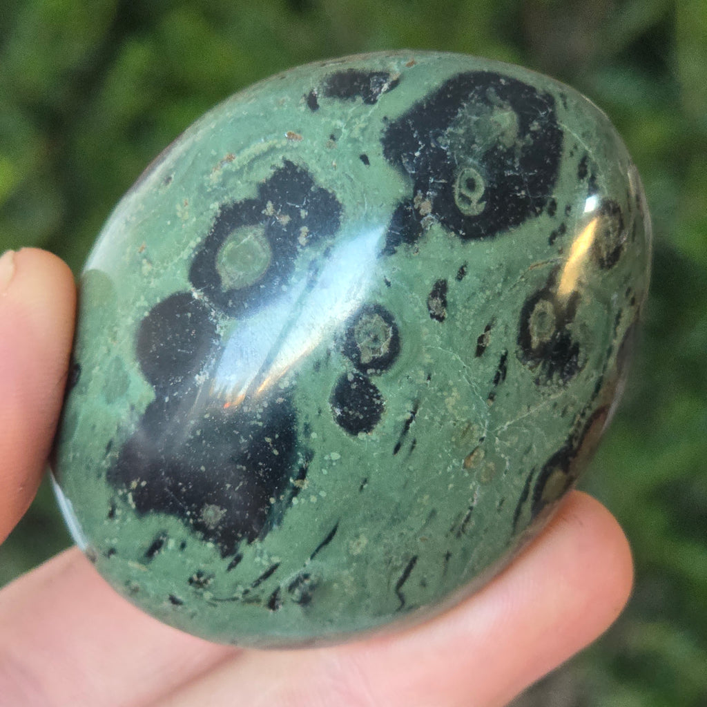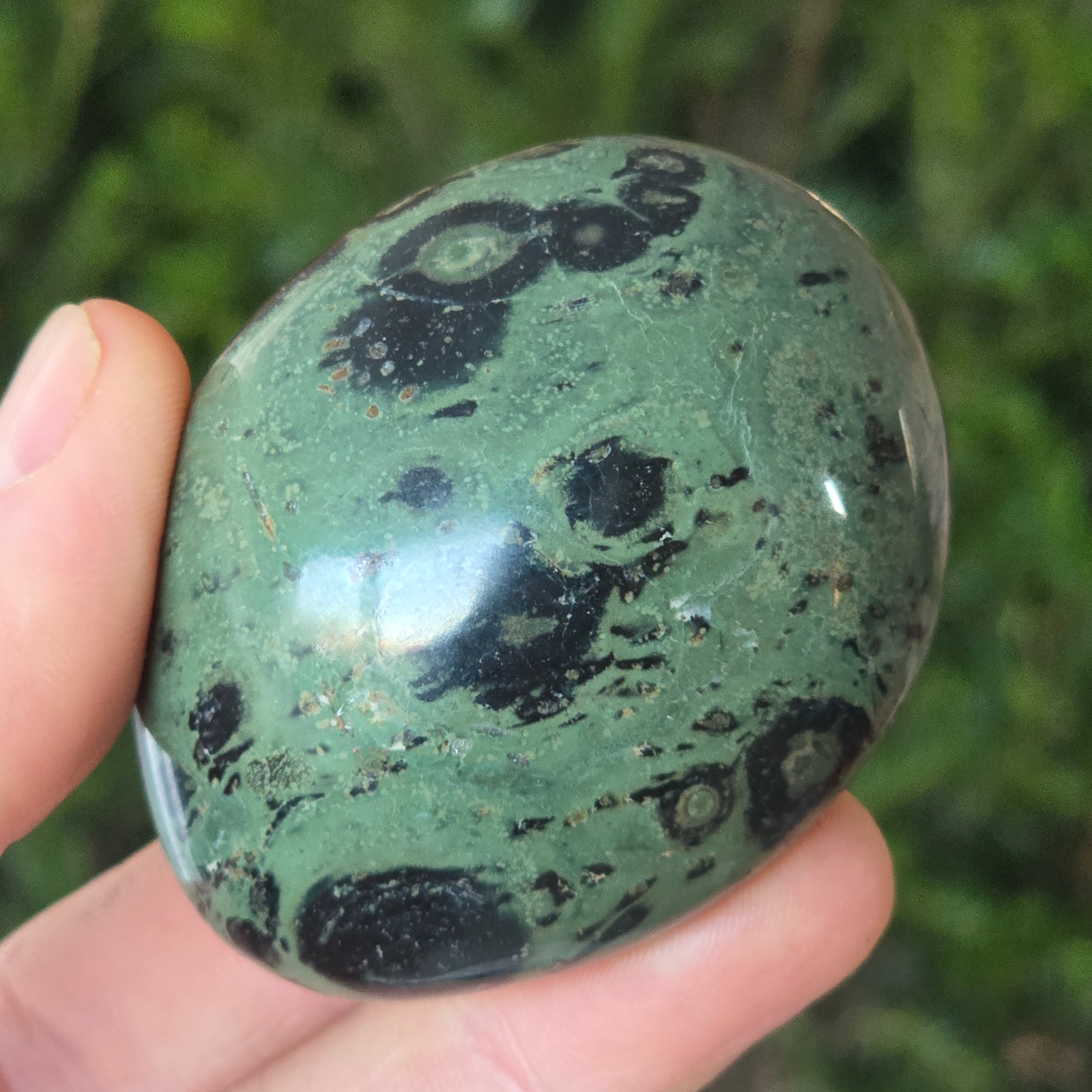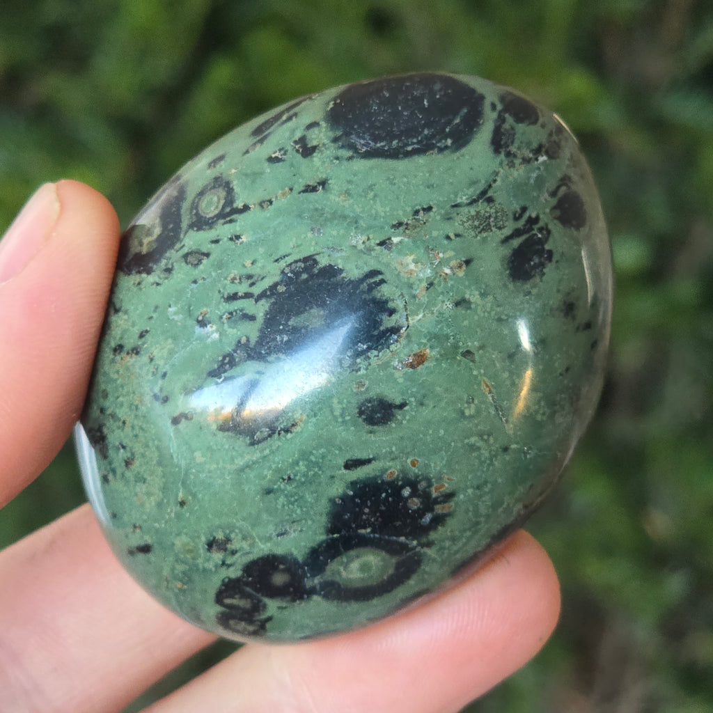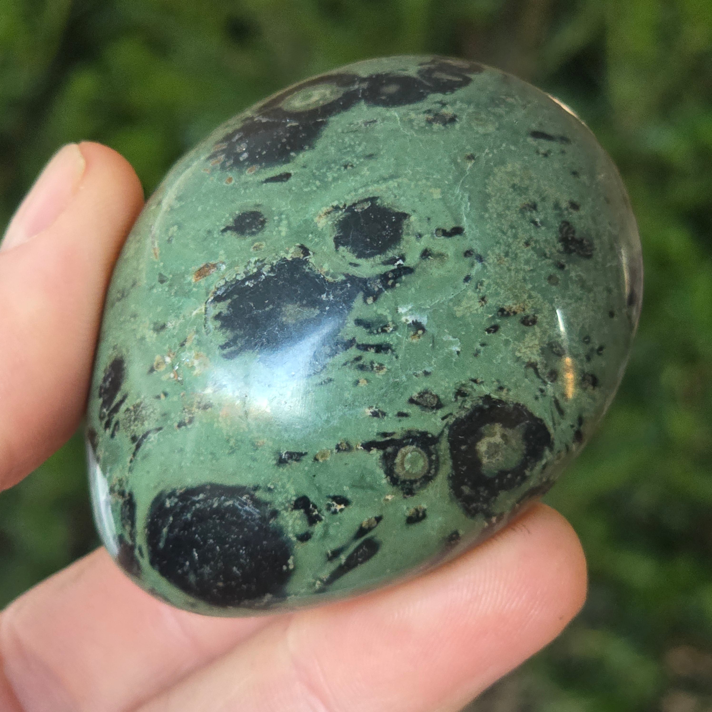 Kambaba Jasper, also known as Jasper Kambala, is a variety of jasper of volcanic origin. It is made up of a combination of green and black crystals, creating a beautiful and distinctive pattern. It is named after the Kambaba region of Madagascar, where it is commonly found.
