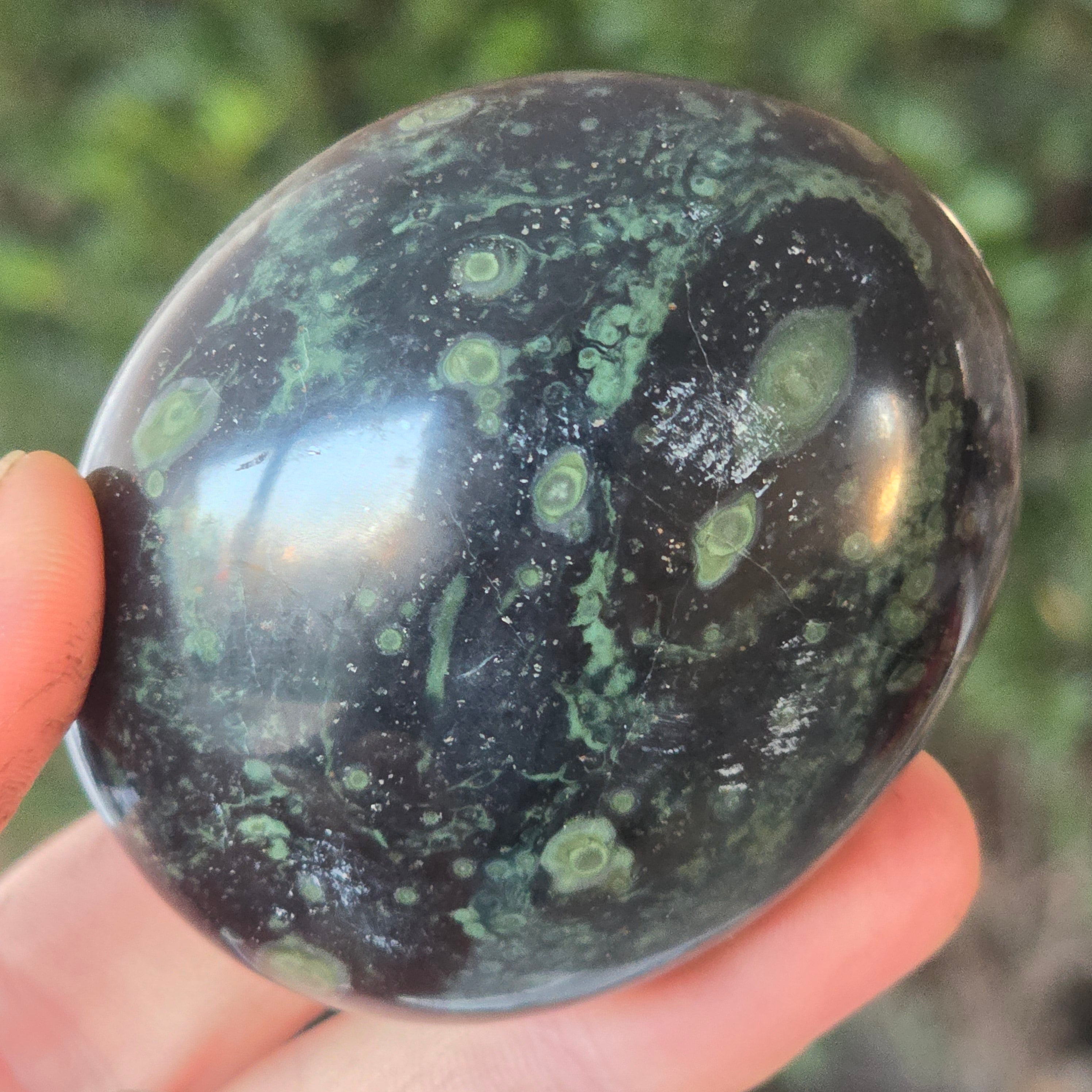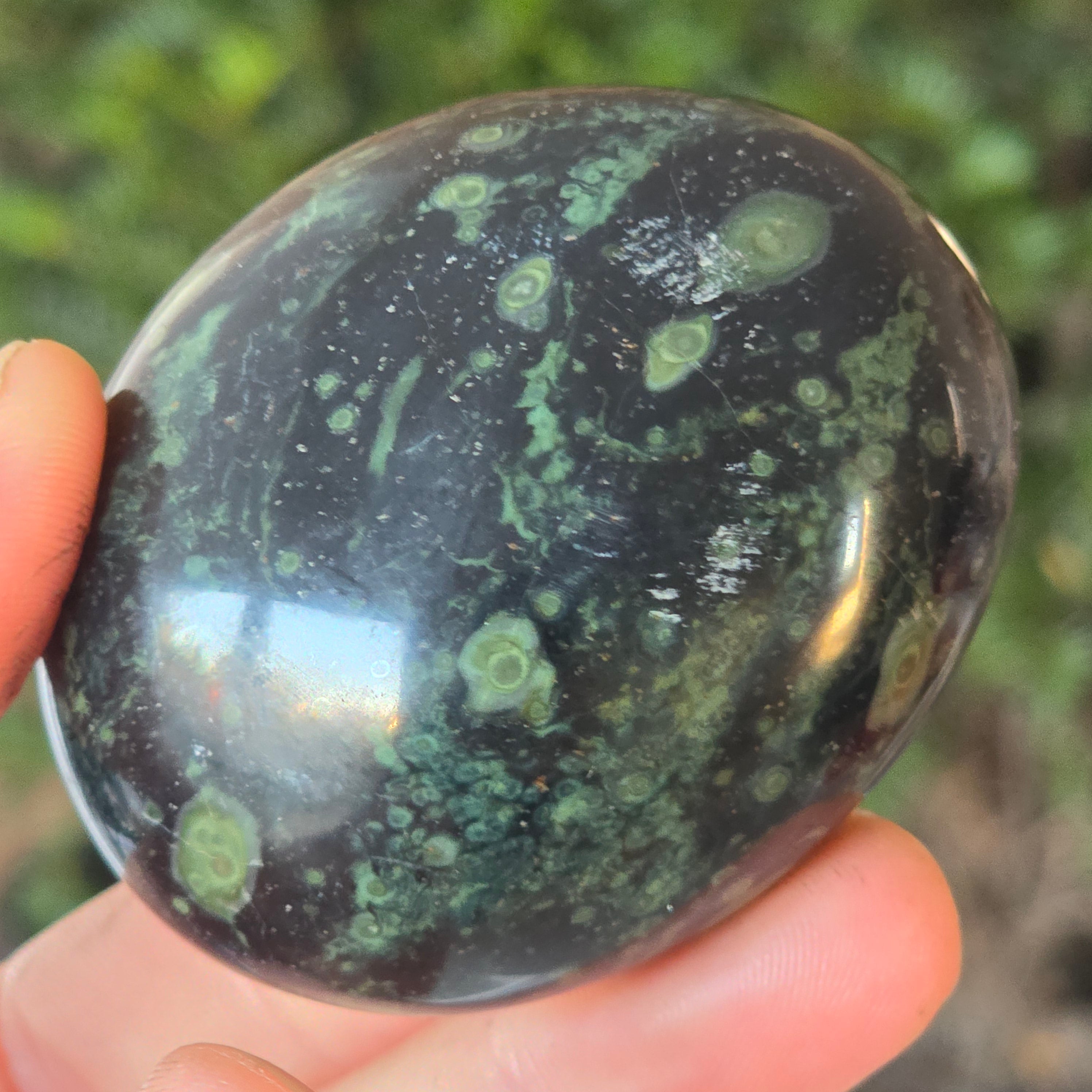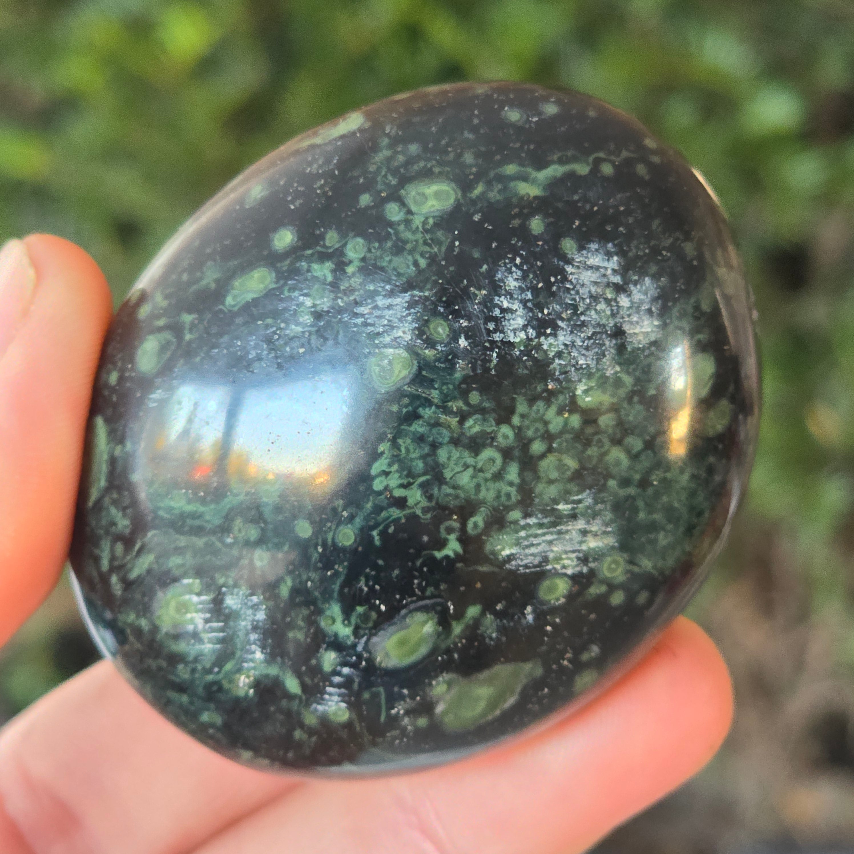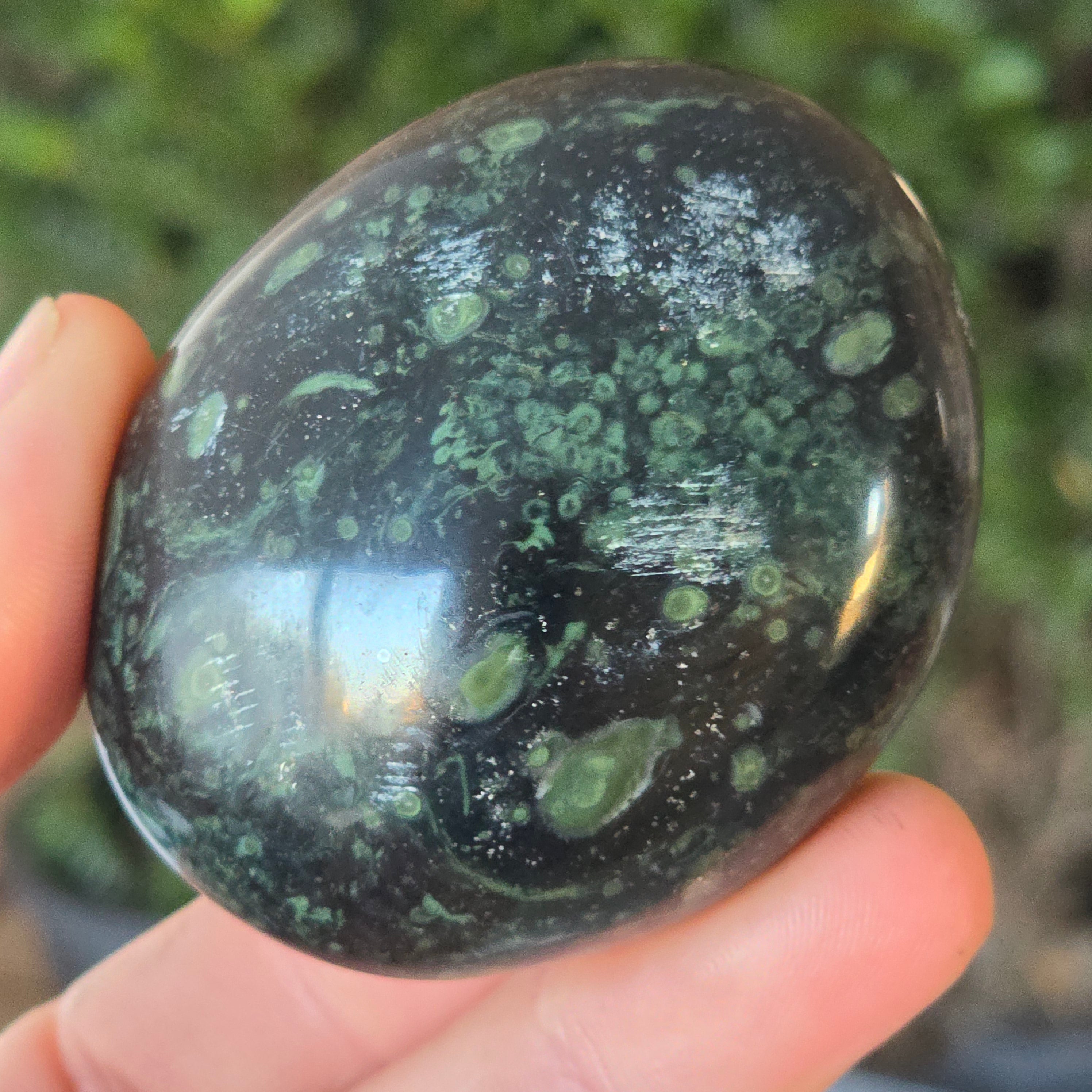 Kambaba Jasper, also known as Jasper Kambala, is a variety of jasper of volcanic origin. It is made up of a combination of green and black crystals, creating a beautiful and distinctive pattern. It is named after the Kambaba region of Madagascar, where it is commonly found.