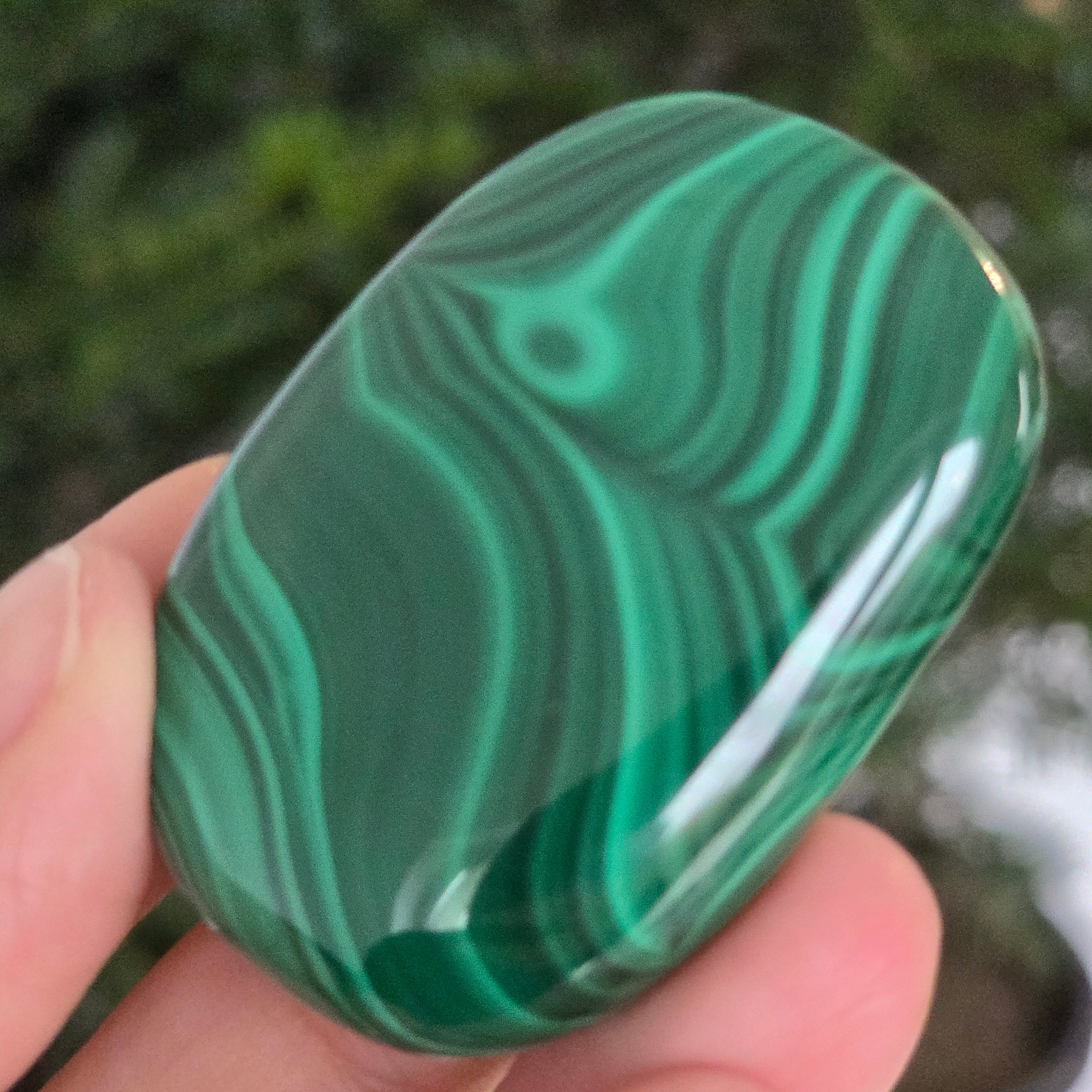 Un palmstone care pare să respire cu energia Pământului viu. Această piesă unicat din malachit natural, dezvăluie ondulații hipnotice de verde intens și smarald, traversate de inele și benzi concentrice ce par sculptate de însăși natura. Textura netedă, perfect șlefuită, face ca piatra să se așeze plăcut în palmă, emanând o vibrație caldă și protectoare.